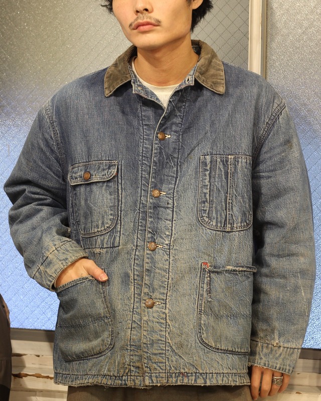size L~XL程度 生産国 USA 素材 shell:cotton 100% lining:acrylic 85% wool 15% 肩幅 51cm 袖丈 60cm 身幅 63cm 着丈 74cm 状態 褪色やダメージがあるアイテムになります。 説明文でもお話しさせてもらいましたが、雰囲気あるビンテージワークデニムとしてお楽しみ頂けると幸いです。 詳細は、画像をご覧下さい。 ※ダメージ気になる方は、ご購入をお控え下さい。 ※写真と実際の色味が若干異なる場合がございます。 事前にご了承ください