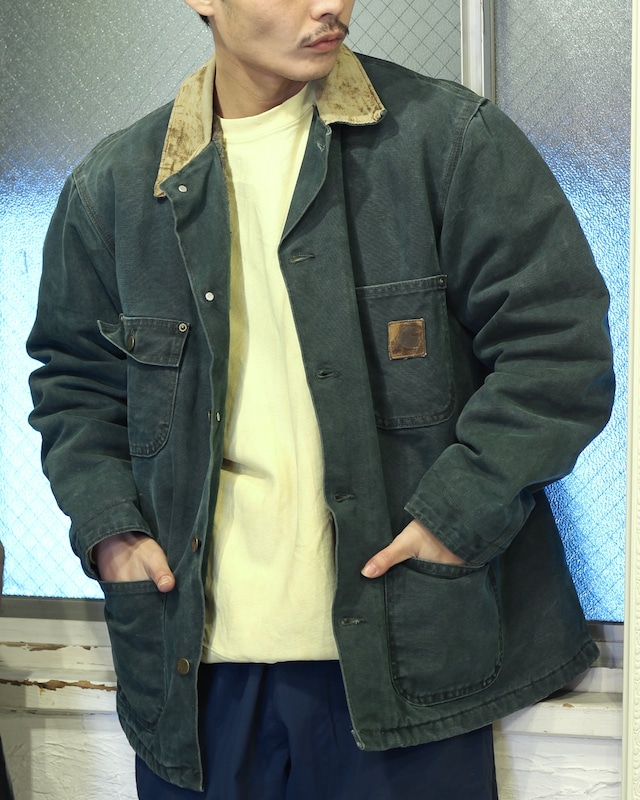 しっかりとオールド個体のカーハートのチョアジャケット 良い発色のグリーンボディにレザー切り替えの襟、気になる短丈のカバーオールアイテム 押さえておきたい一着です。 size L程度 生産国 おそらくUSA 素材 cotton 100% (製品表記タグ欠損アイテムです) 肩幅 51cm 袖丈 60cm 身幅 63cm 着丈 74cm 状態 多少着用感はございますが、目立ったダメージはなく状態は良好です。 ※ダメージ気になる方は、ご購入をお控え下さい。 ※写真と実際の色味が若干異なる場合がございます。 事前にご了承ください
