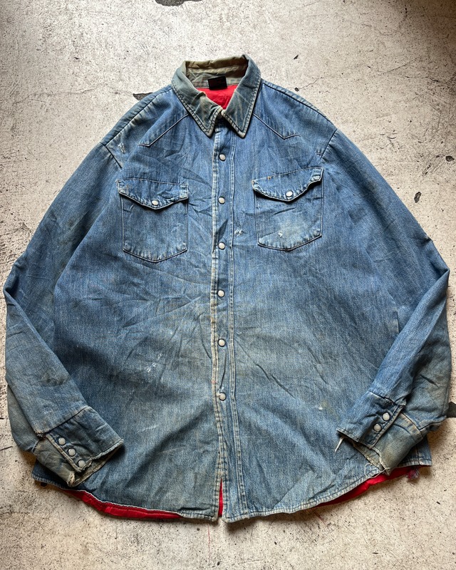 赤のキルティングが要所要所でチラ見えする程よいアクセントにくたびれたデニムの雰囲気もグランジ感溢れる抜群なウエスタンシャツになります。 春先目線でもアメカジ好きとしてもたまらない一着です。 size L 生産国 USA 素材 cotton 100% 肩幅 52cm 袖丈 63cm 身幅 64cm 着丈 75cm 状態 よいグランジ感を楽しめるハイダメージな一着です。 古着らしい表情の一着ではございますが、詳細を画像でご確認した上でご購入をご検討下さい。 ※ダメージ気になる方は、ご購入をお控え下さい。 ※写真と実際の色味が若干異なる場合がございます。 事前にご了承ください