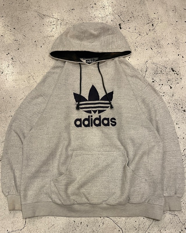 インサイドアウトのデザインによりパイル地の様な綾織生地が独特な素材感の古いアディダスのフーディパーカー デザイン性抜群のoldスポーツアイテム隅に置かない一着です。 size L 生産国 Thailand 素材 cotton 93% polyester 7% 肩幅 58cm 袖丈 64cm 身幅 61cm 着丈 63cm 状態 フード裏に激しい褪色などがございます。 古着らしい表情の一着ではございますが、詳細を画像でご確認した上でご購入をご検討下さい。 ※ダメージ気になる方は、ご購入をお控え下さい。 ※写真と実際の色味が若干異なる場合がございます。 事前にご了承ください