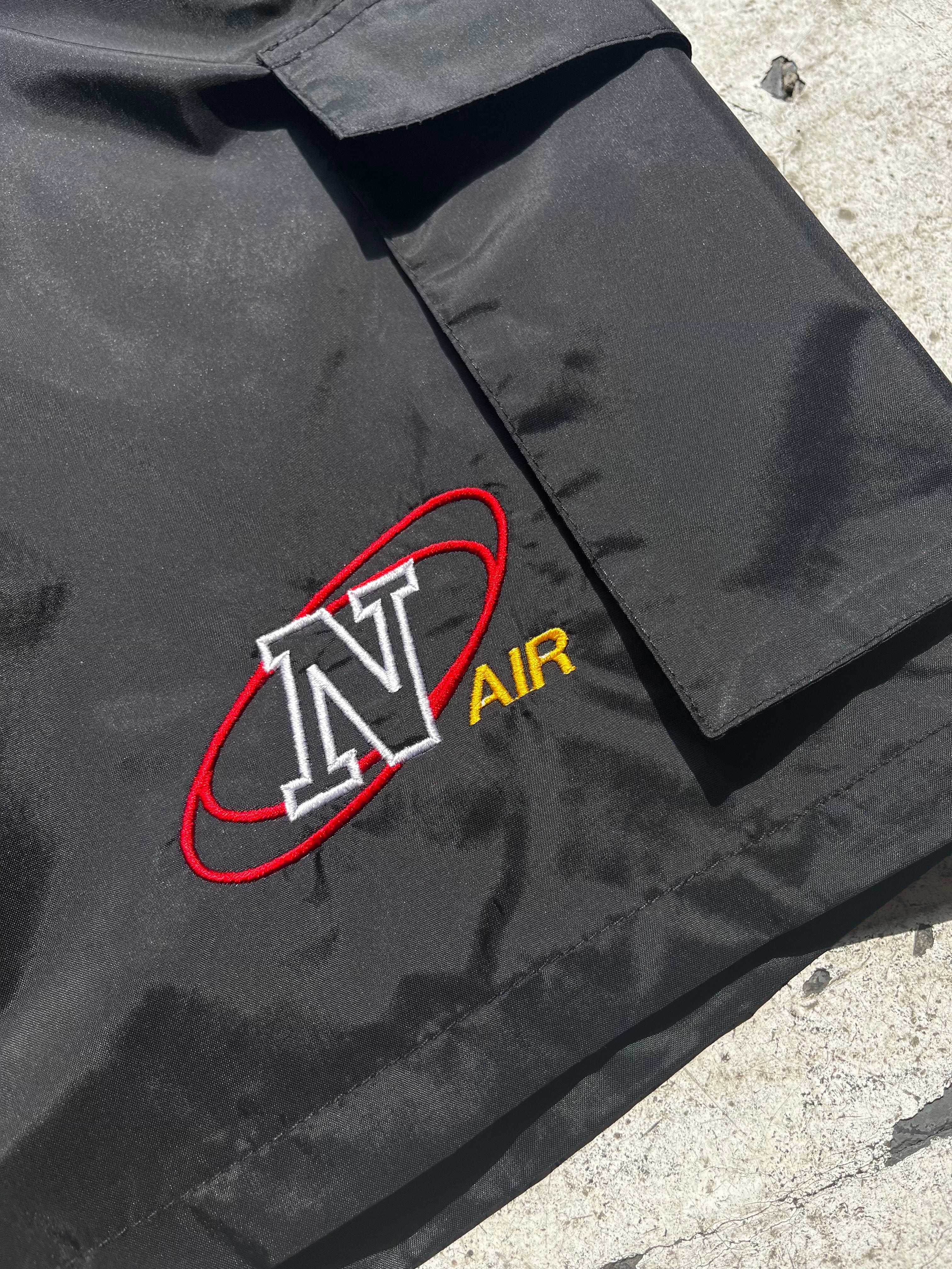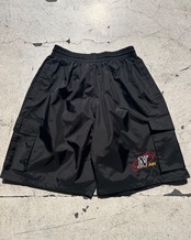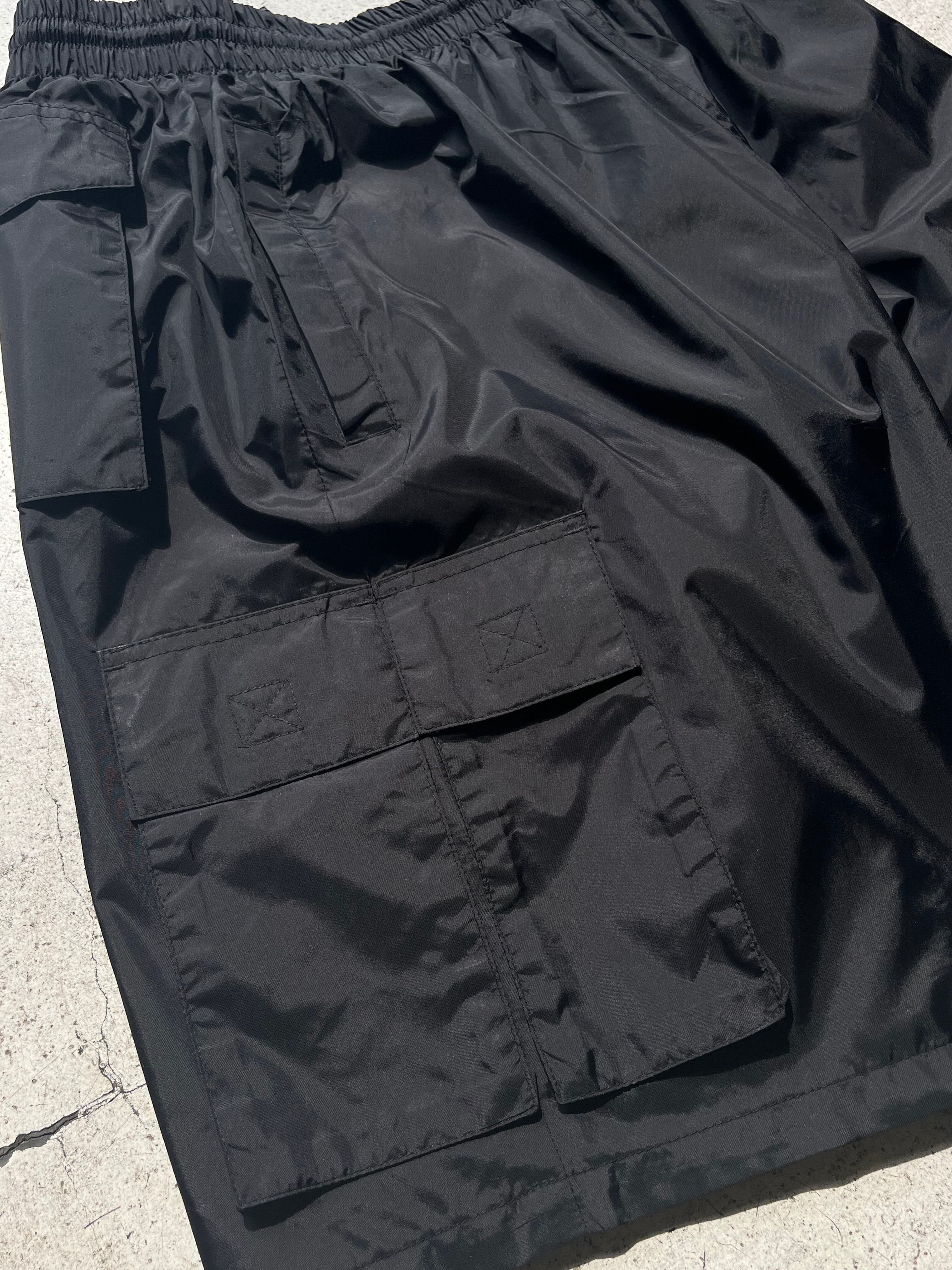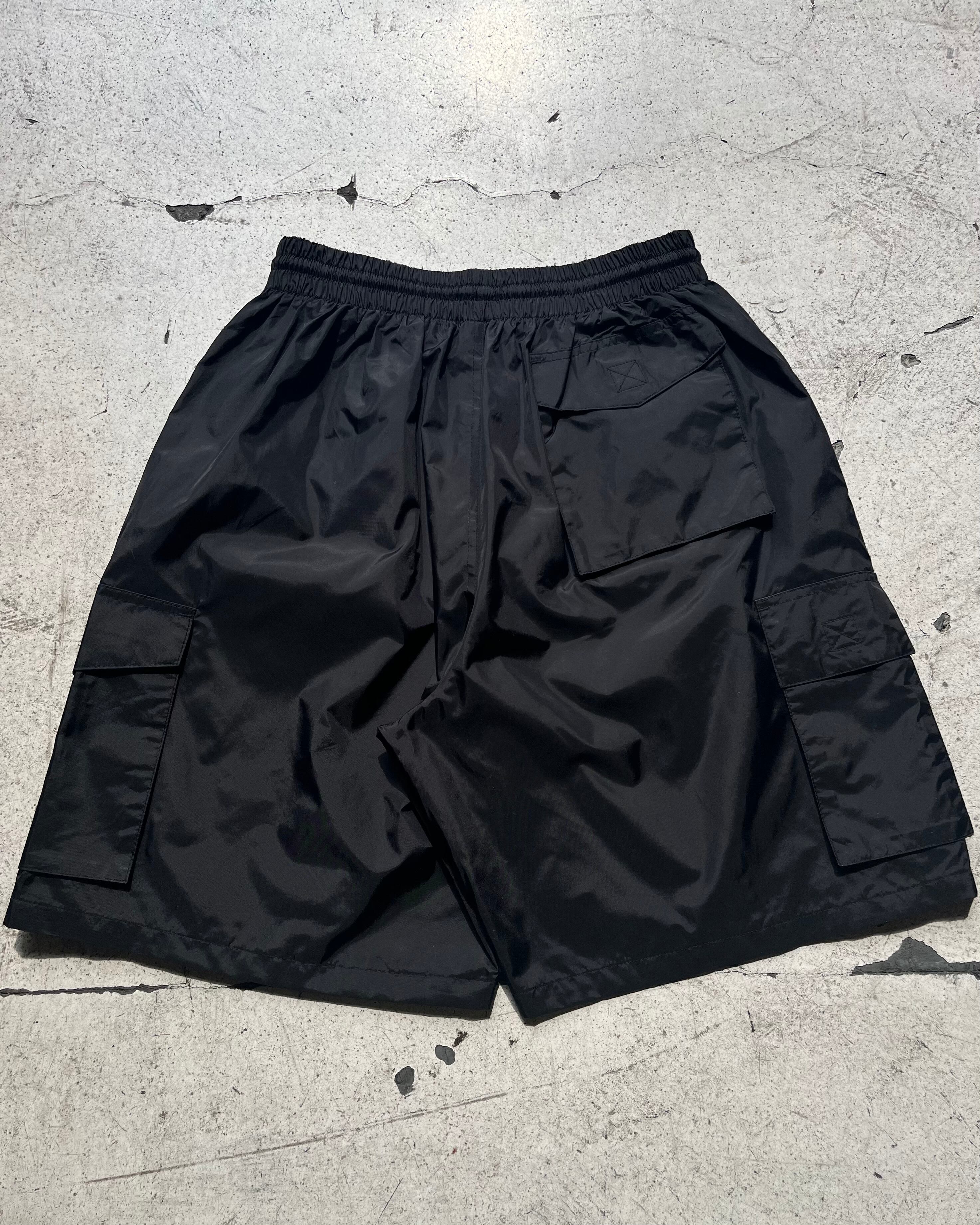 存在感ある刺繍デザイン入りの黒のナイロンカーゴショーツ