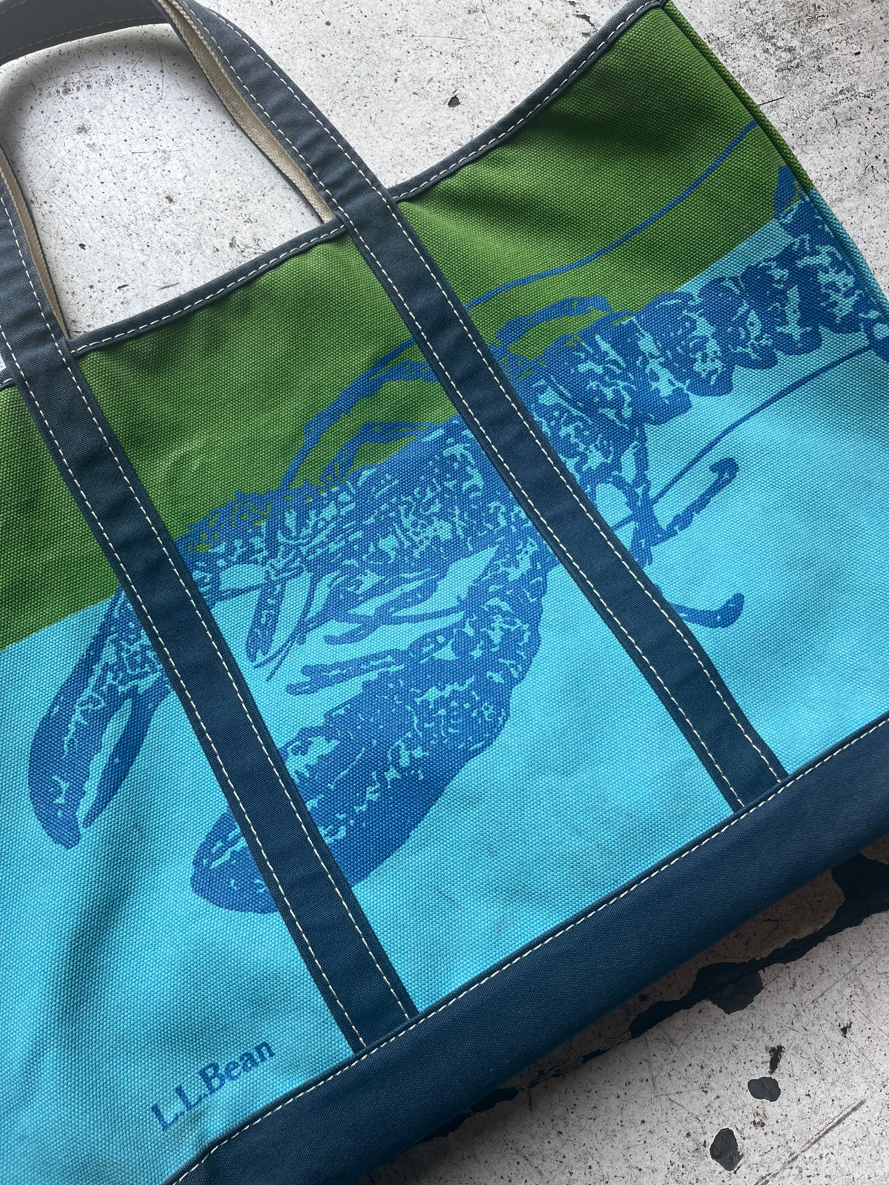 黄緑と水色のバイカラーに大きなロブスターがプリントされたBEANトート