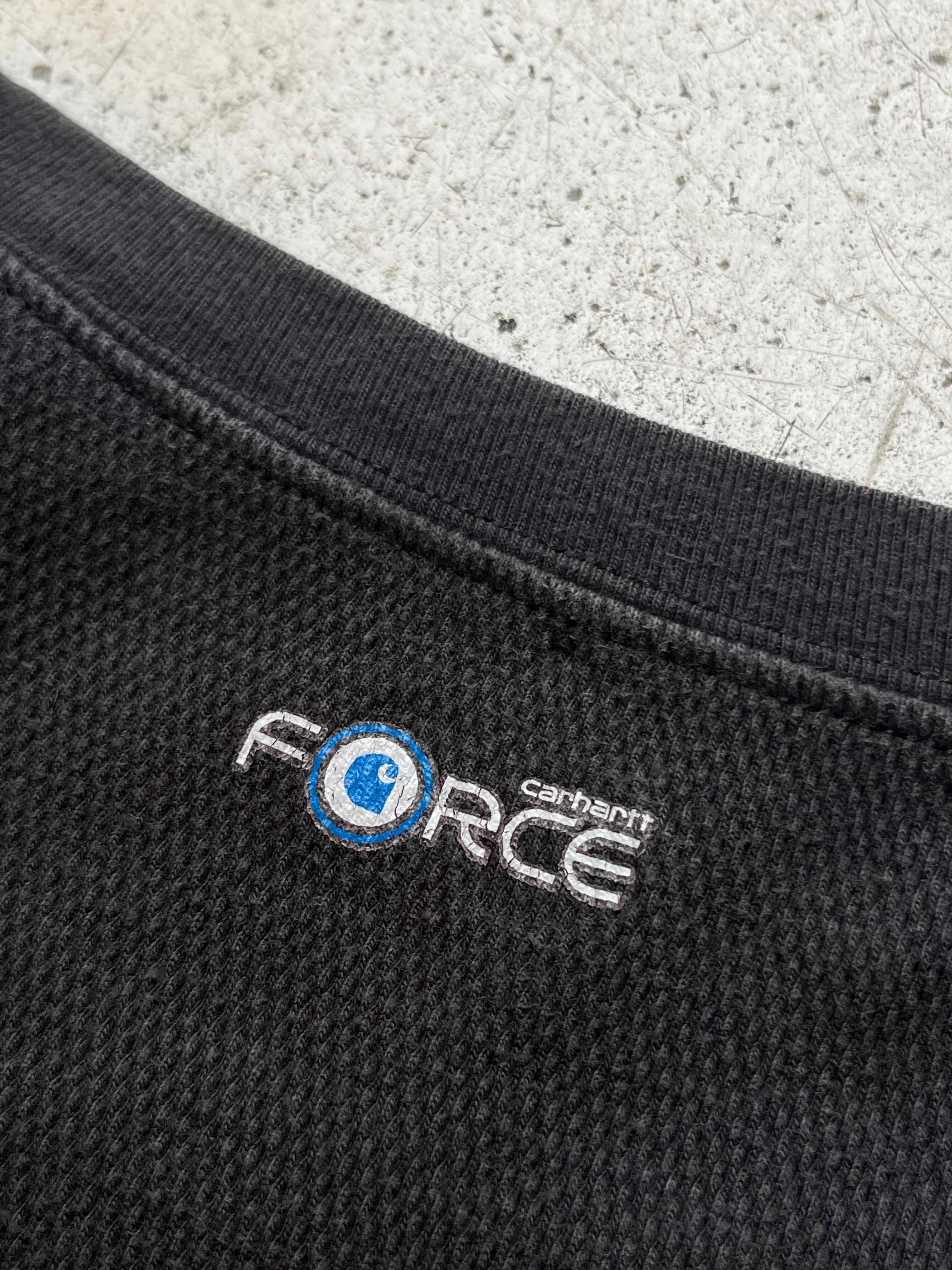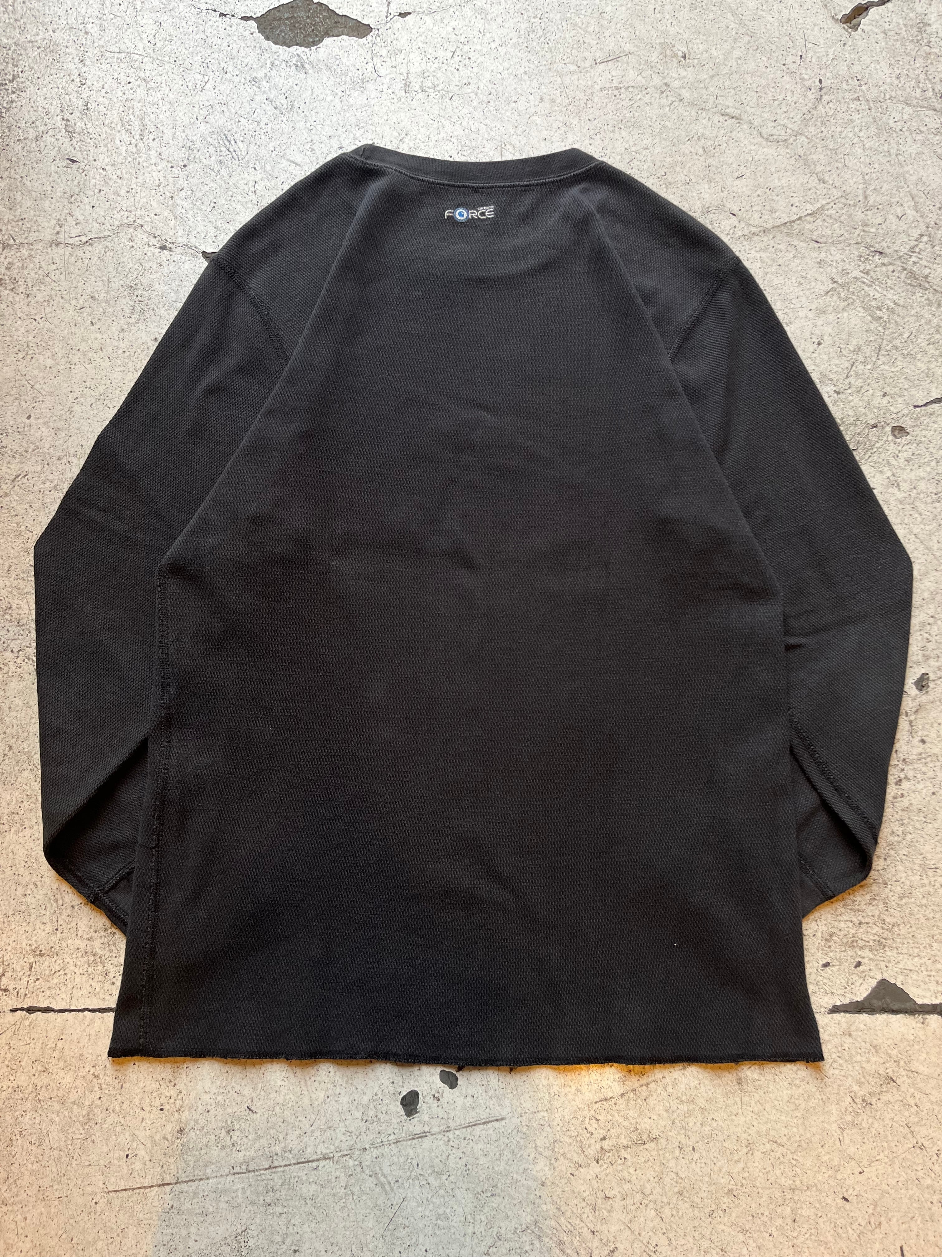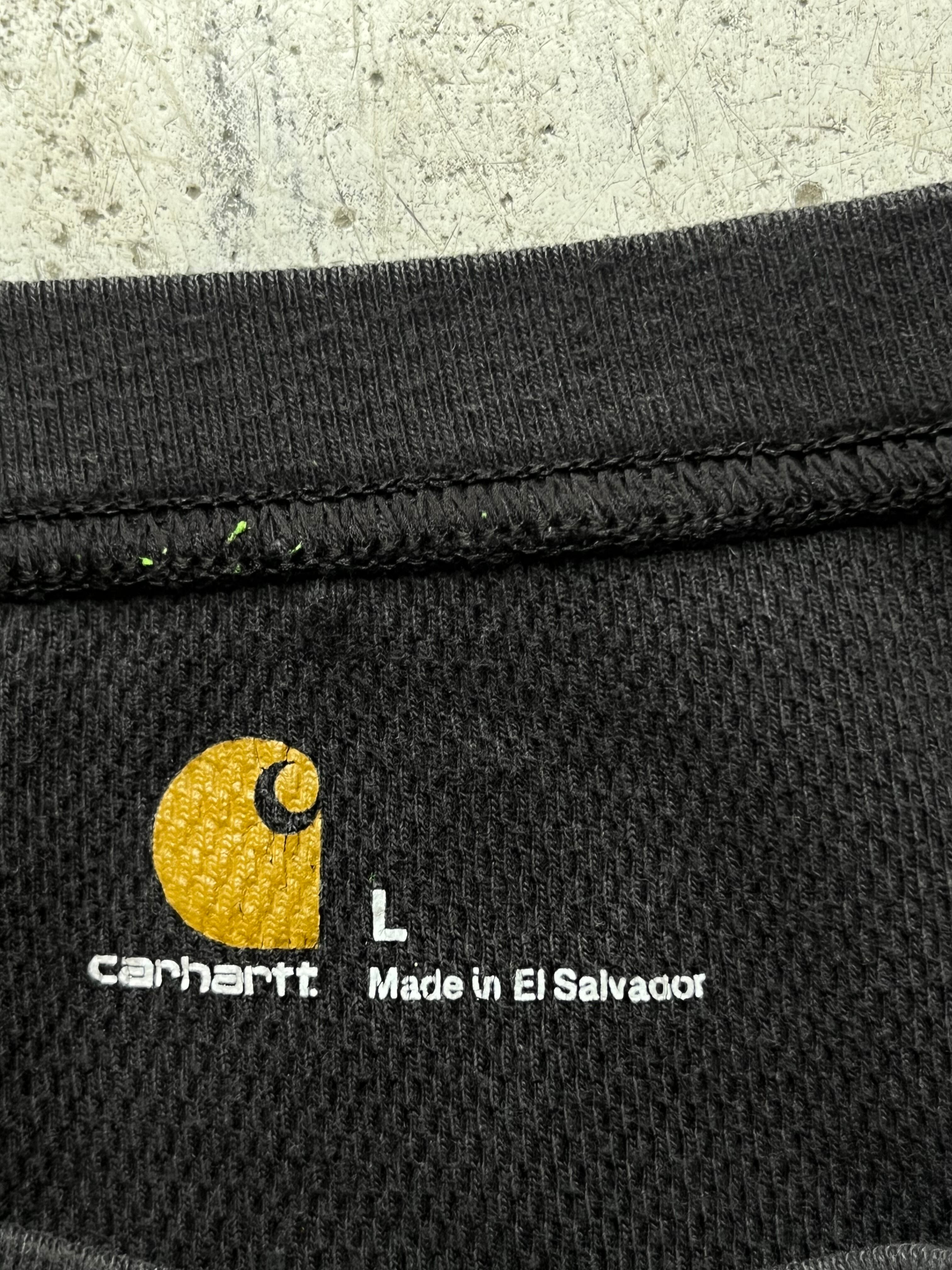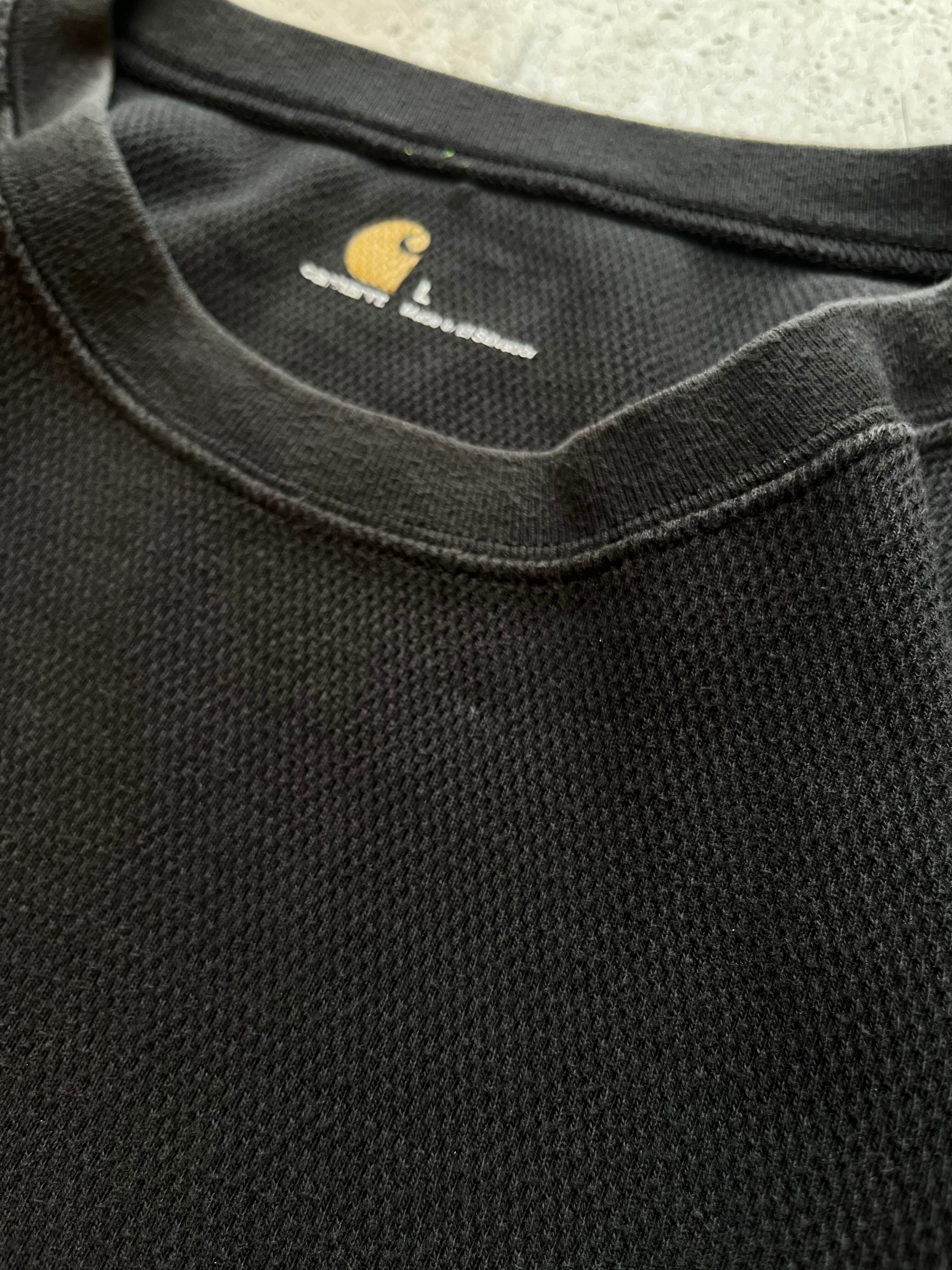 裾にタグのワンポイントのつく黒のカーハートのサーマルニット秋冬時期のレイヤードに良いアクセントになること間違いなしな一着です。
