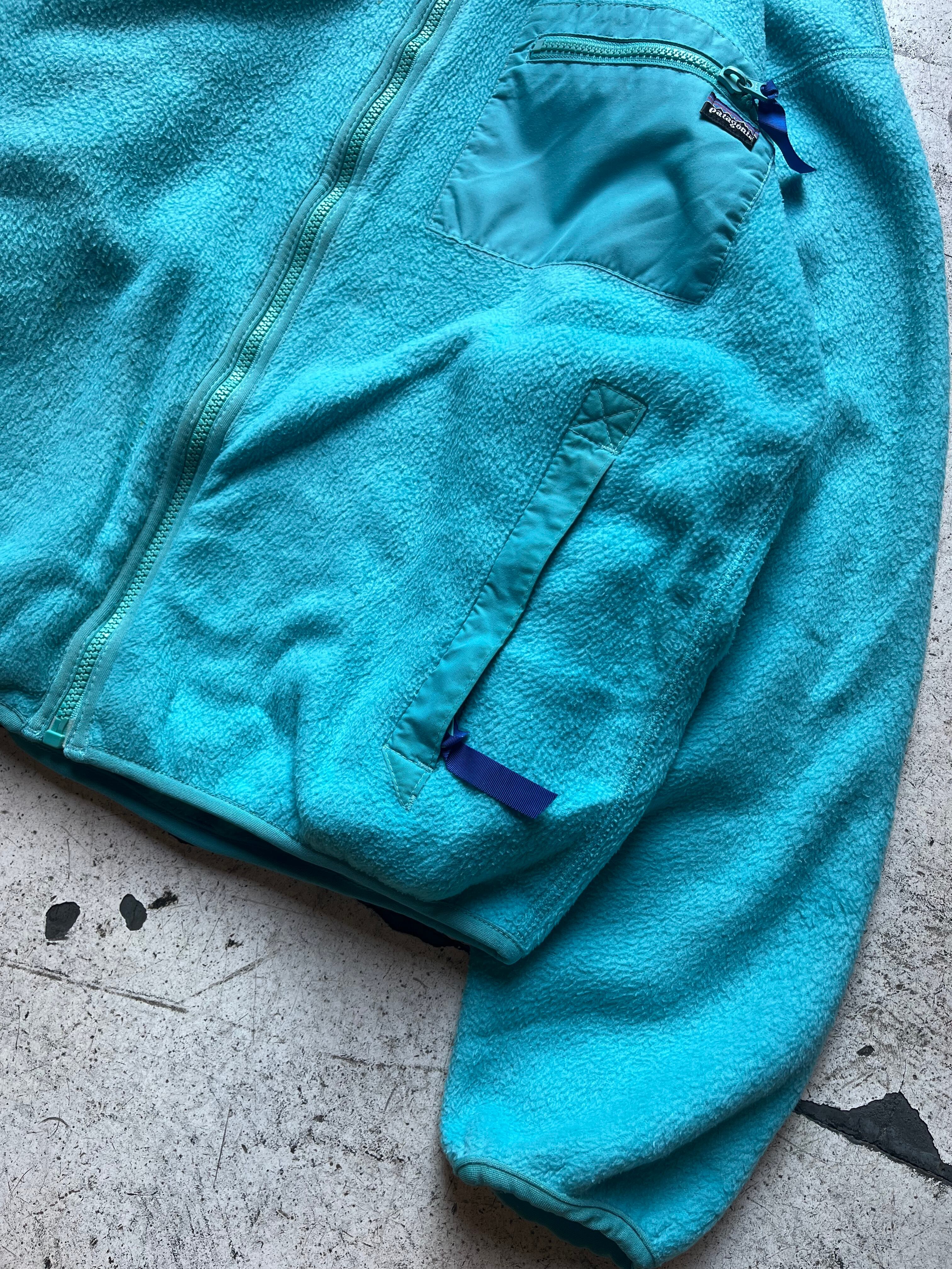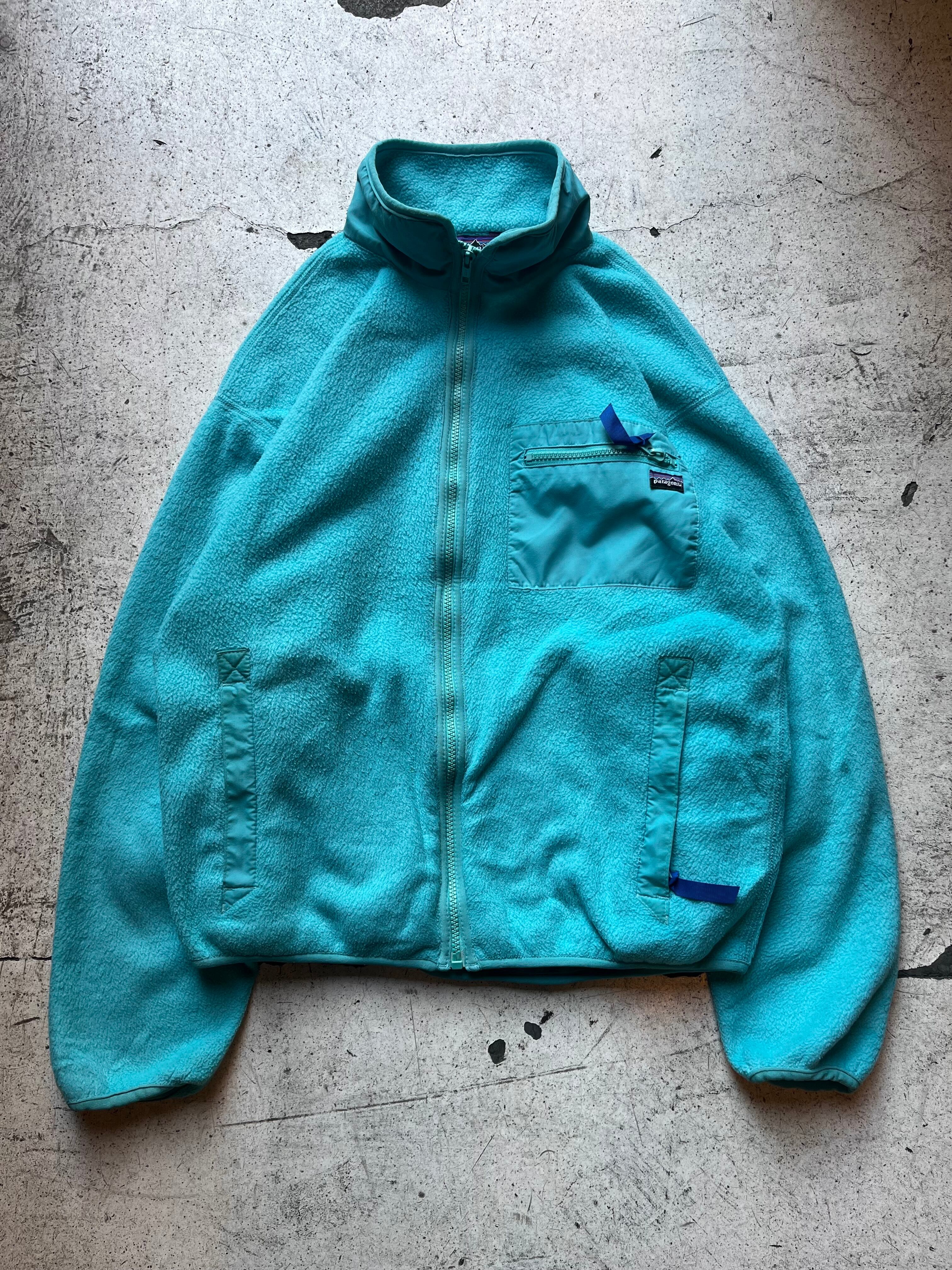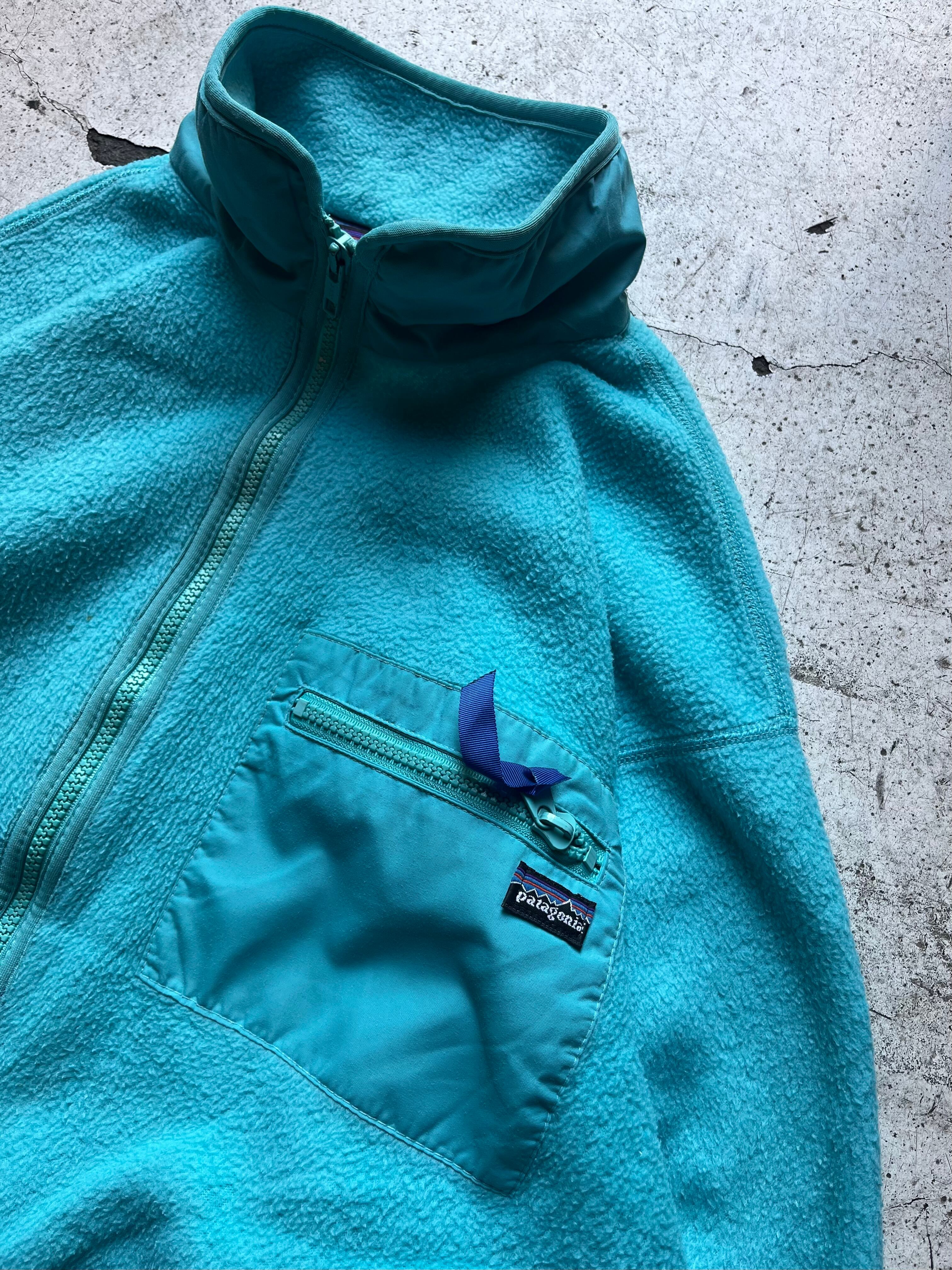 古いパタゴニアらしい澄んだ水色の良い色味のフルジップフリースジャケット