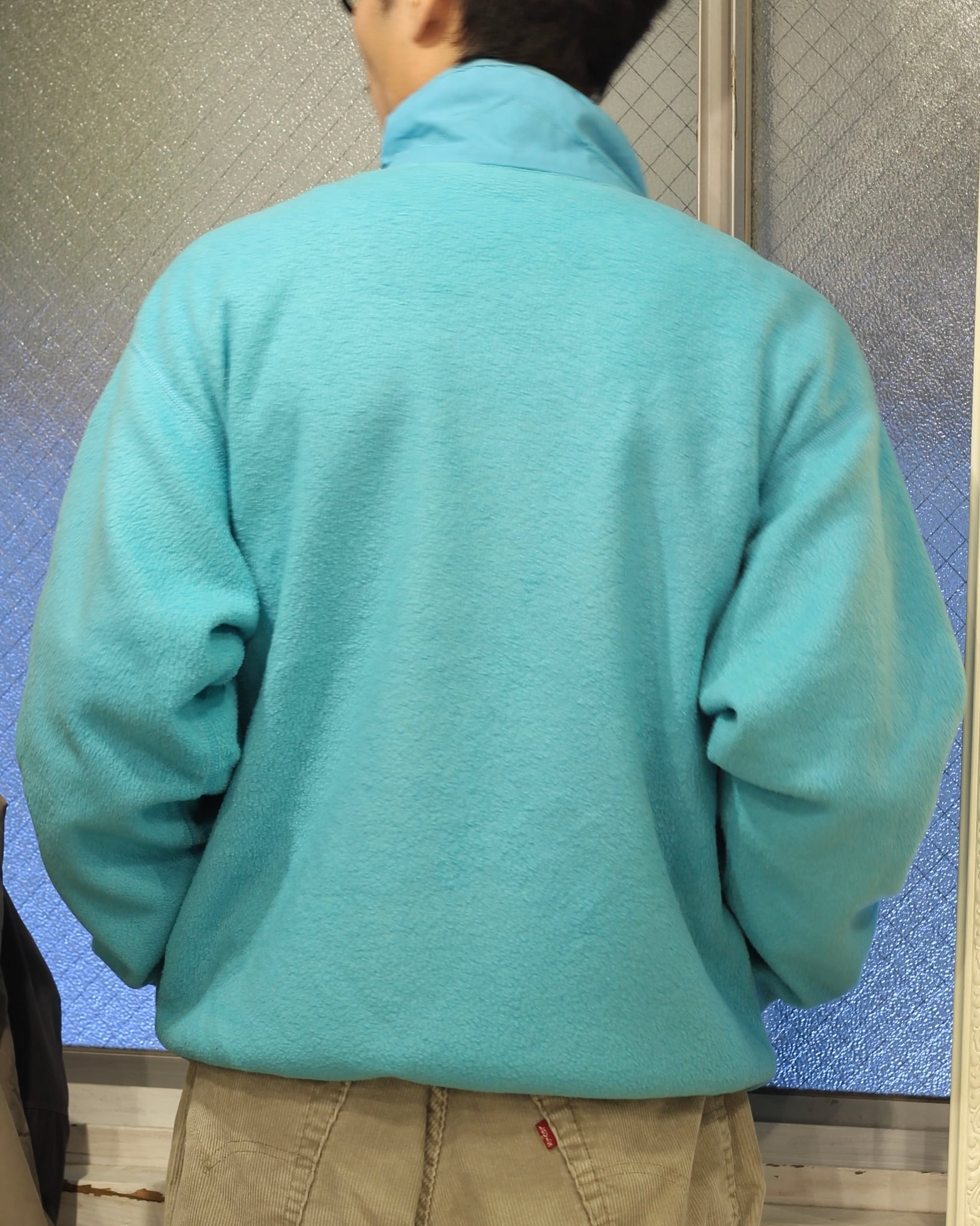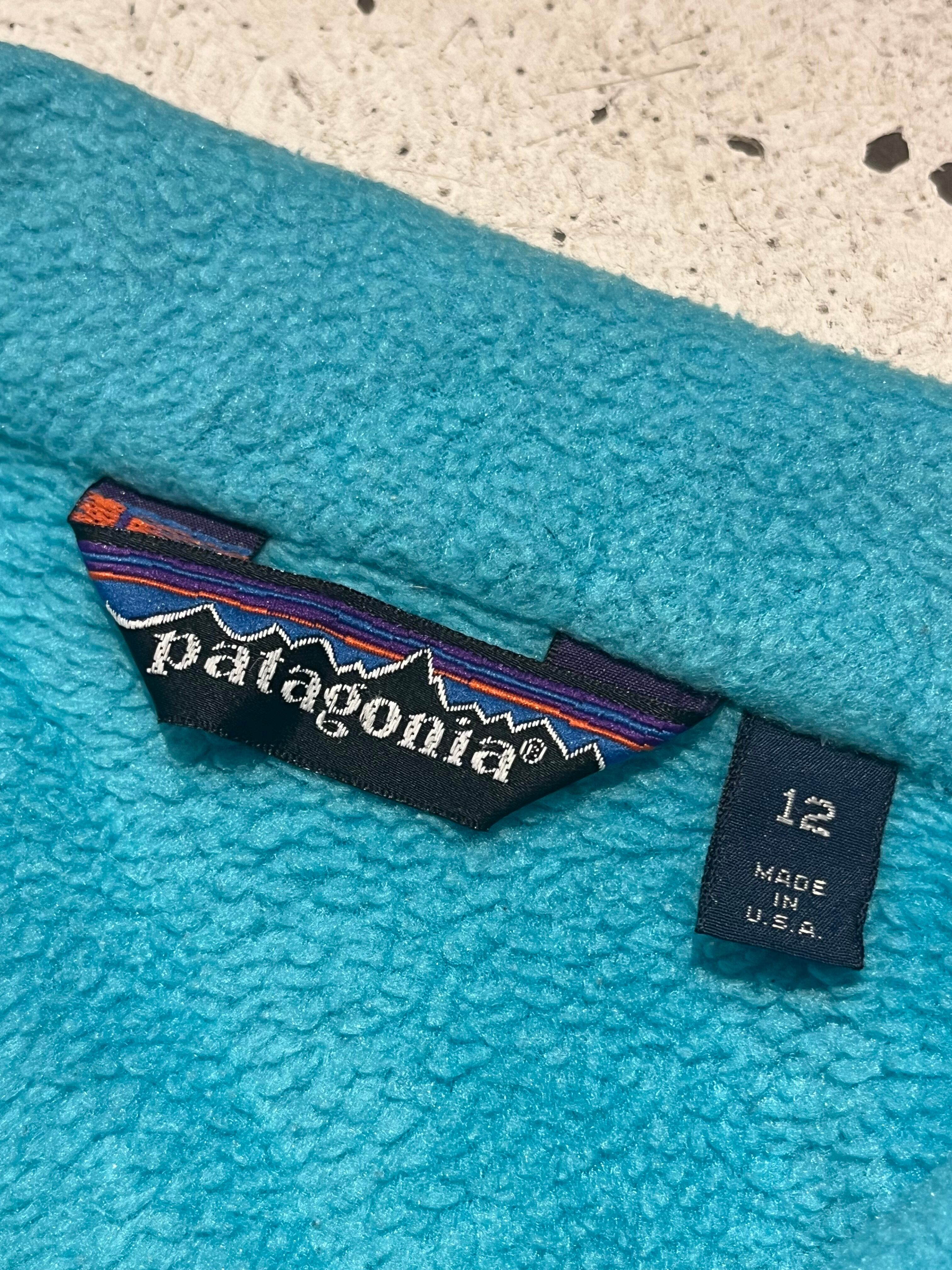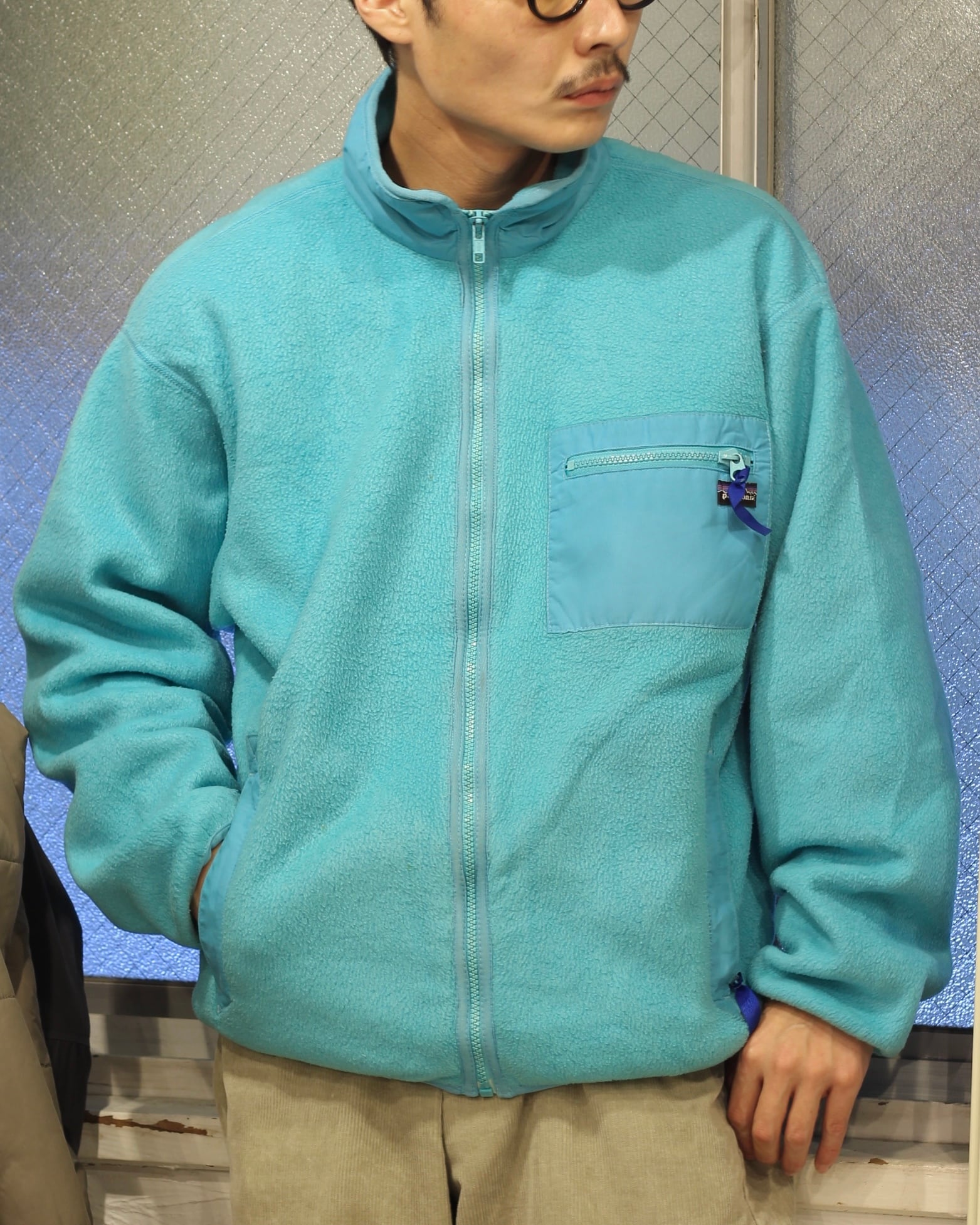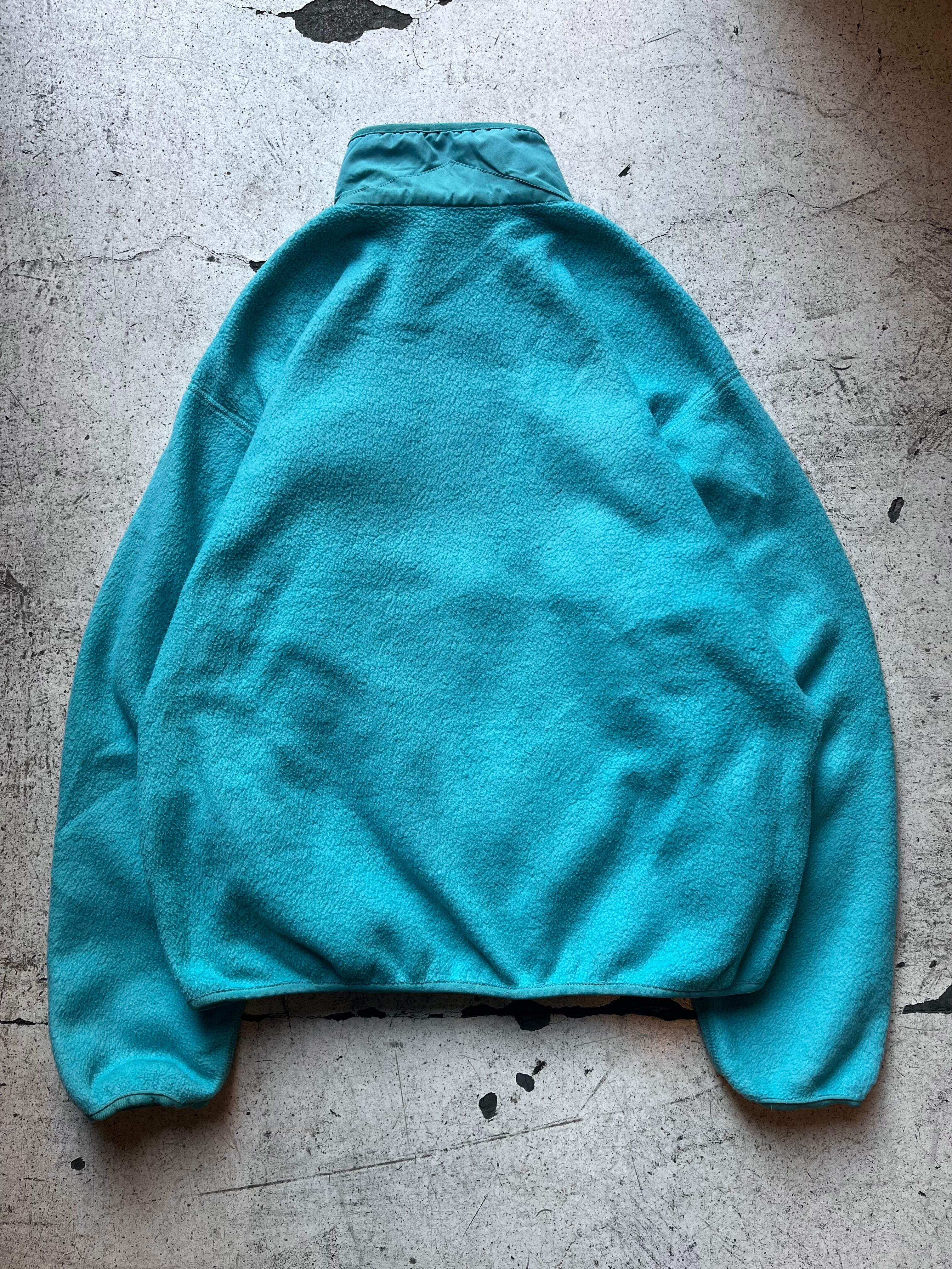 古いパタゴニアらしい澄んだ水色の良い色味のフルジップフリースジャケット