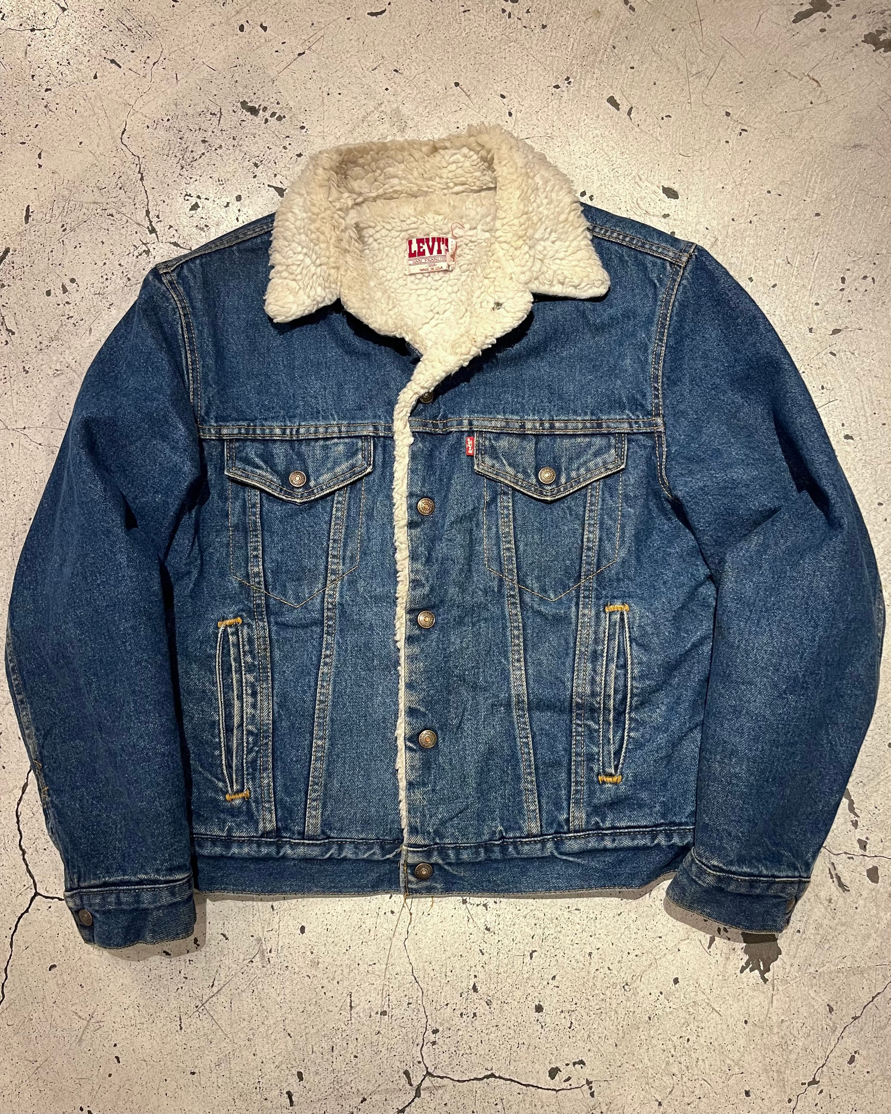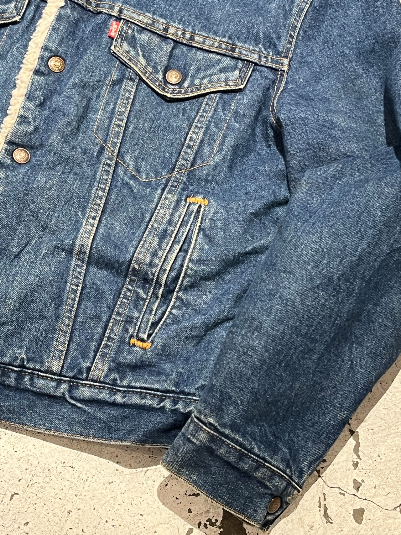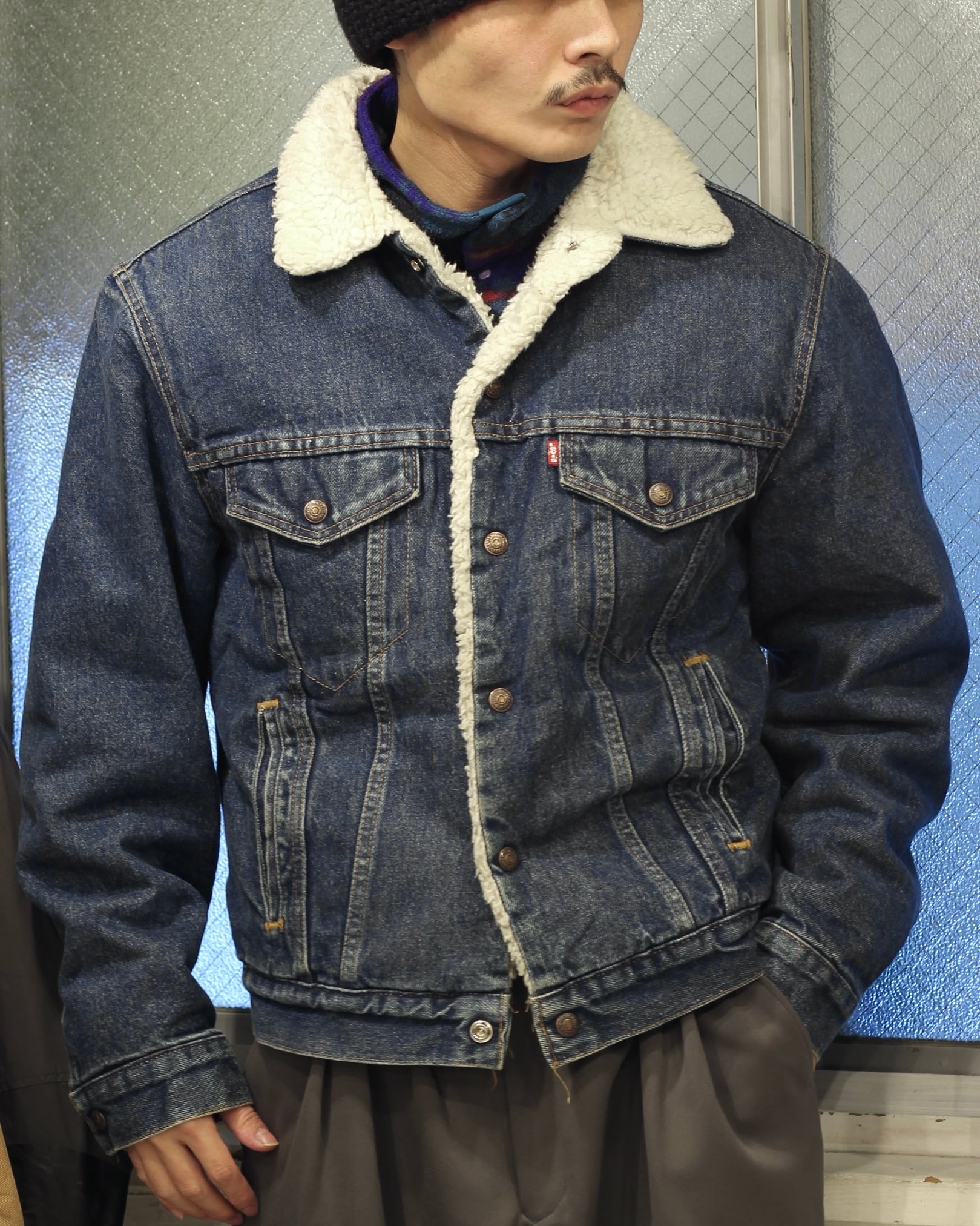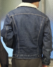 色残りのある濃紺のデニム生地とインナーにボアが取り付けられた冬仕様のトラッカージャケット