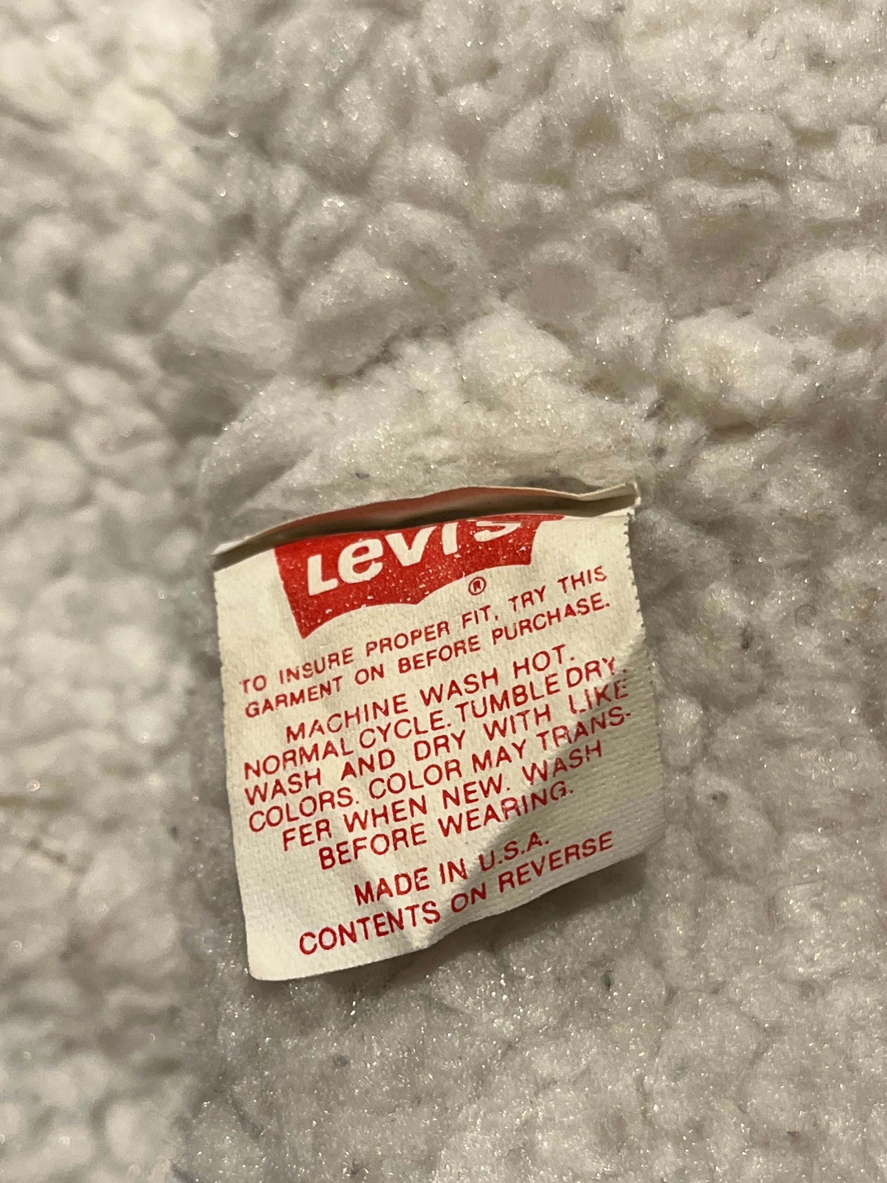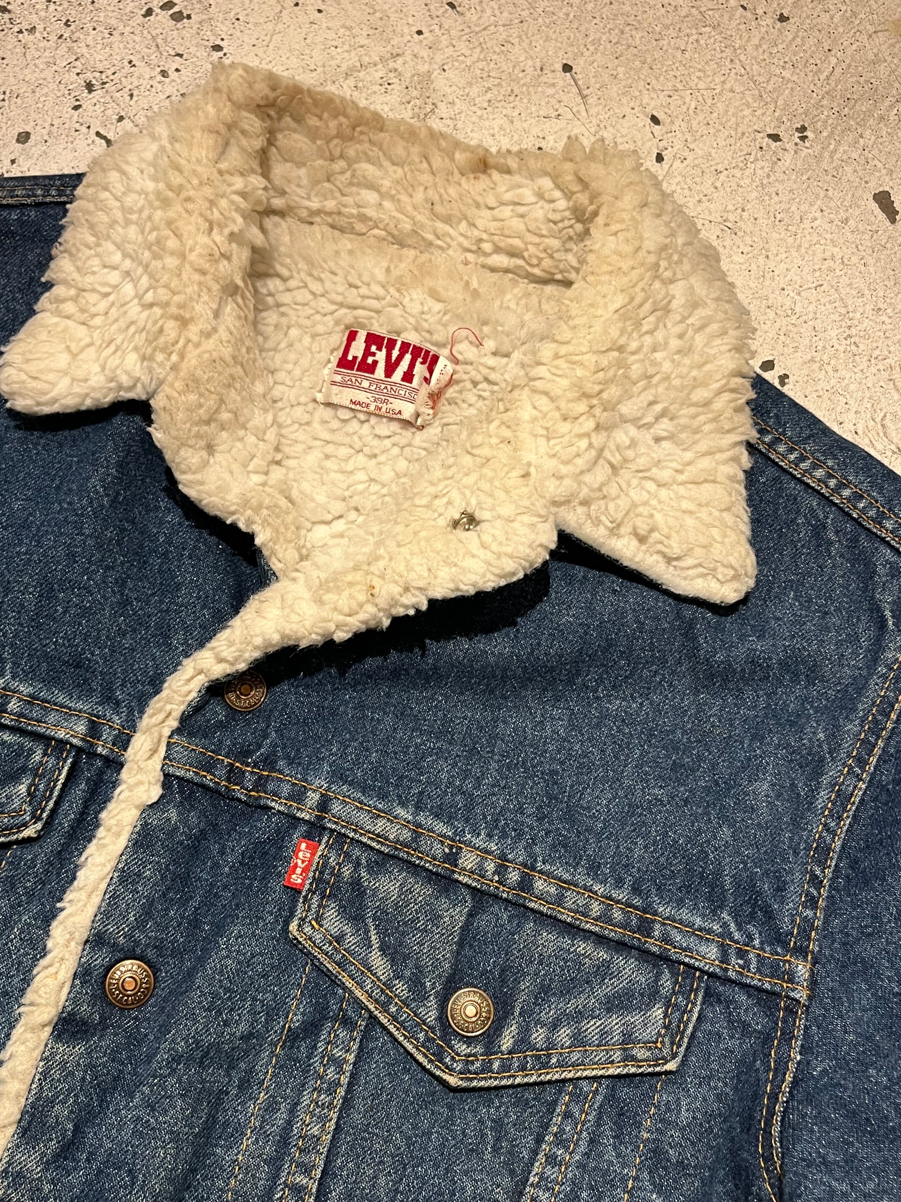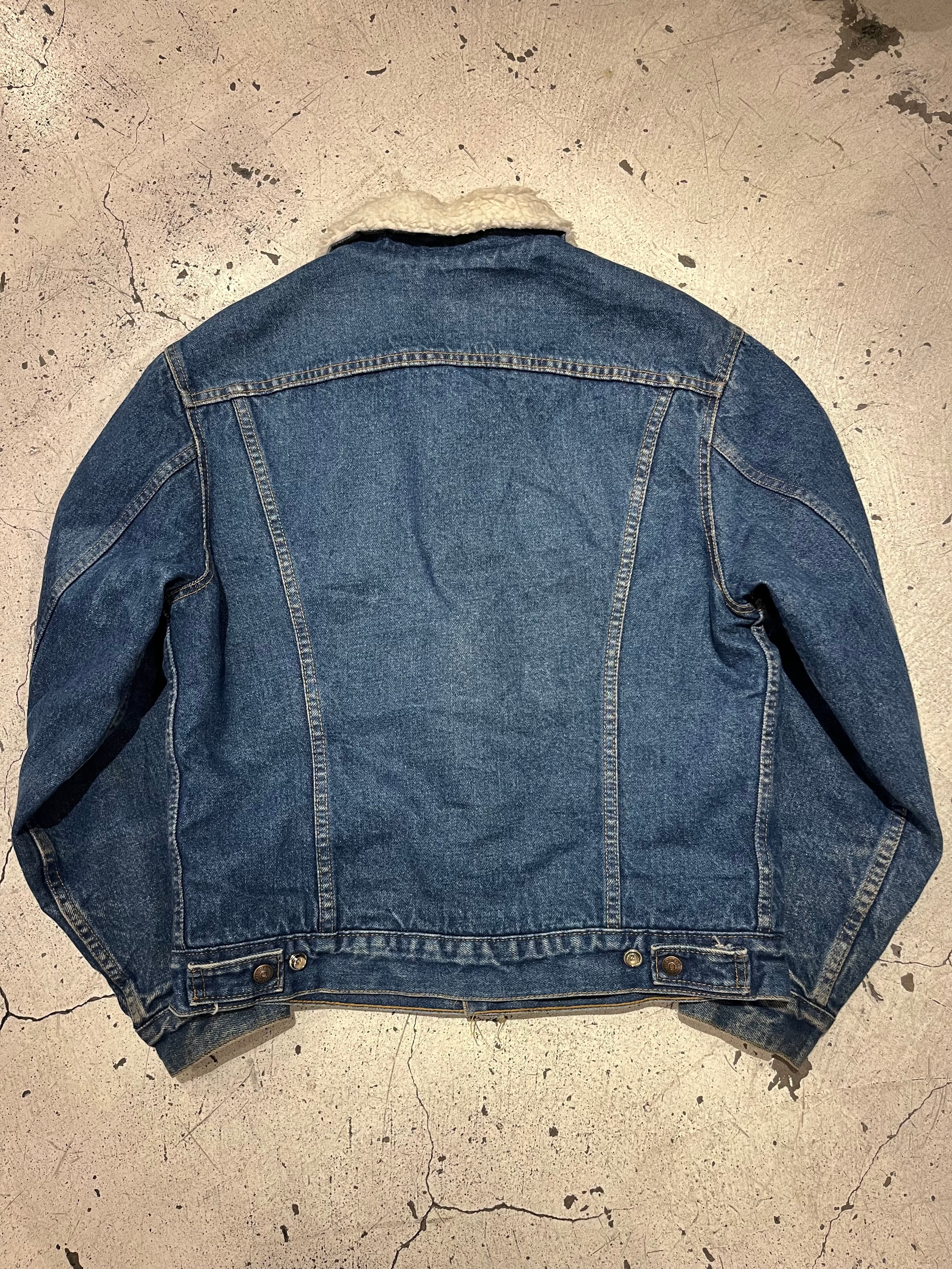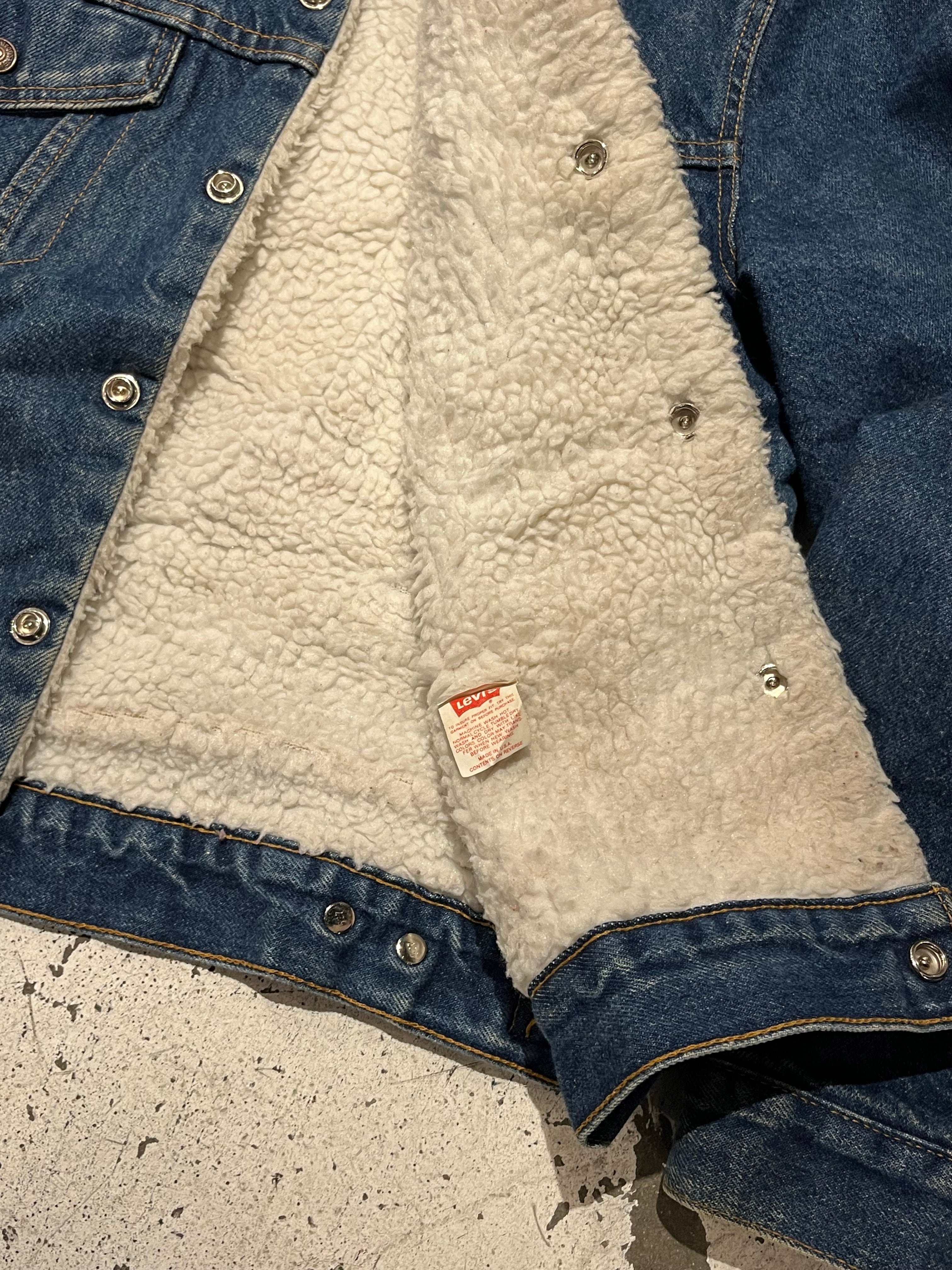 色残りのある濃紺のデニム生地とインナーにボアが取り付けられた冬仕様のトラッカージャケット