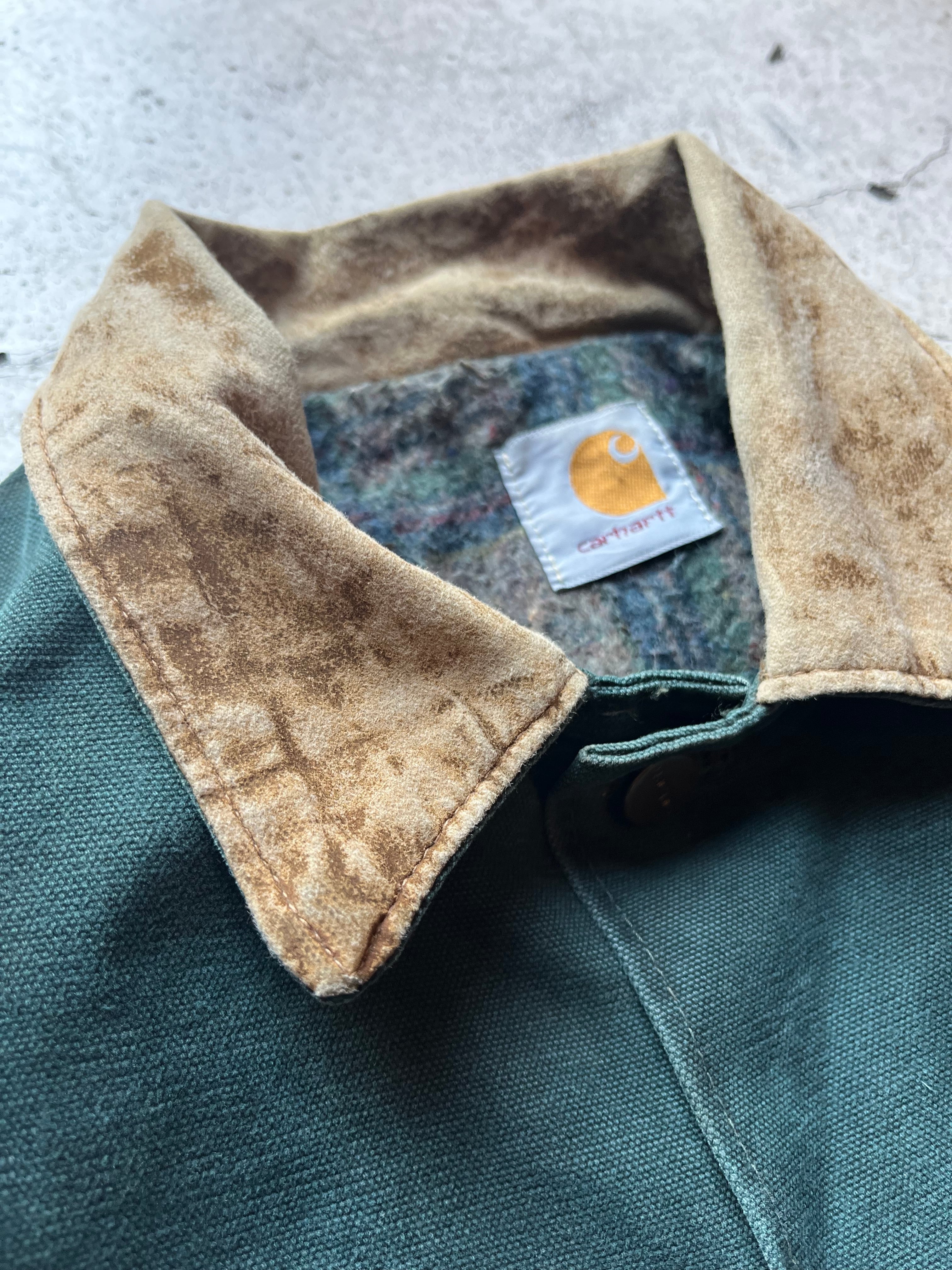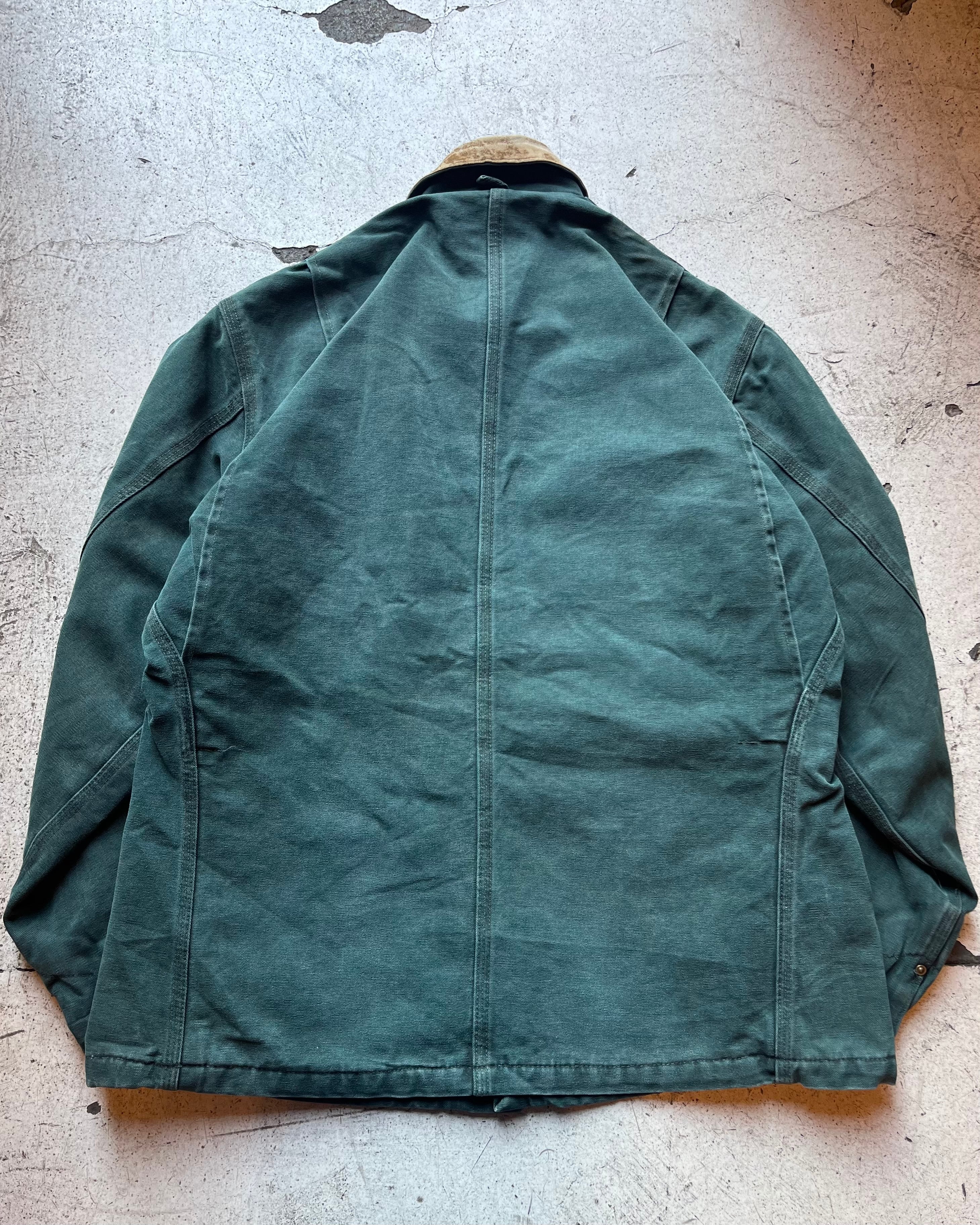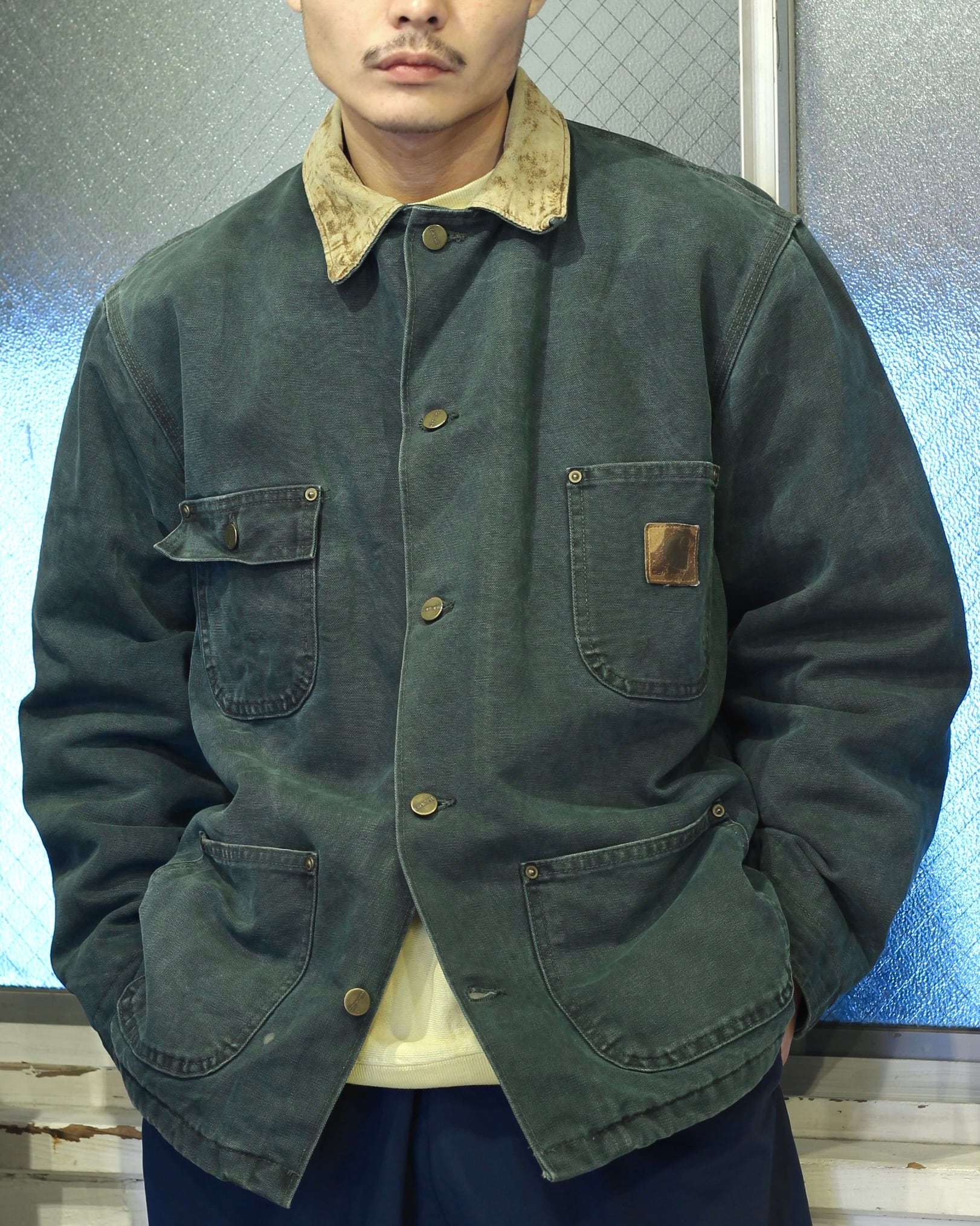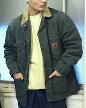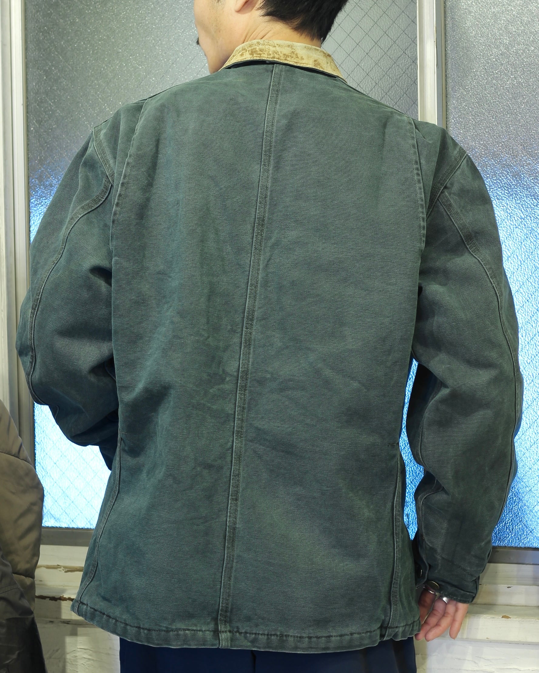 良い発色のグリーンボディにレザー切り替えの襟、気になる短丈のカバーオールアイテム