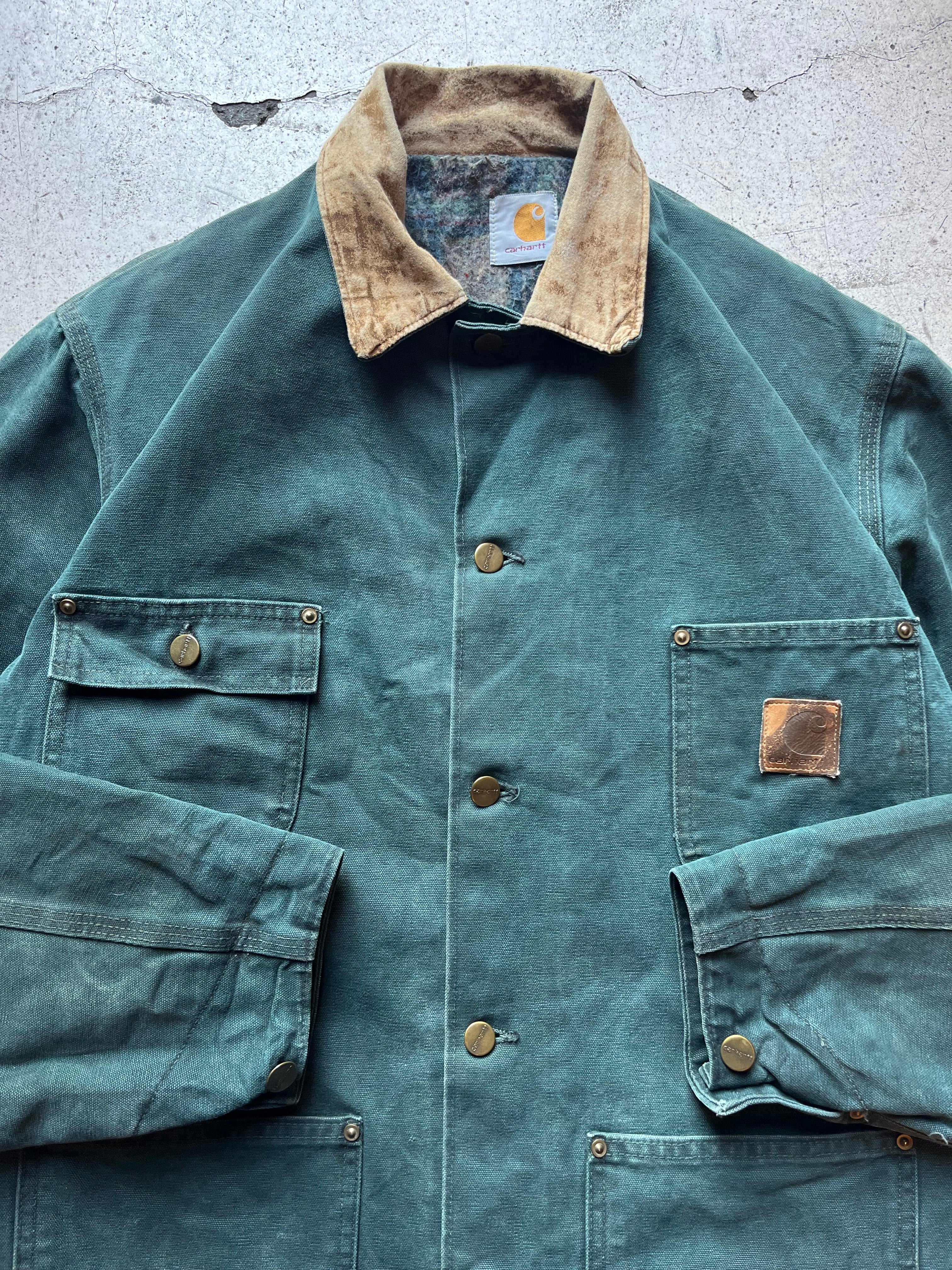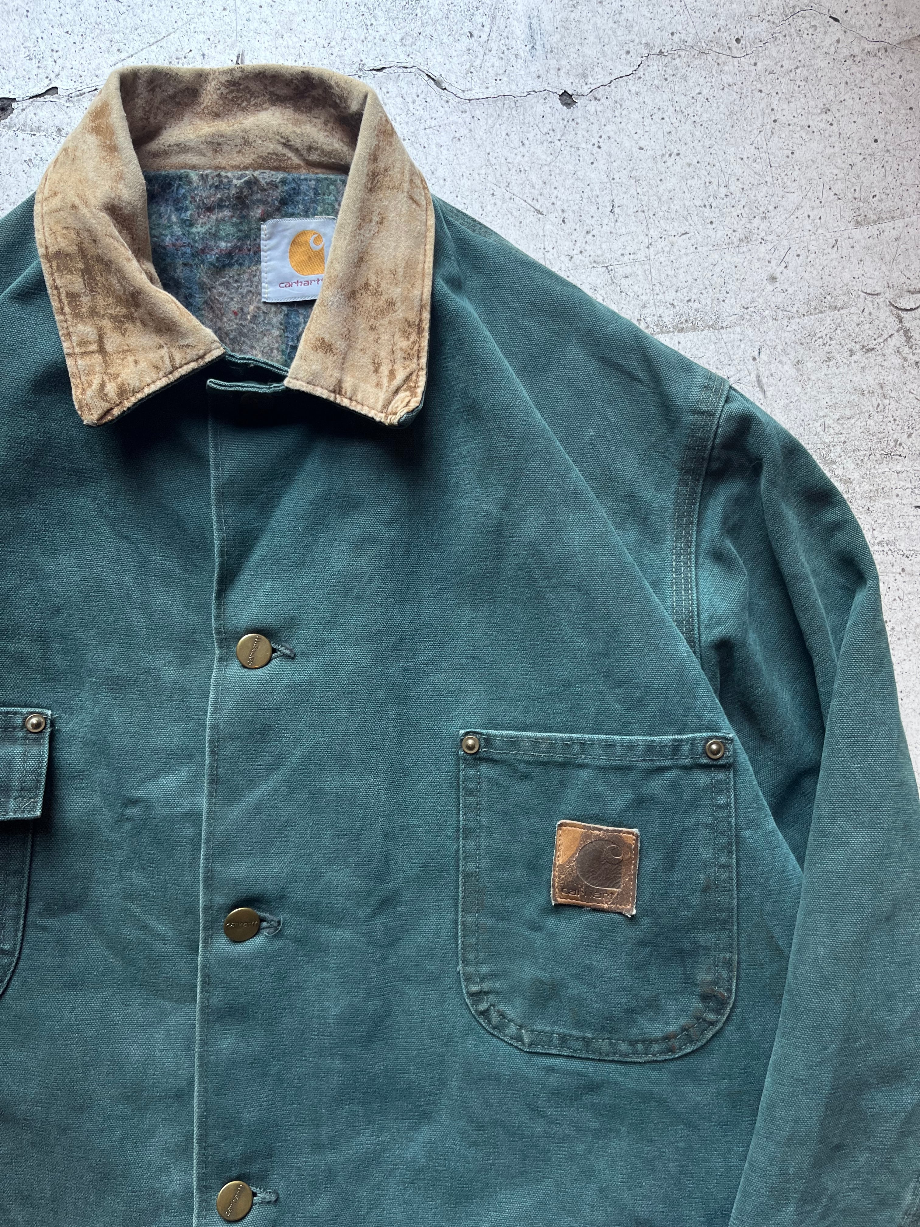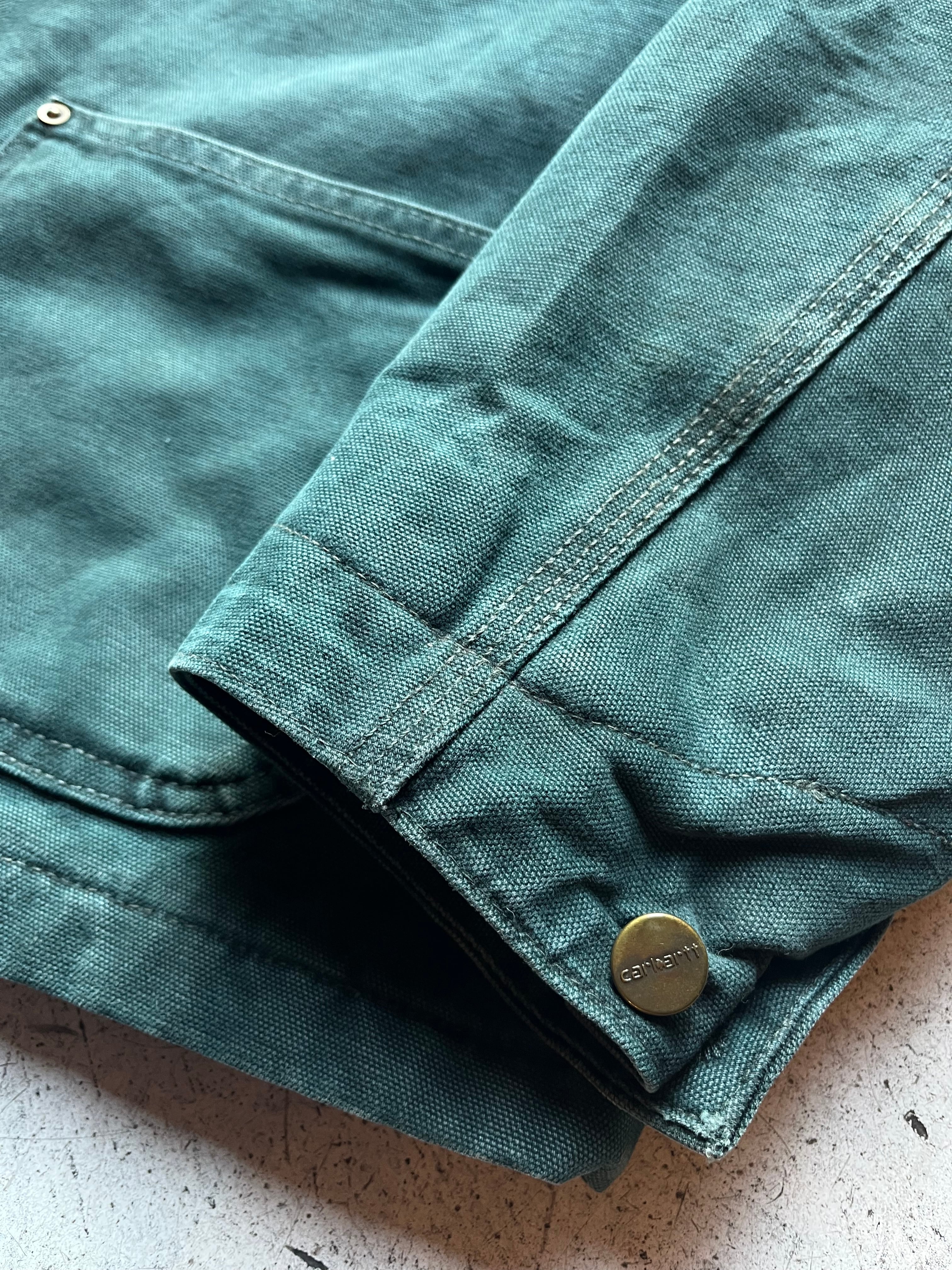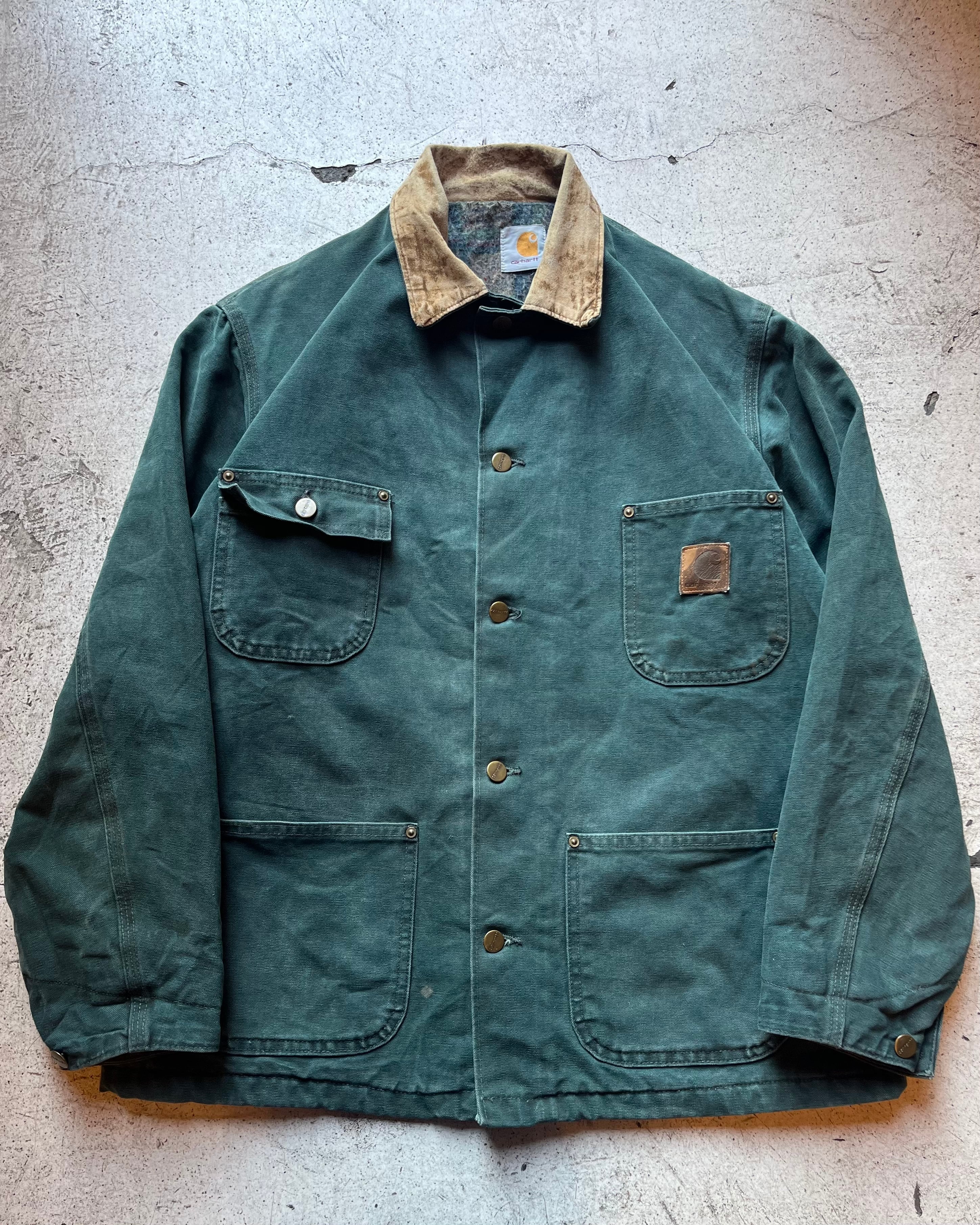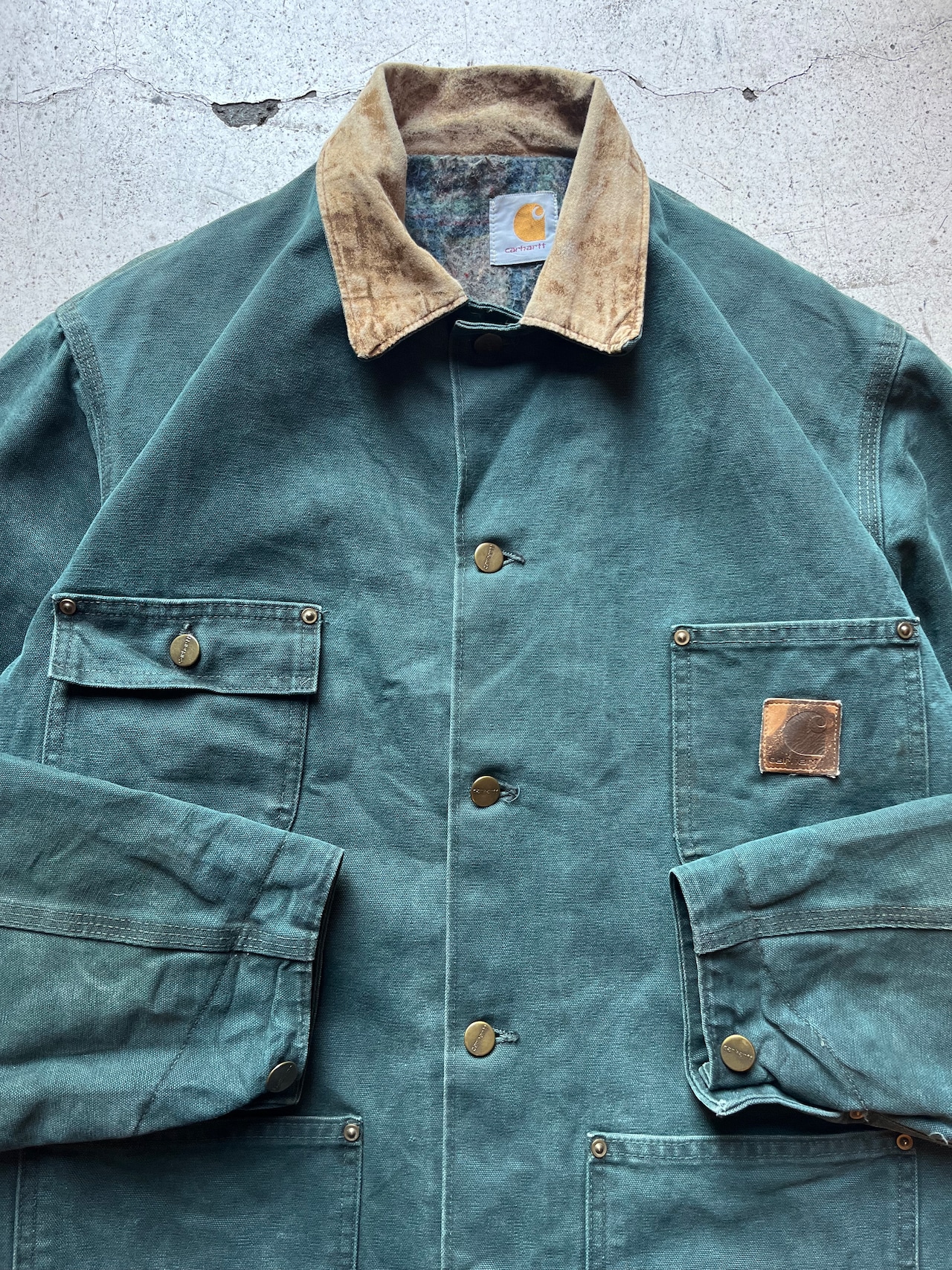 良い発色のグリーンボディにレザー切り替えの襟、気になる短丈のカバーオールアイテム