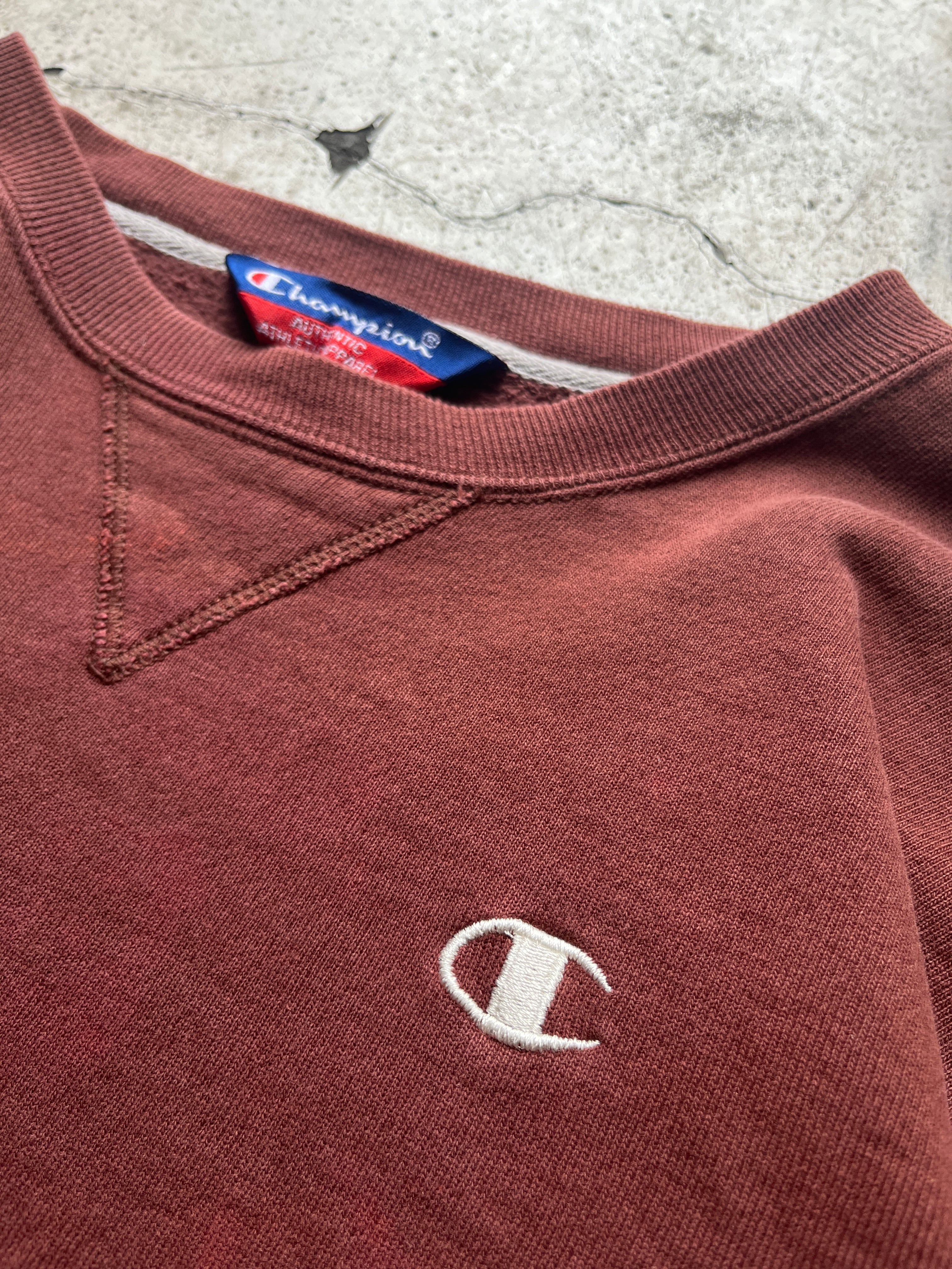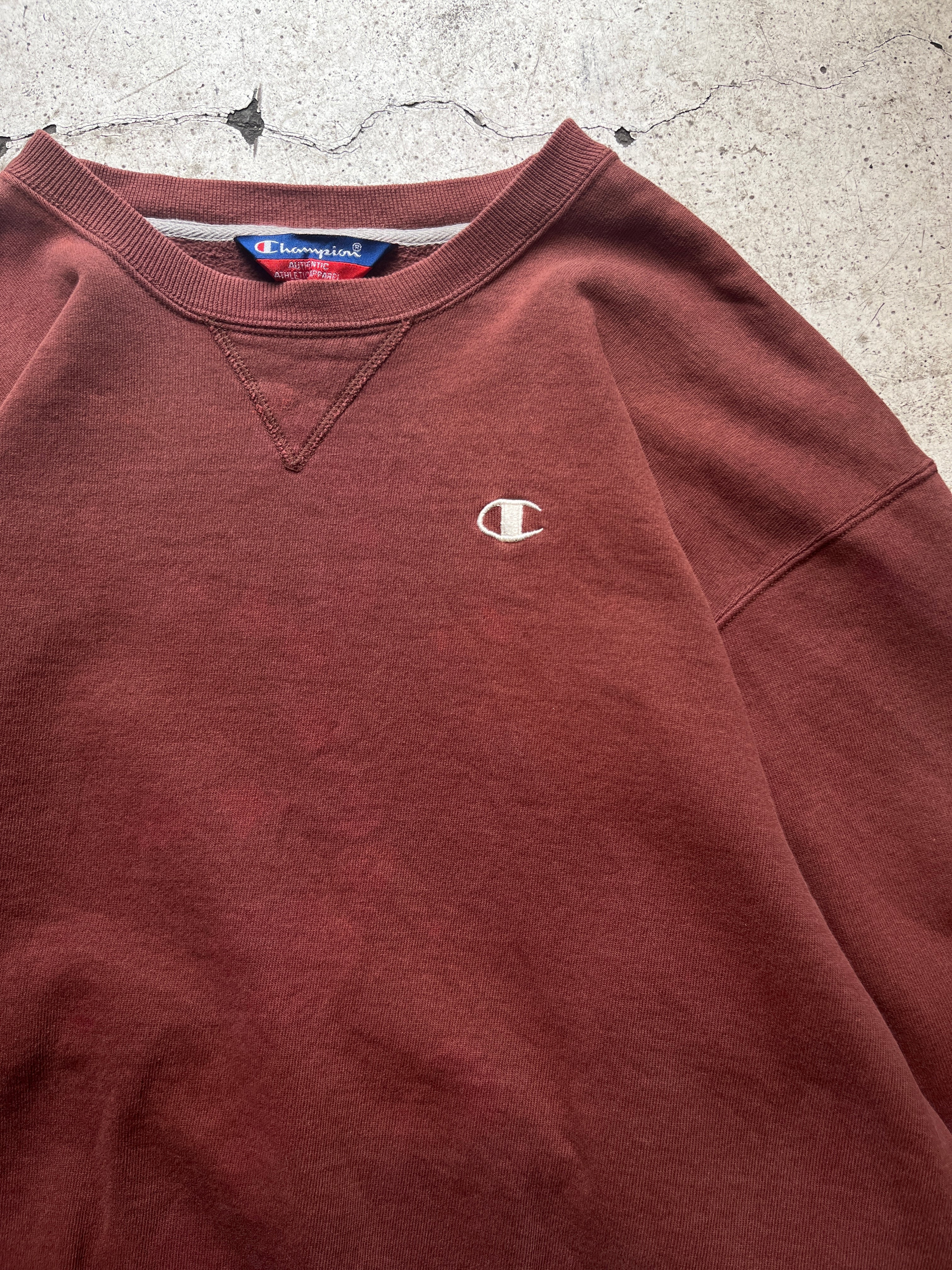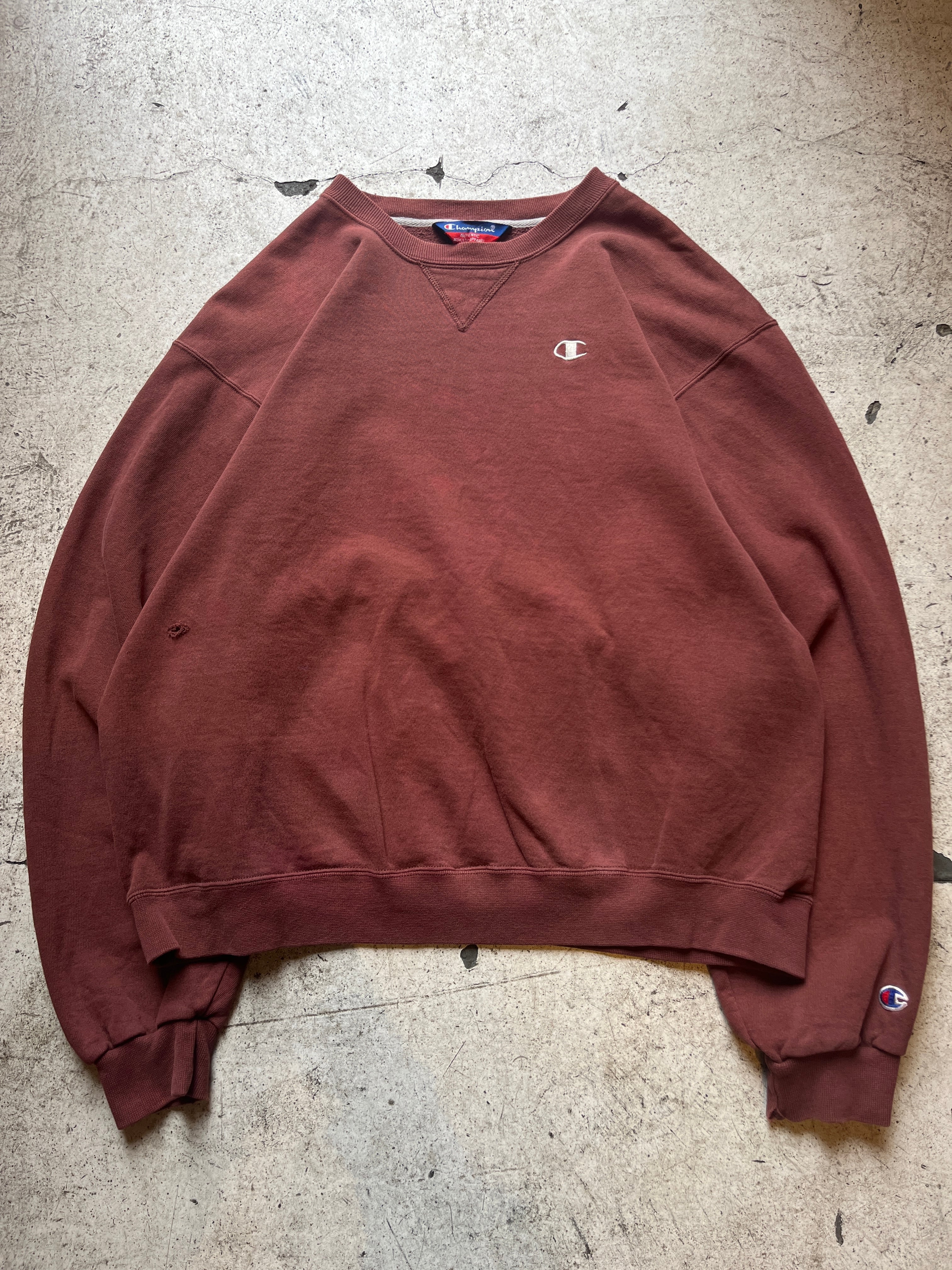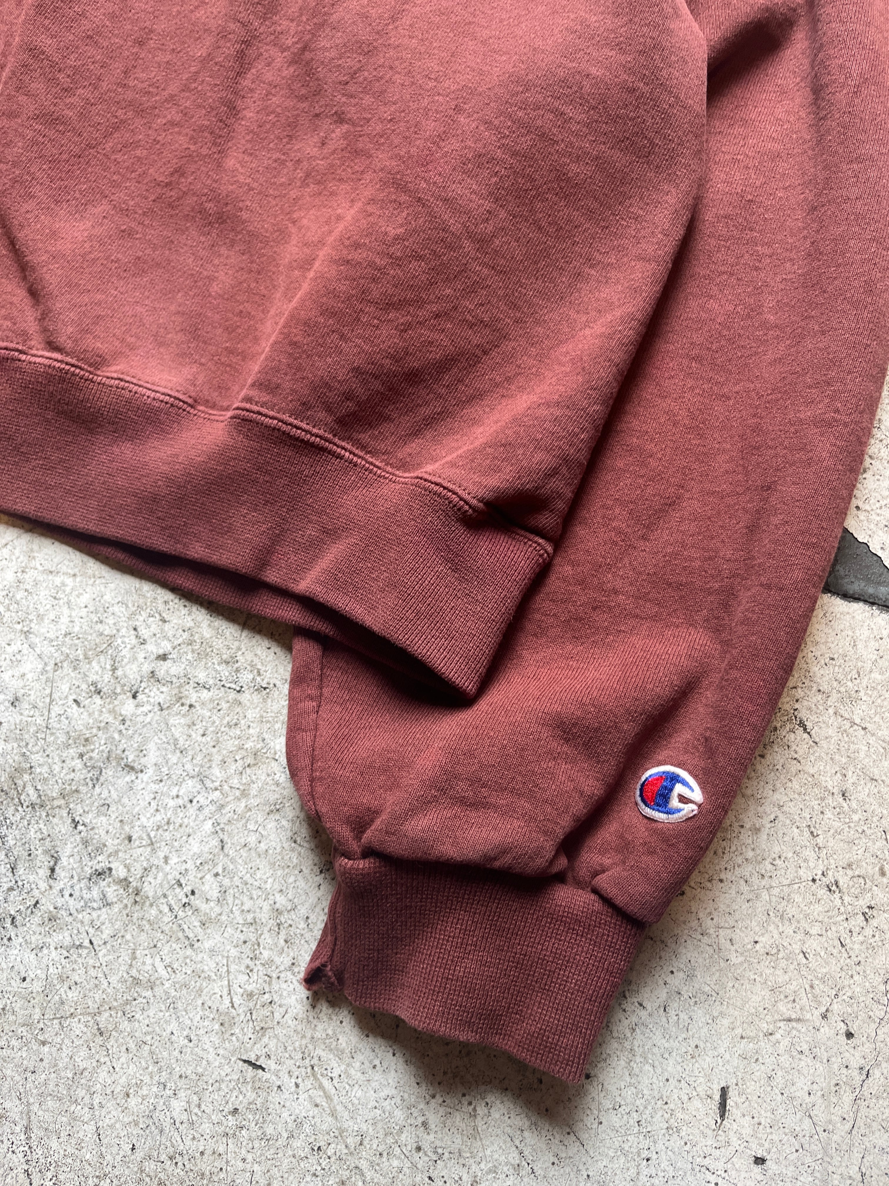 茶色よりもレンガ色という色の名がしっかりとくる独特な色味のチャンピオンのスウェット。
