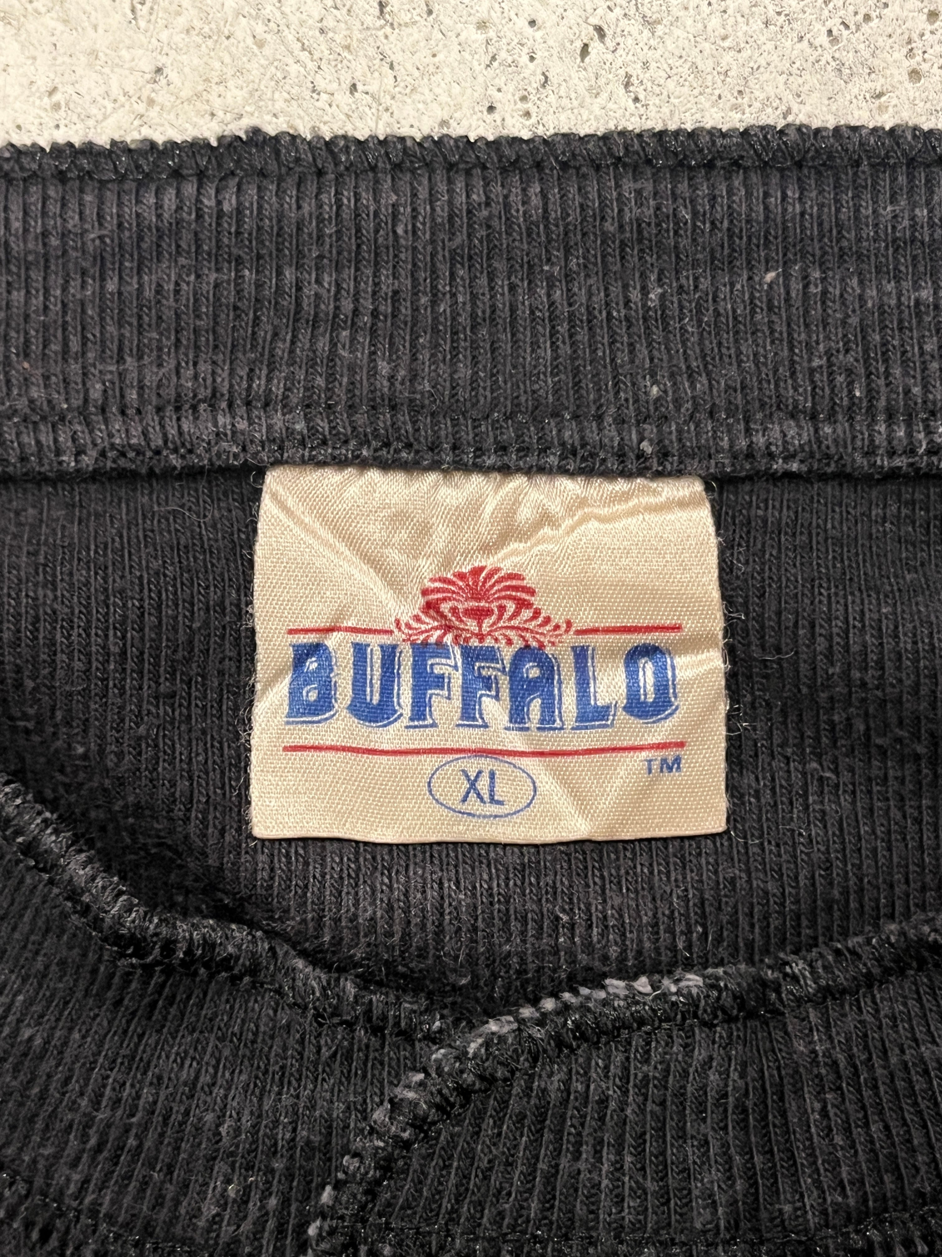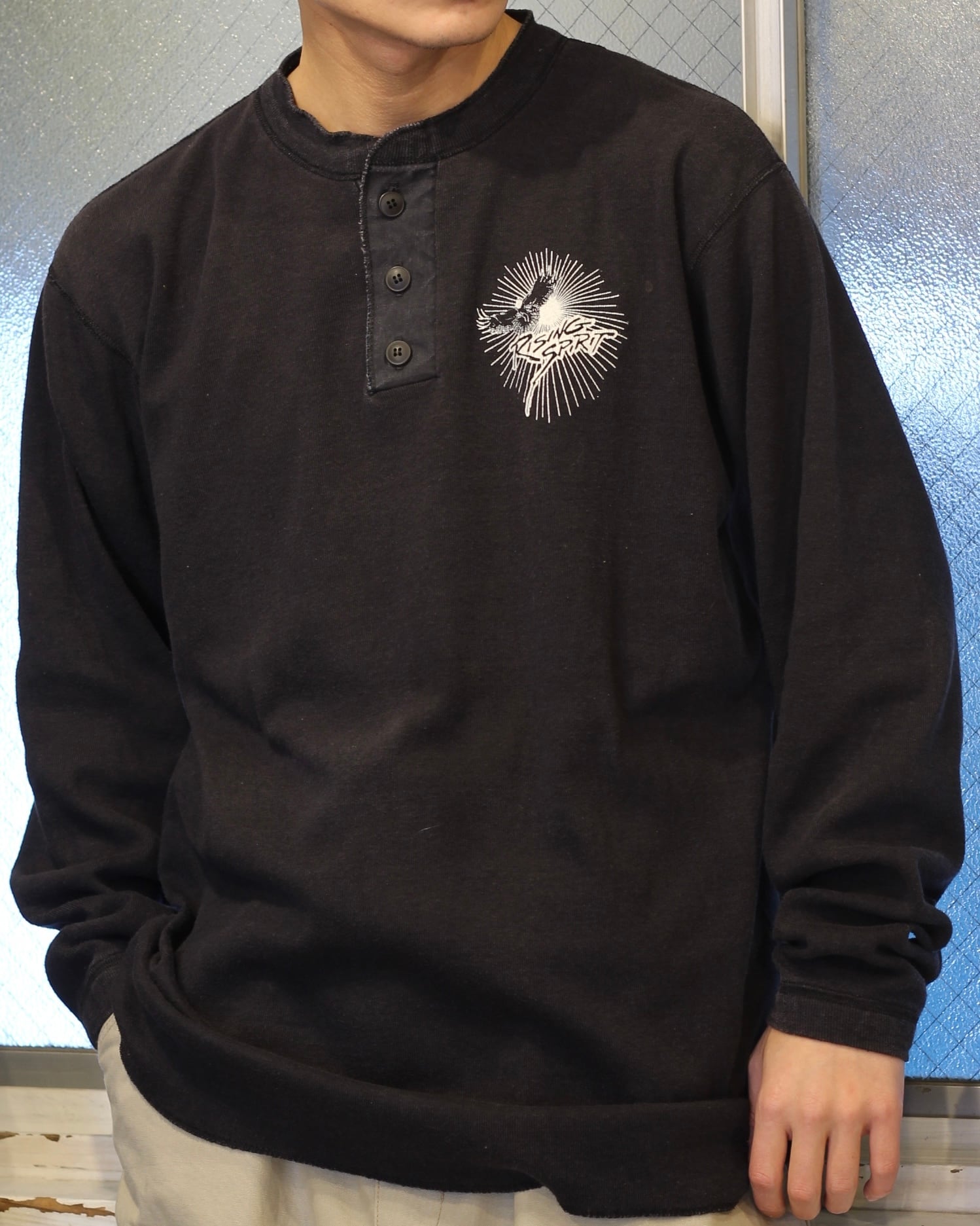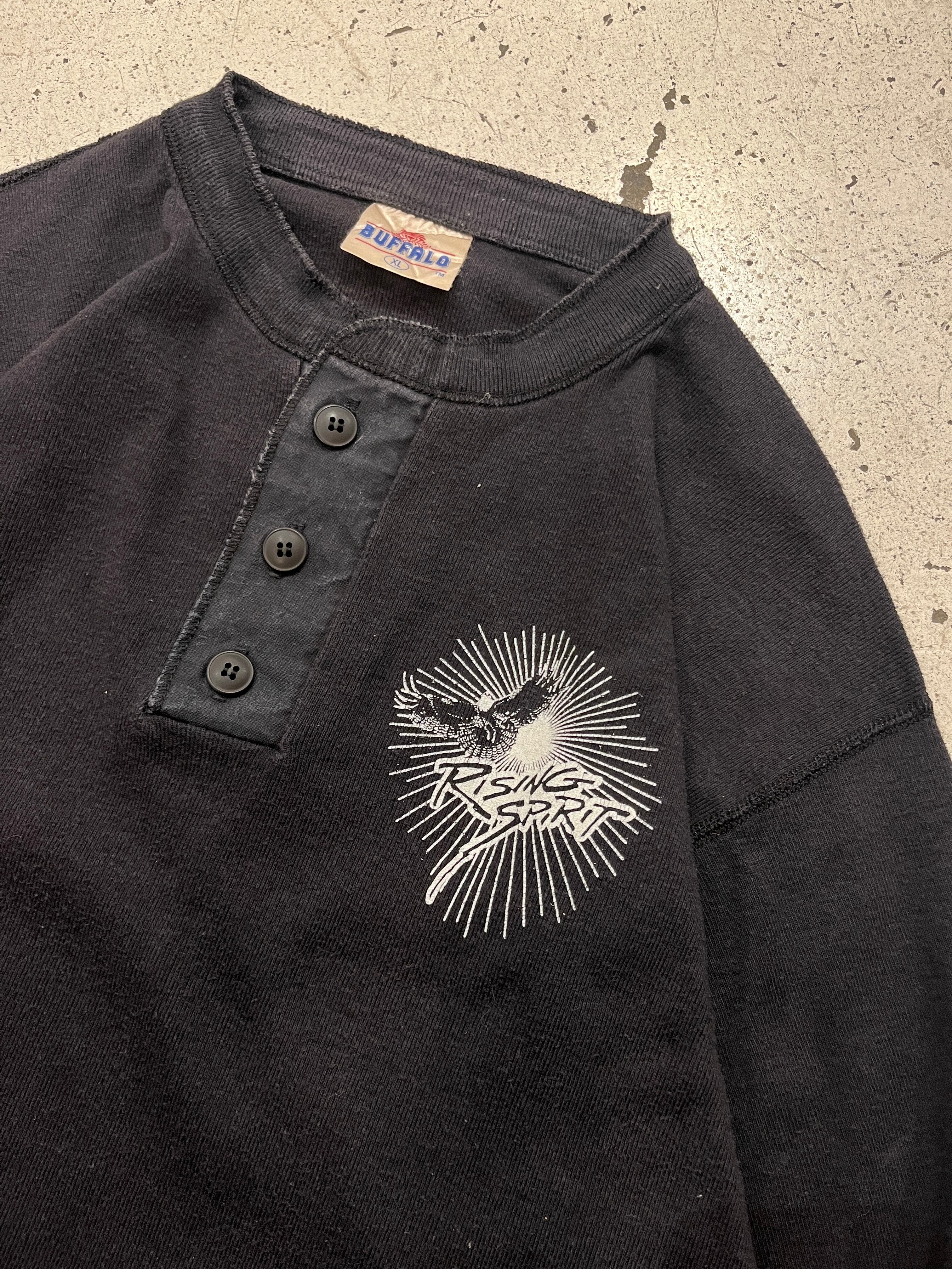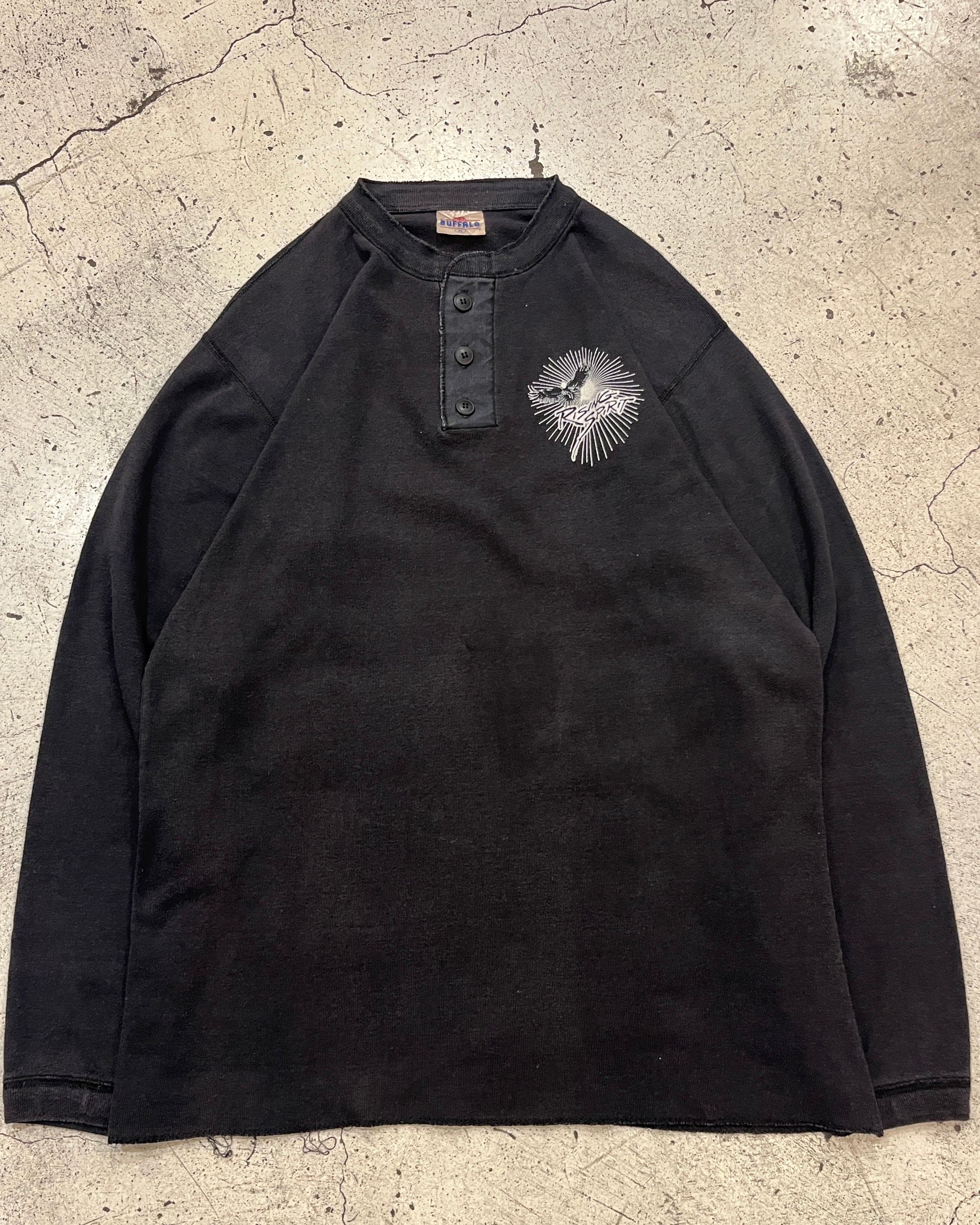 90's BUFFALO o/p&back print henry neck heavy cotton l/s tee