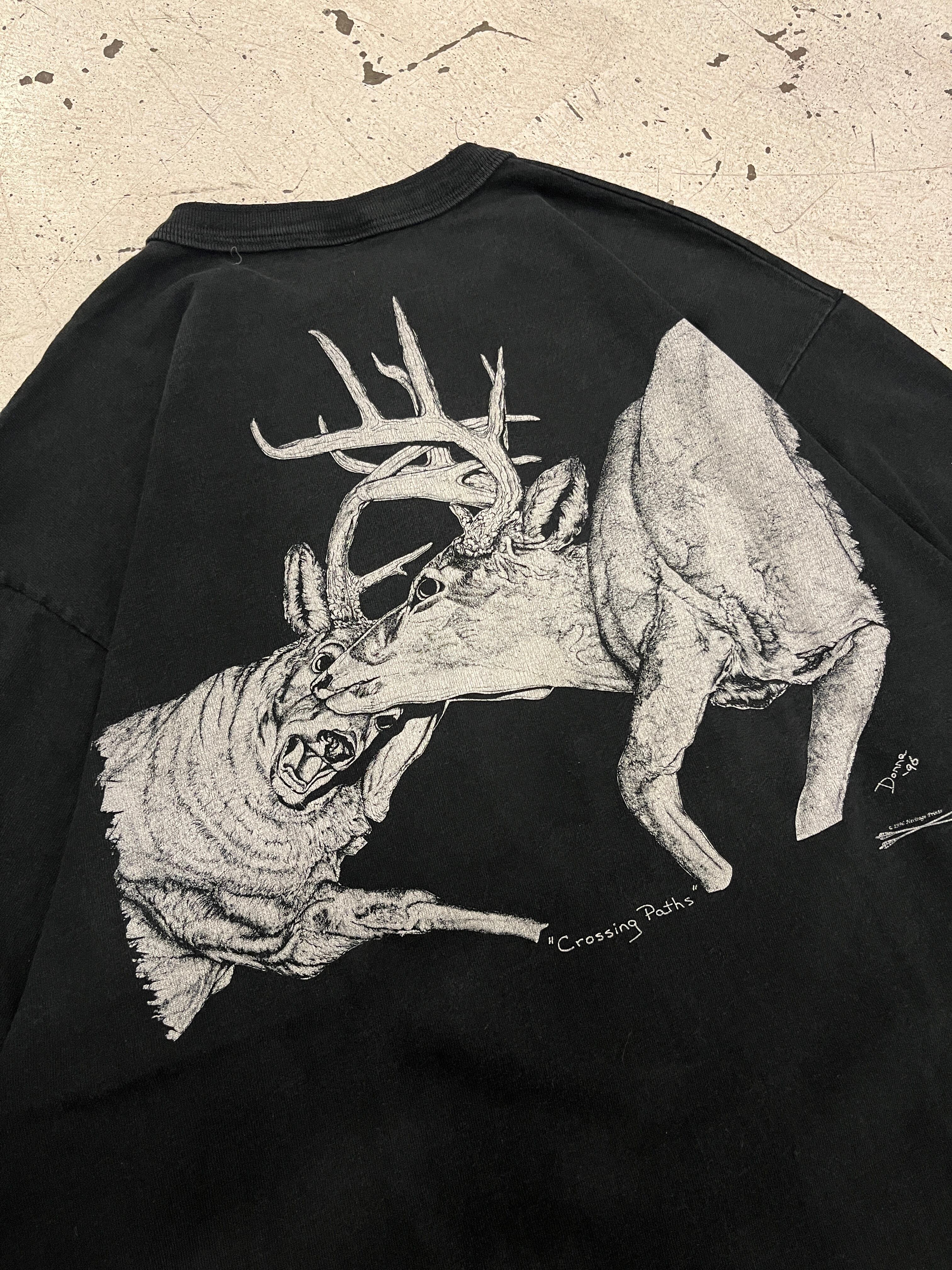 プリントデザインもケンカしている牡鹿の珍しいグッドデザイン黒ボディで扱いやすい春気分な一枚です。