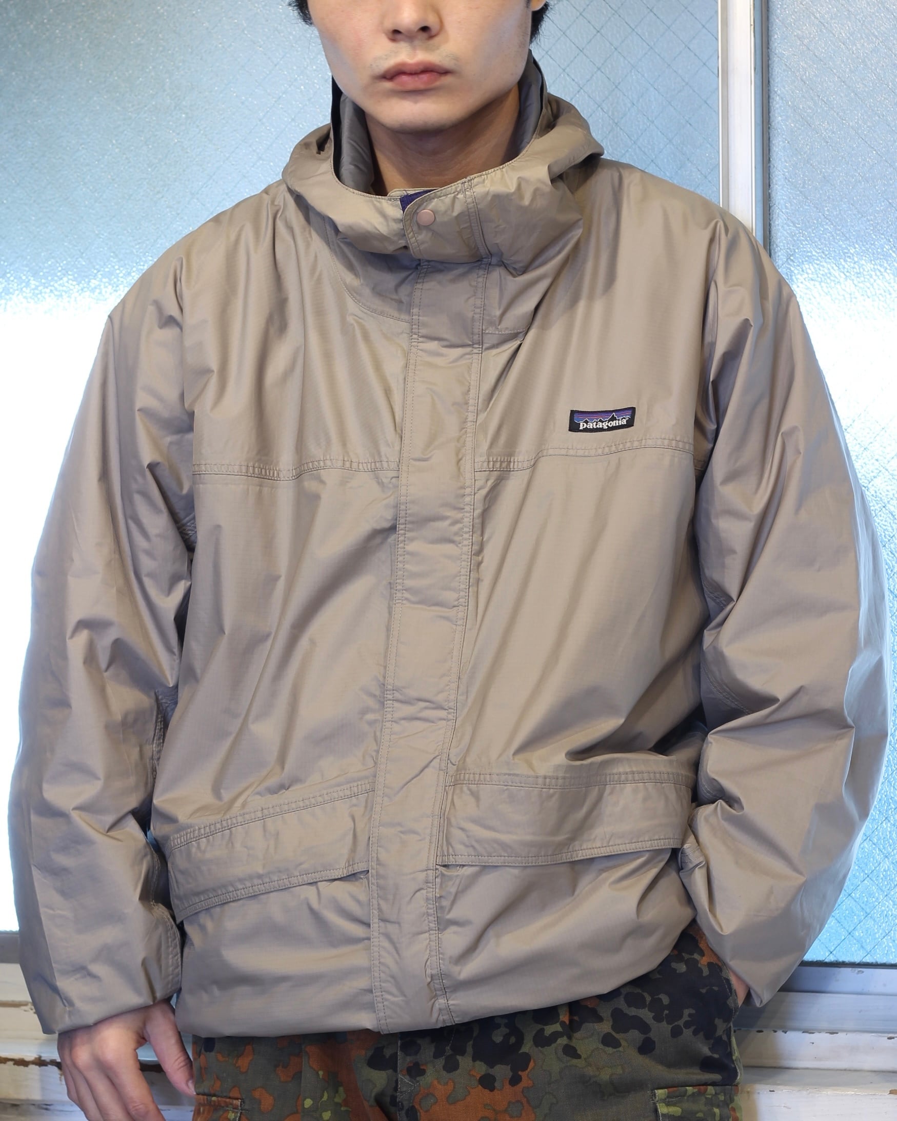 パタゴニアの春アウター丈感スッキリなグッドシルエットにノームコアにもテックにも合わせらせる絶妙なメタリックカラーの良い色味の一着です。