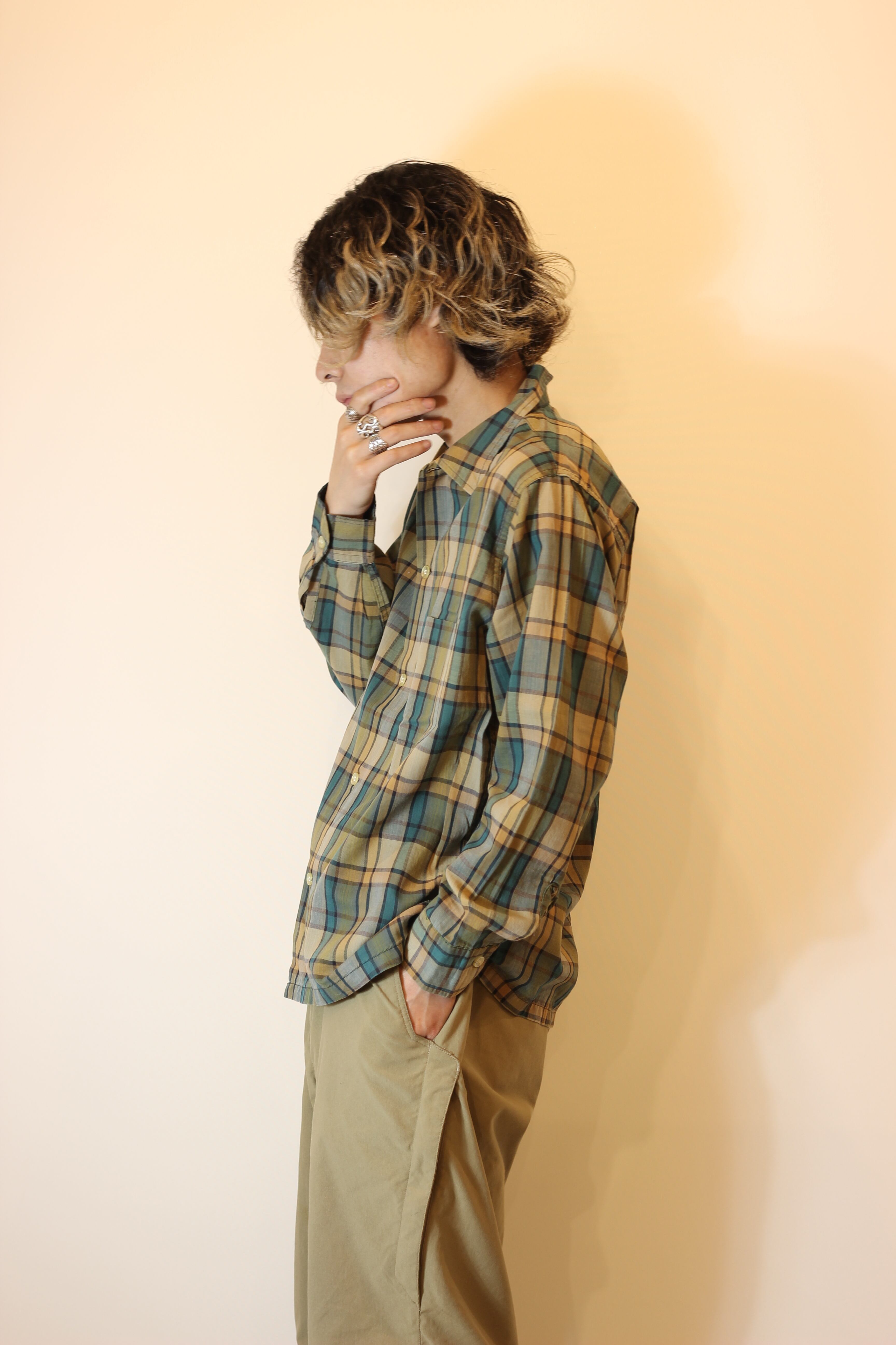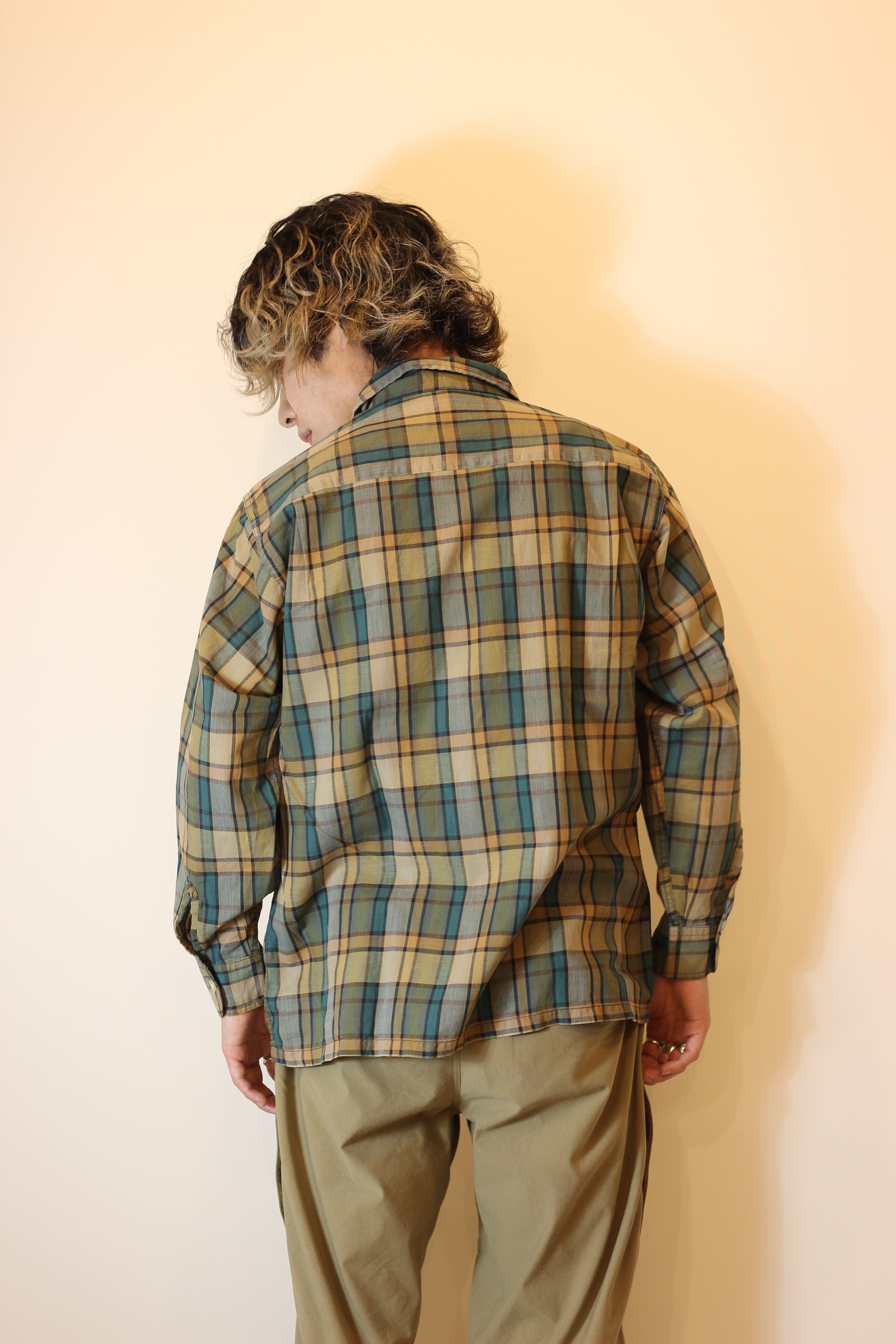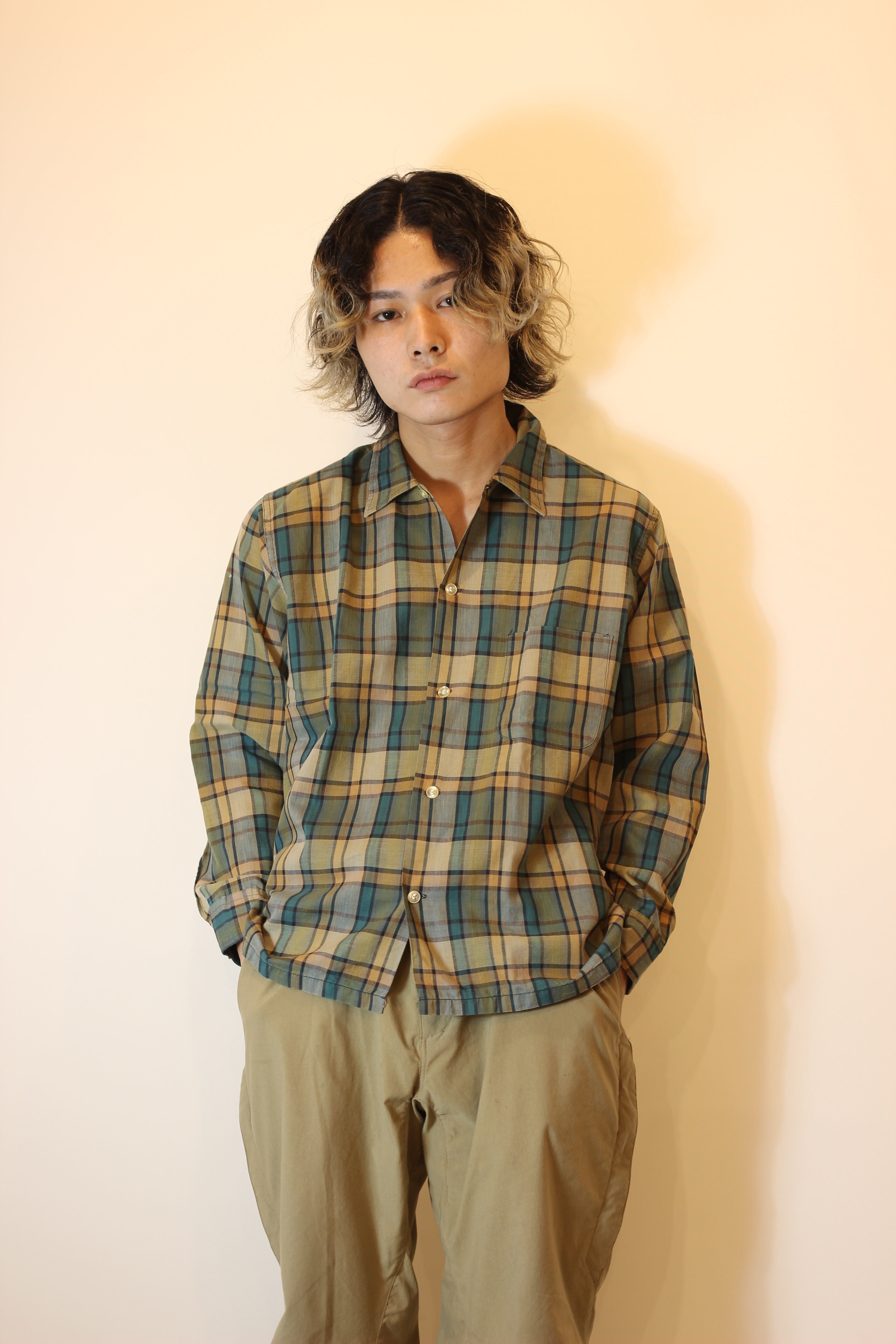 シルエットはボックスシルエット更に、緑とベージュの、落ち着いた色味のチェックがよりビンテージの雰囲気を引き立たせてくれているそんな一着です。