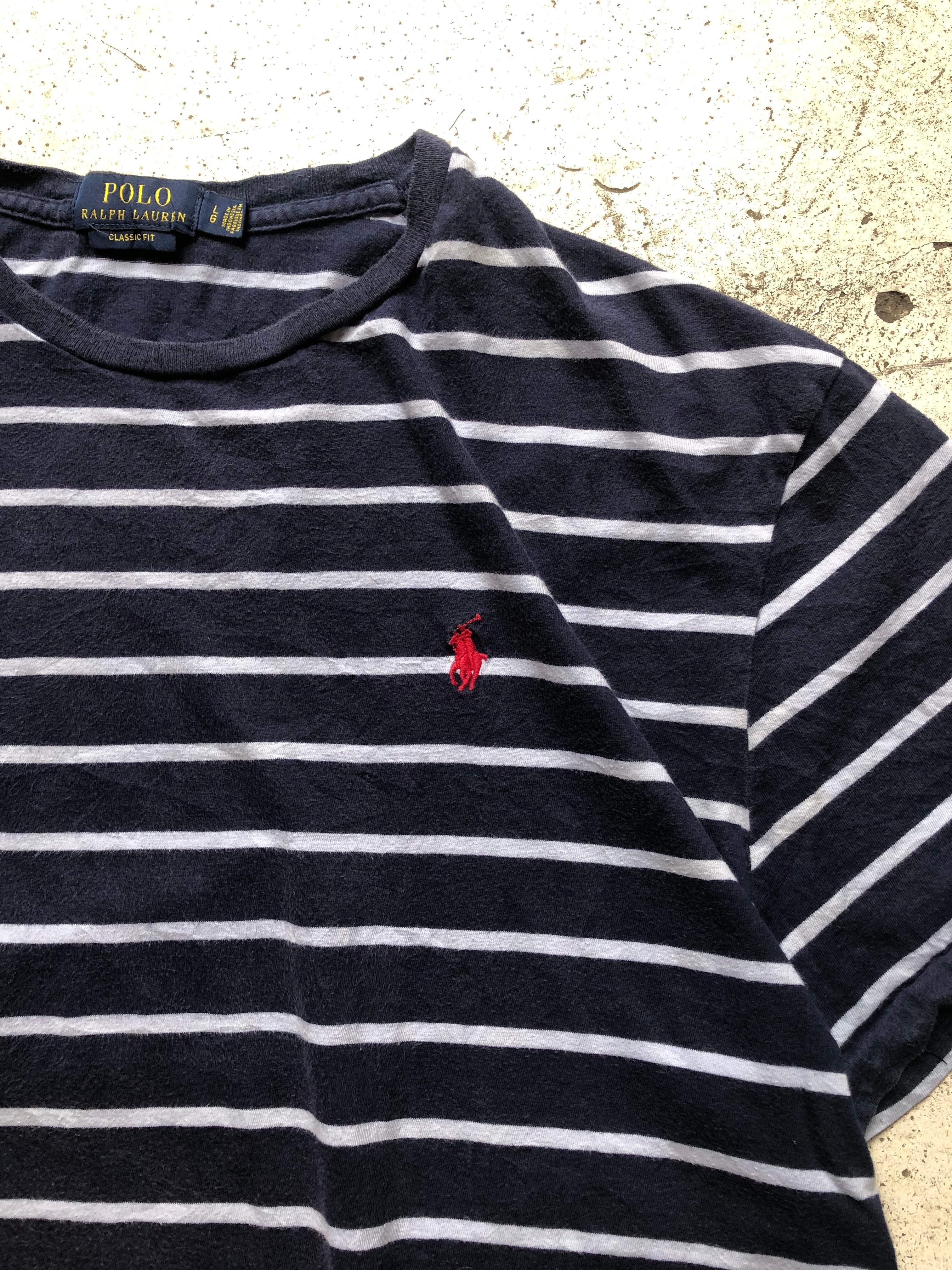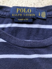 ネイビー×ホワイトのマリンボーダーを彷彿とさせる横縞に赤のワンポイント何ともラルフらしいクラシカルな一枚。