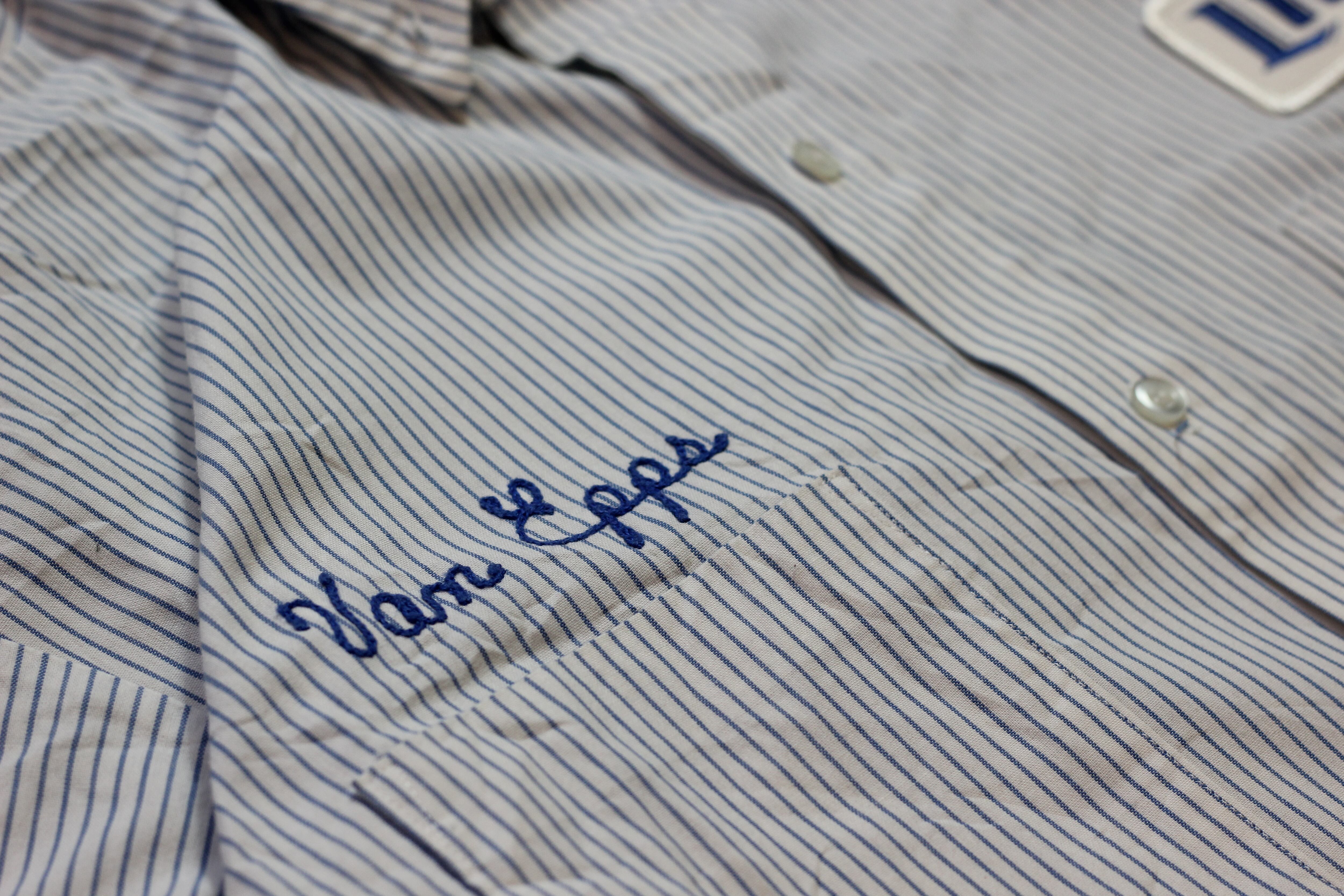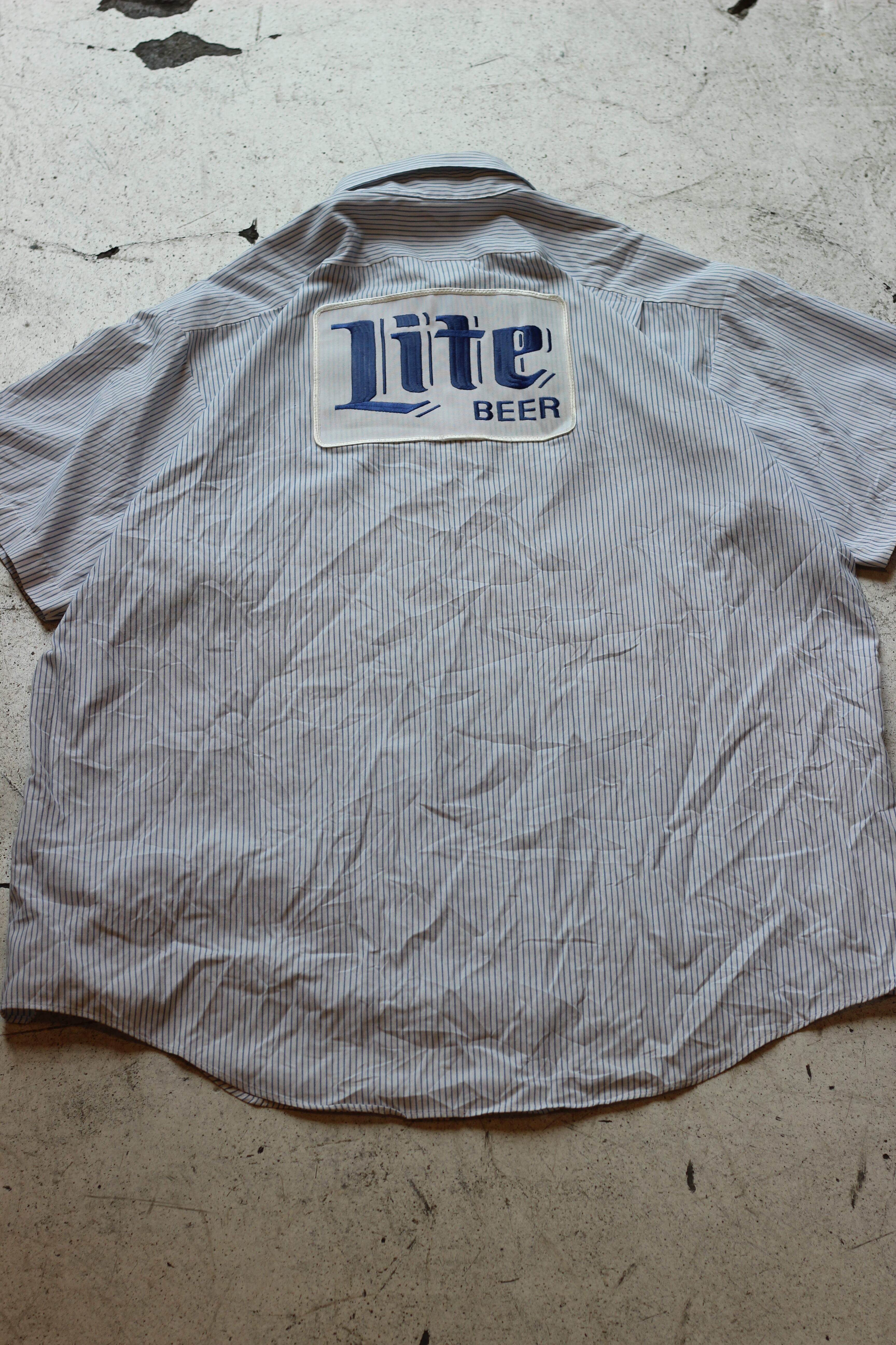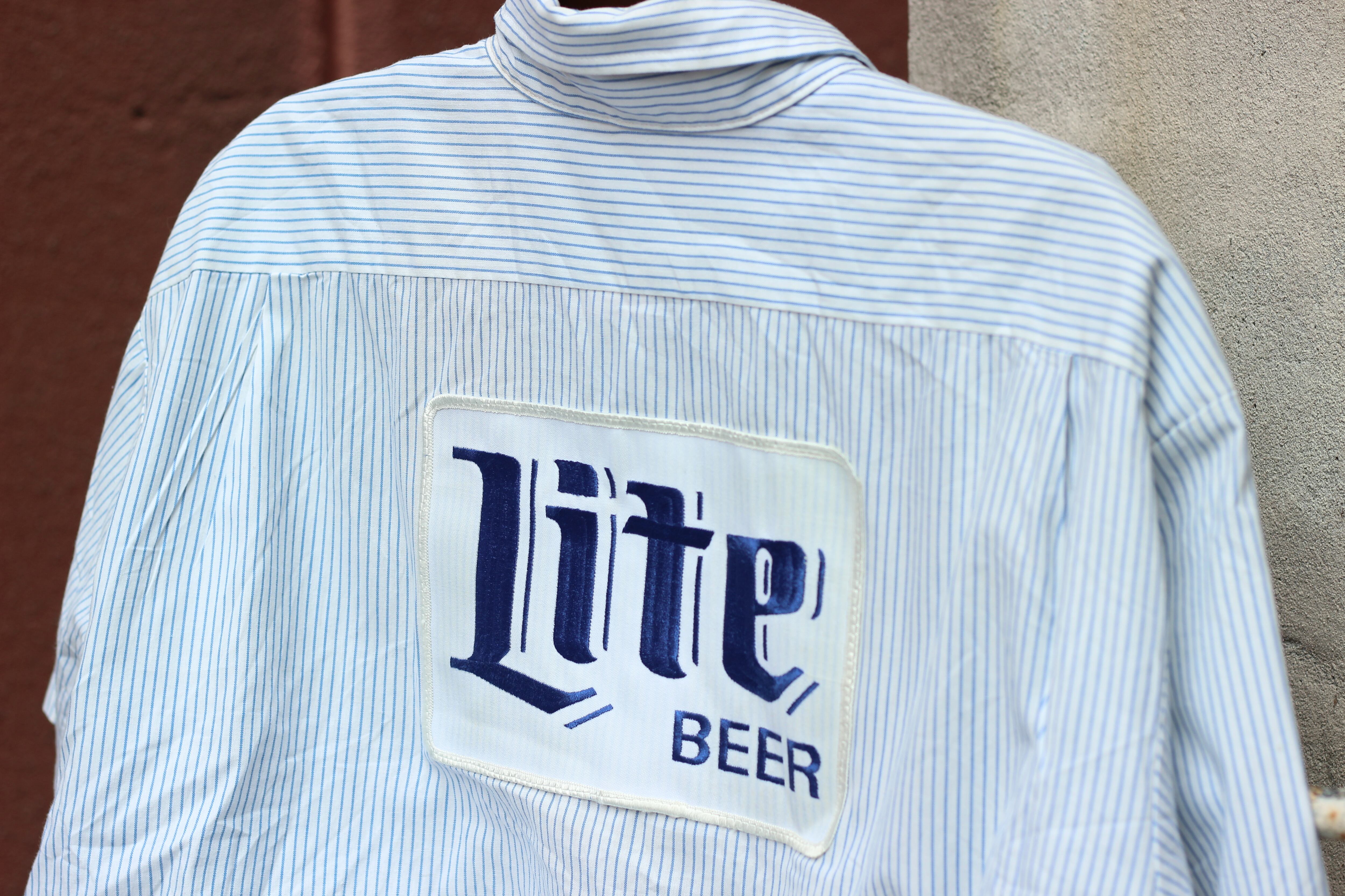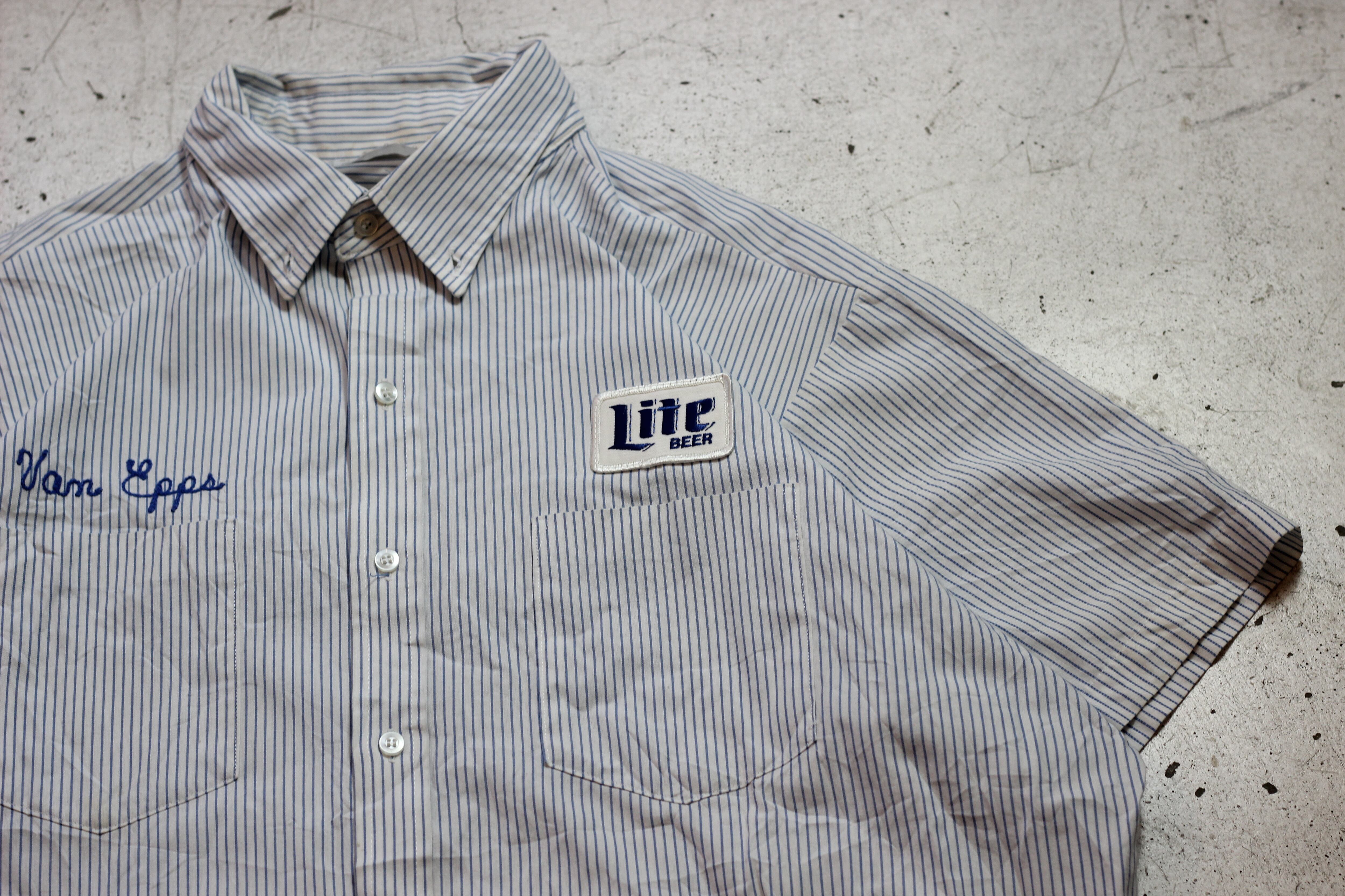 ワッペンが貼り付けられたオールドのワークシャツ夏らしい白と青のストライプに左胸にはひっそりとチェーンステッチがあしらわれています。