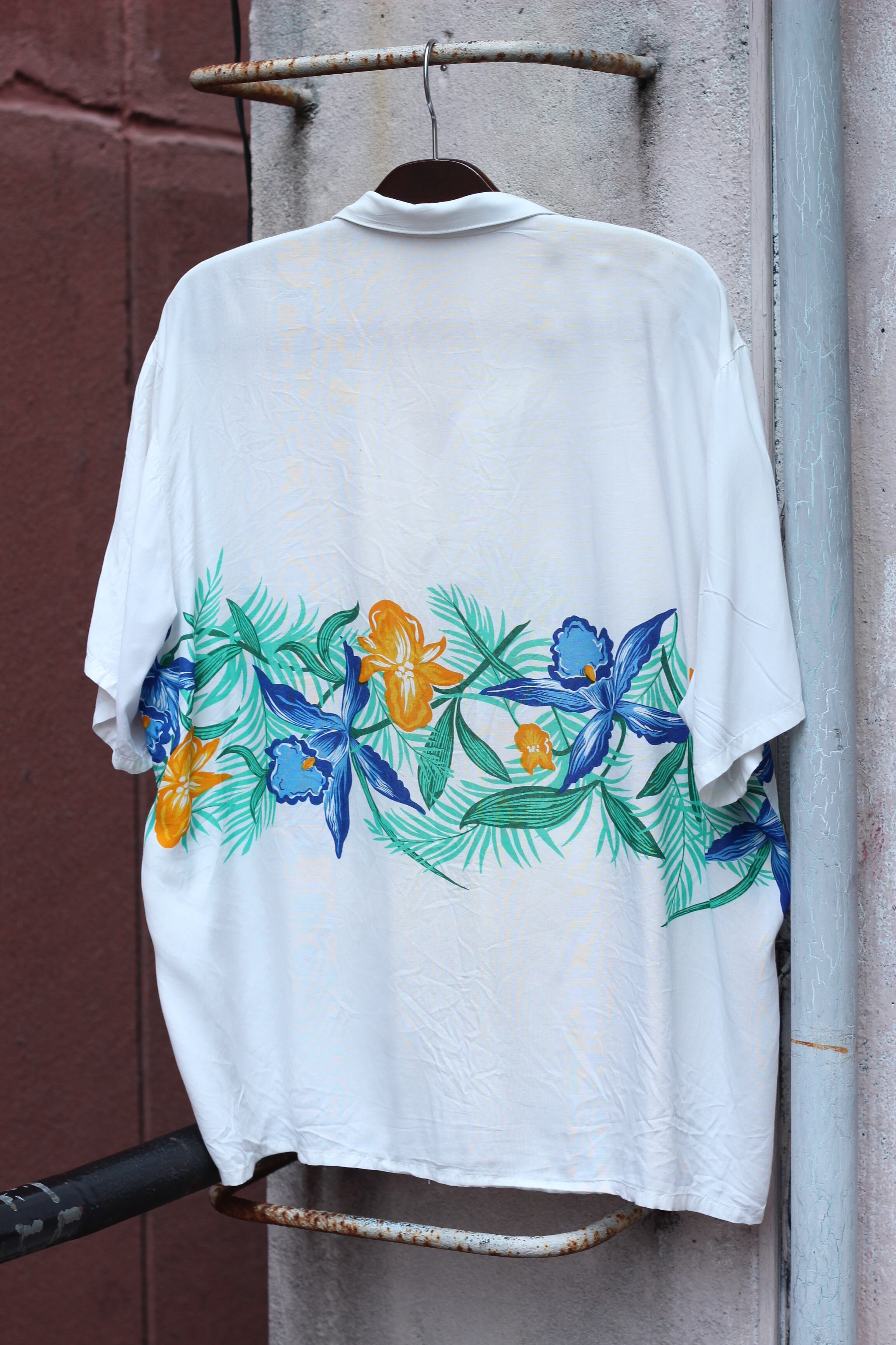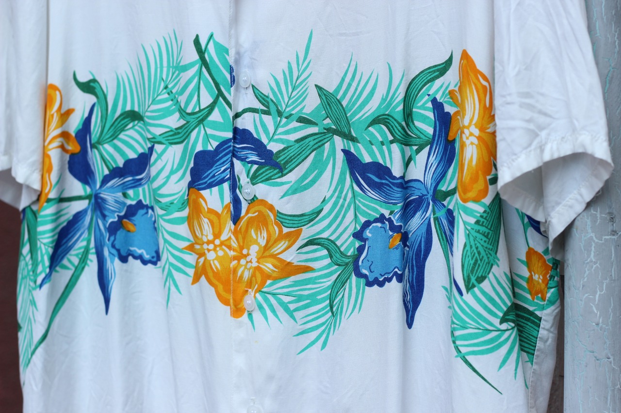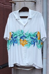 白ボディに鮮やかな色合いの花々がプリントされたアロハシャツ、アロハシャツと言えば総柄のイメージですが、此方のアイテムは、中央部分をグルリと一周するようにプリントデザインが入った一枚です。