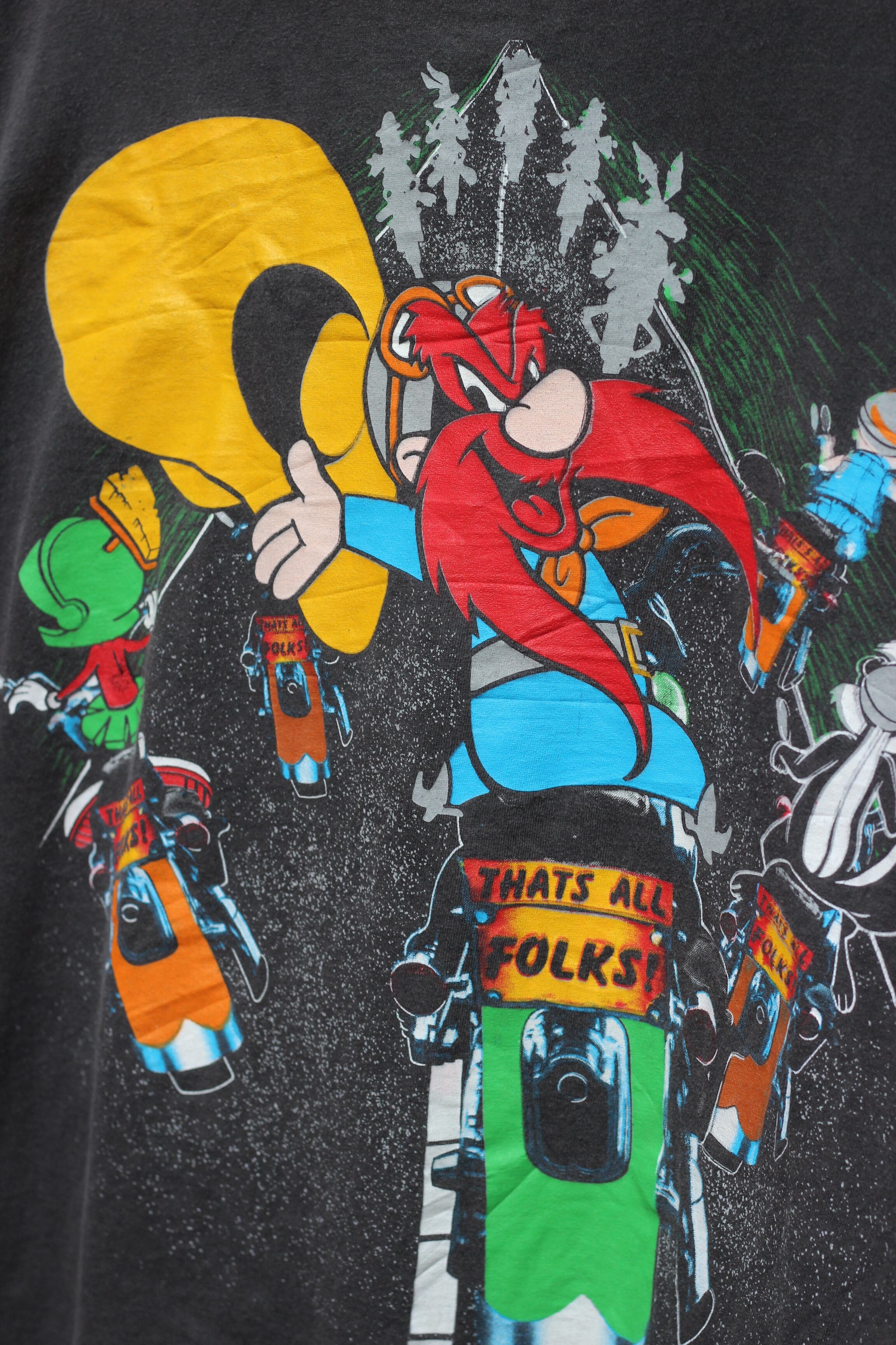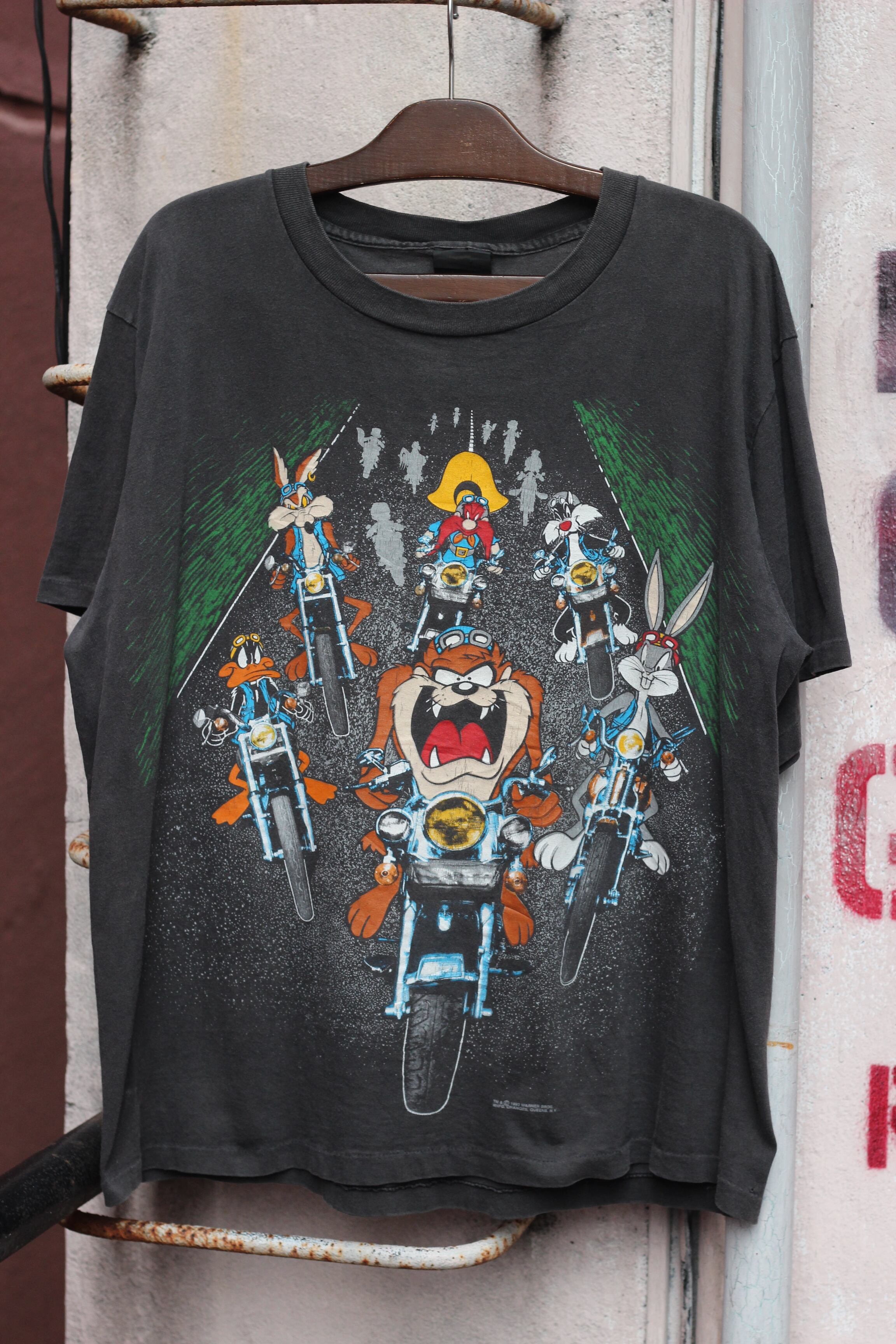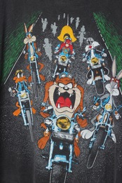 ©︎93年のルーニーチューズteeブラックボディにキャラクターたちがツーリングしているプリントがチャーミングな一枚です。