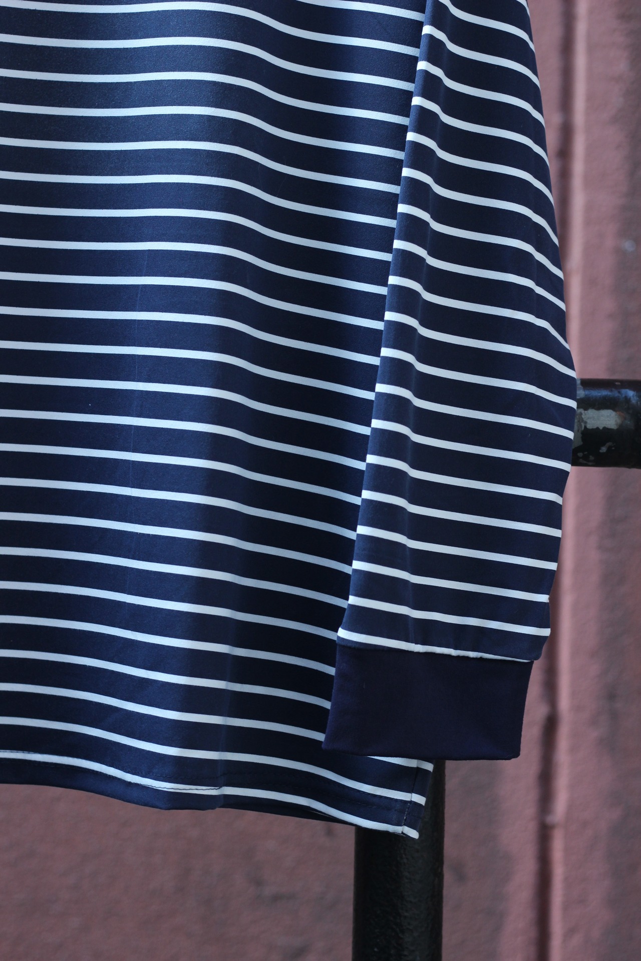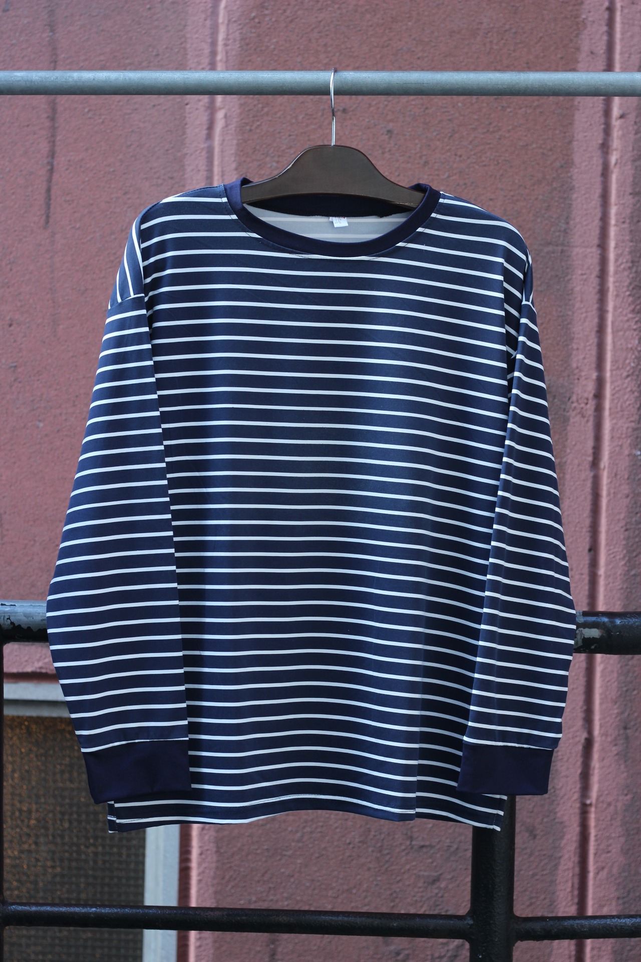 配色は基本のネイビーとホワイト汎用性の高い一着です。