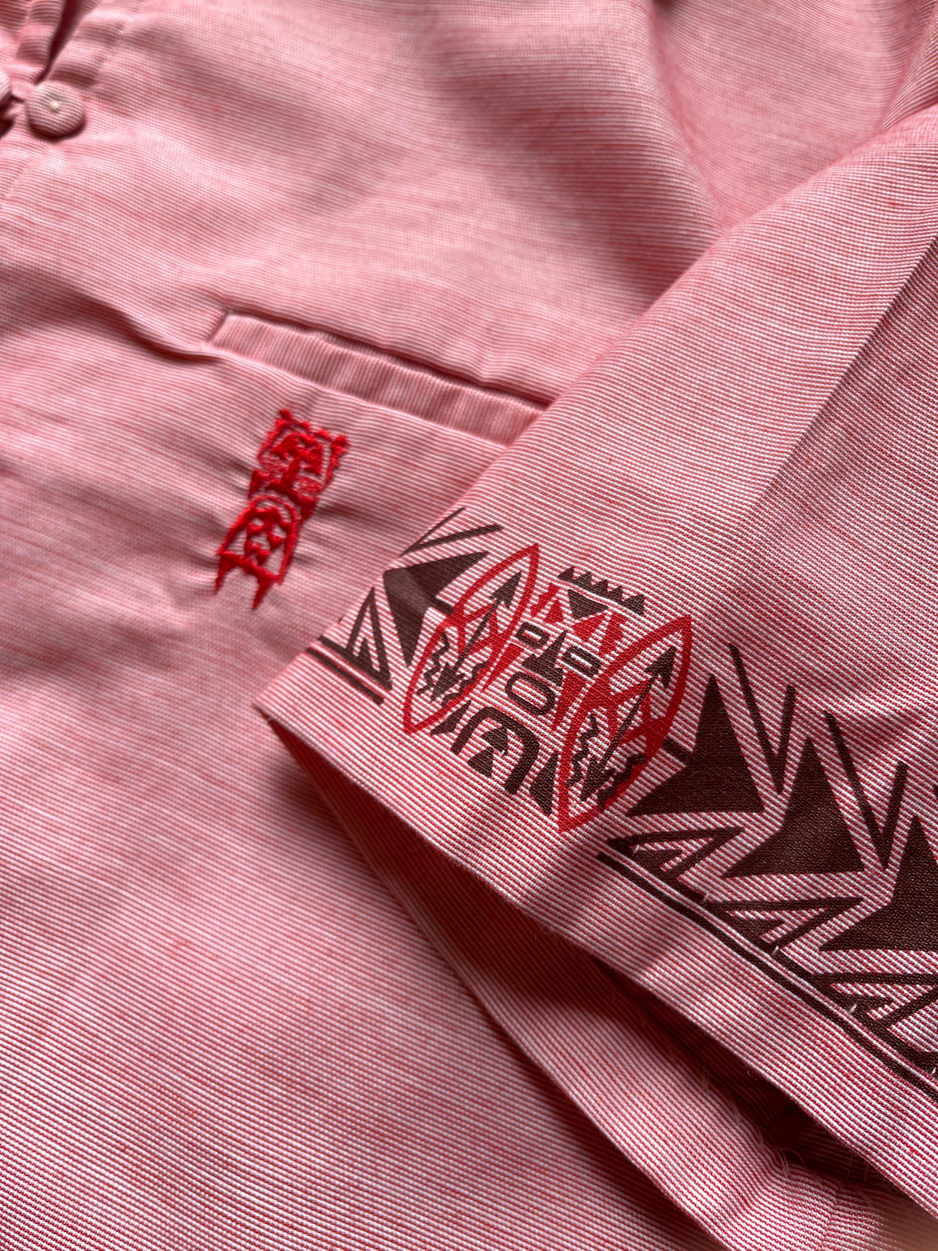 左胸に刺繍のワンポイント、袖口にトライバル柄のプリントデザインの入った珍しいデザインです。