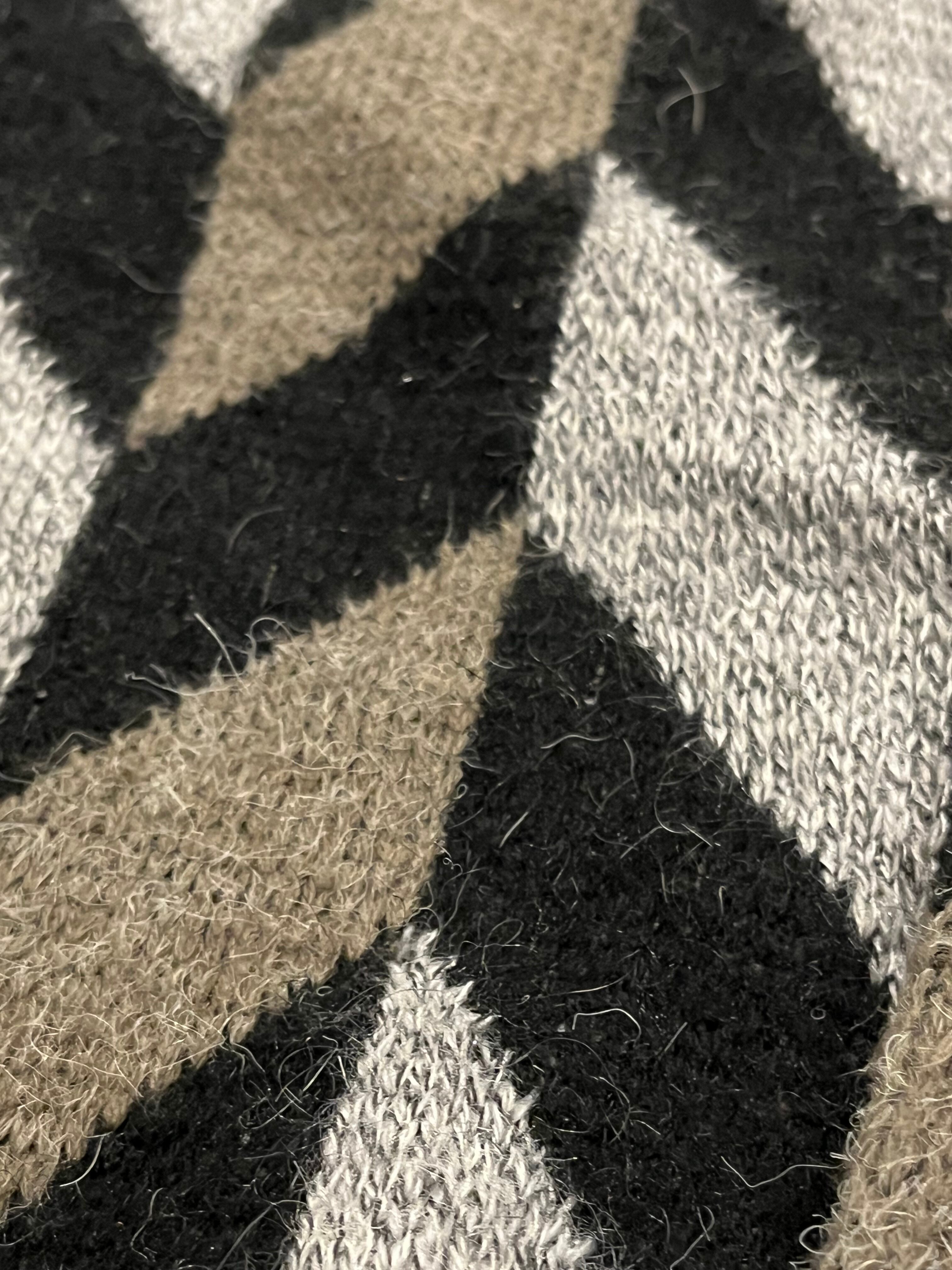 秋冬のレイヤードスタイリングの挟みモノとしてデイリーに使い回しの効く総柄アイテムです。