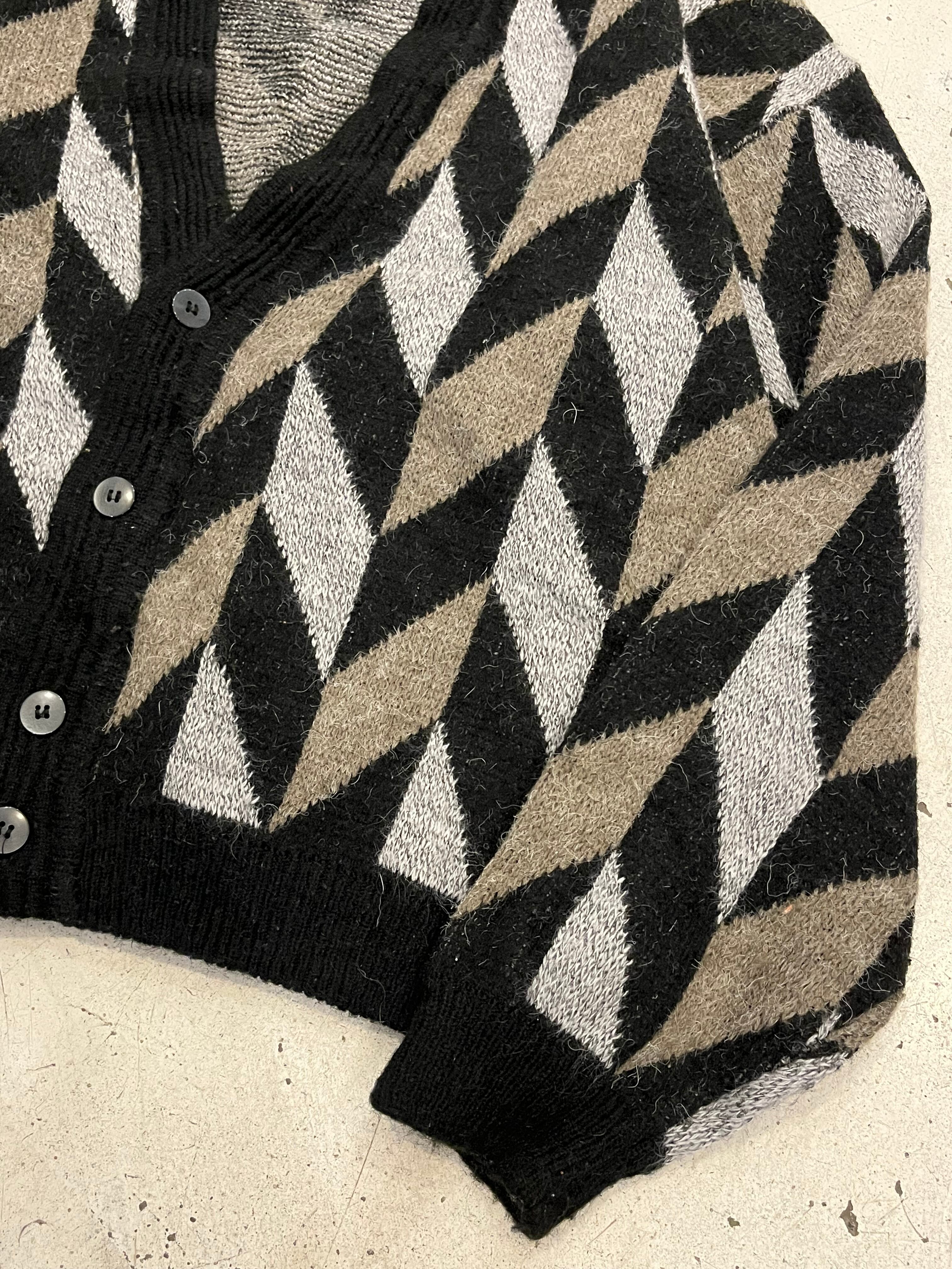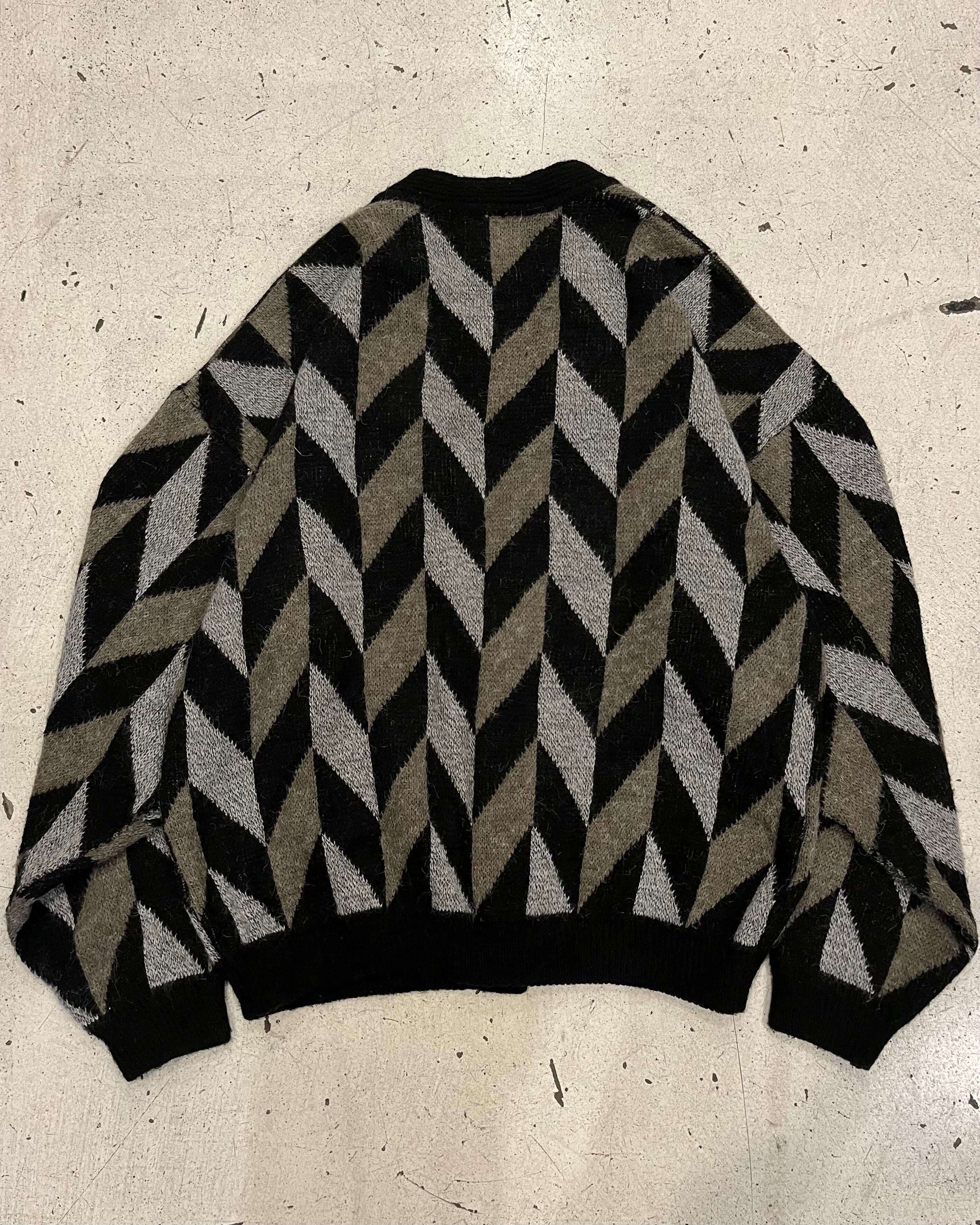 落ち着いた色味の総柄カーディガン、毛足の長いニットの素材感もポイントです。