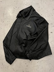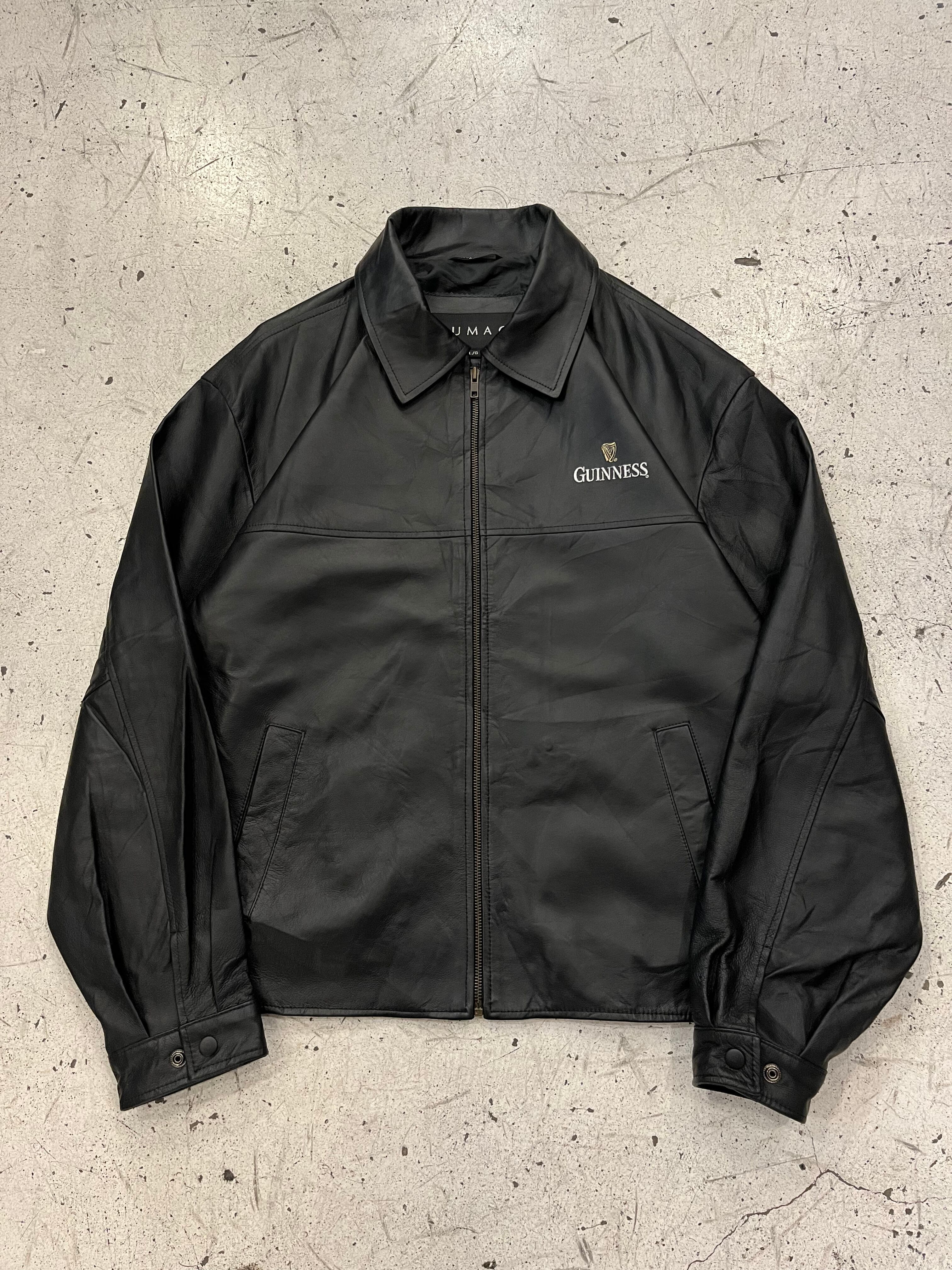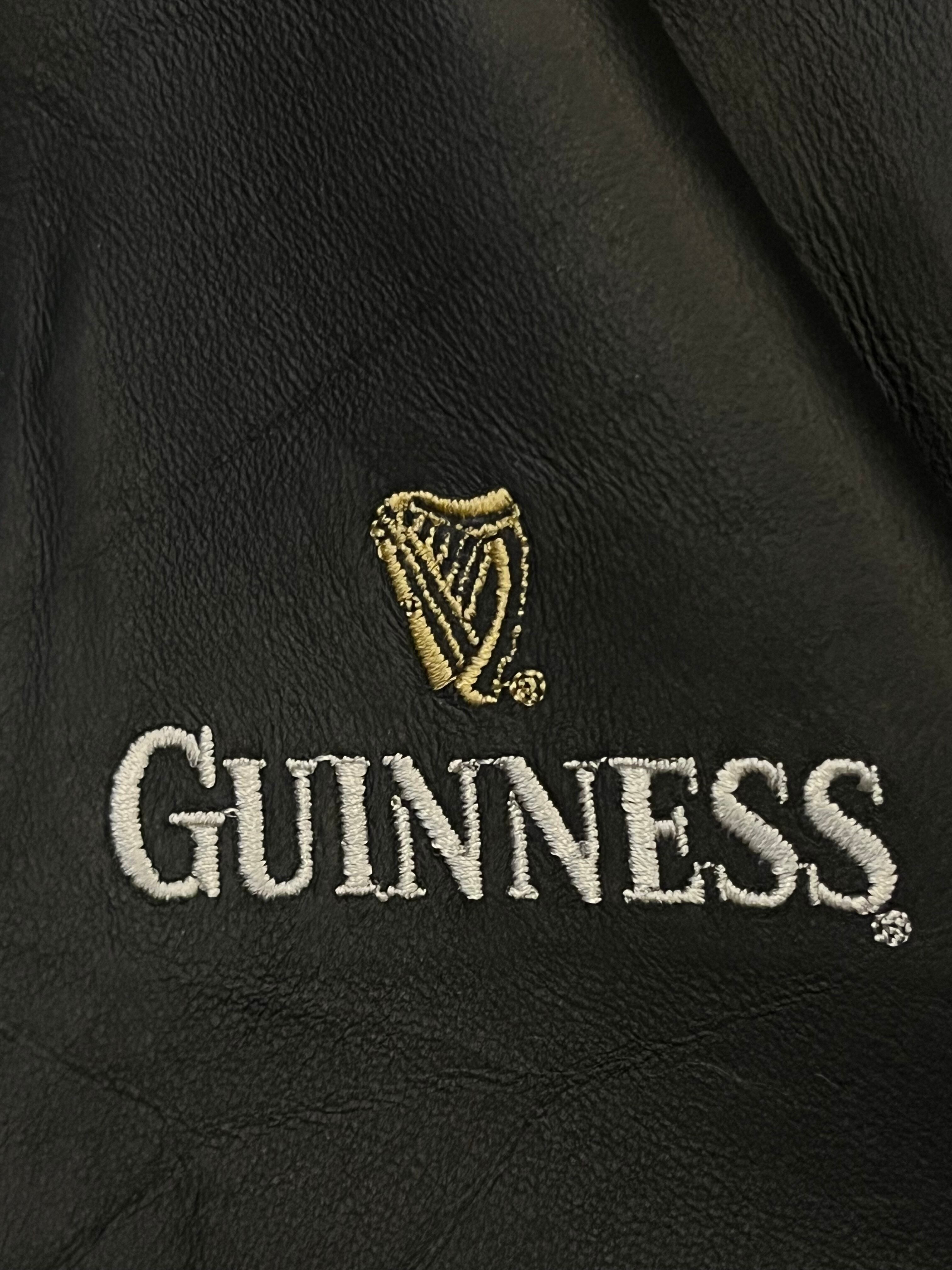 ギネスビールの刺繍デザインが左胸に入ったシンプルなデザインの黒のレザーブルゾンです。