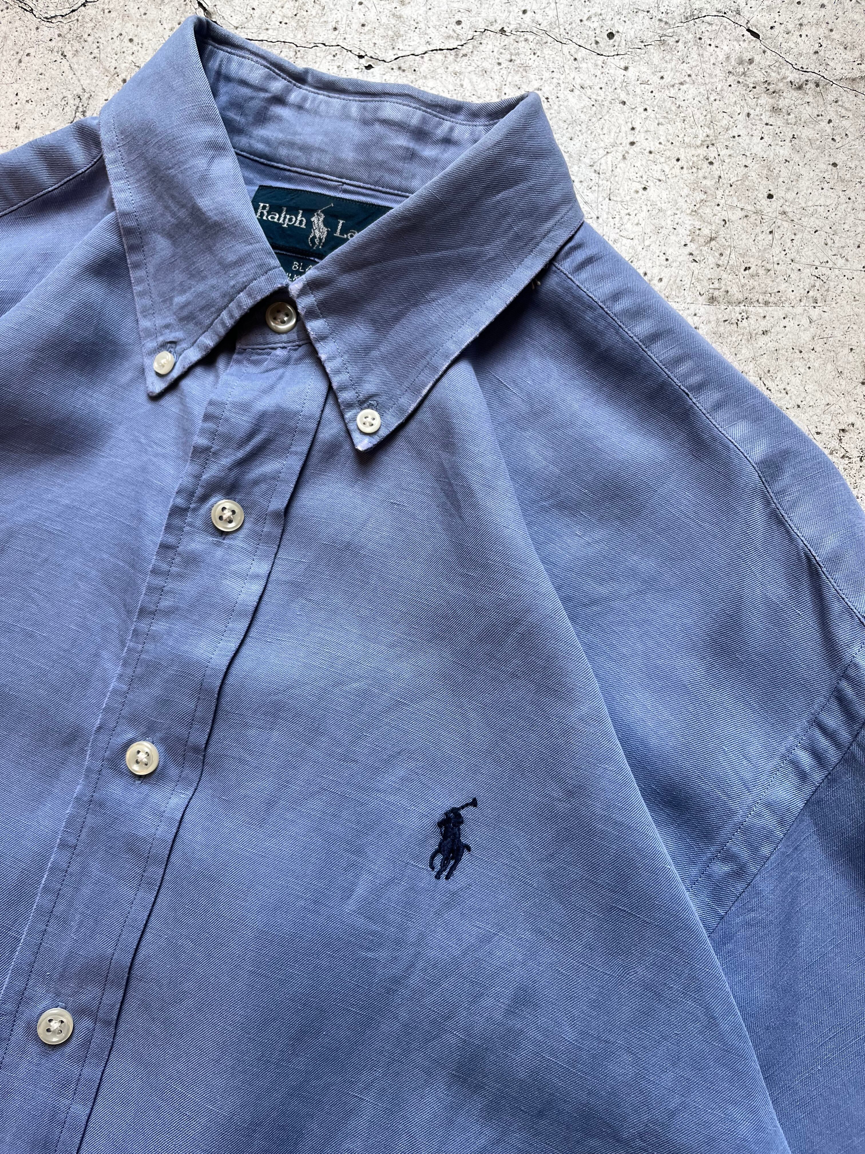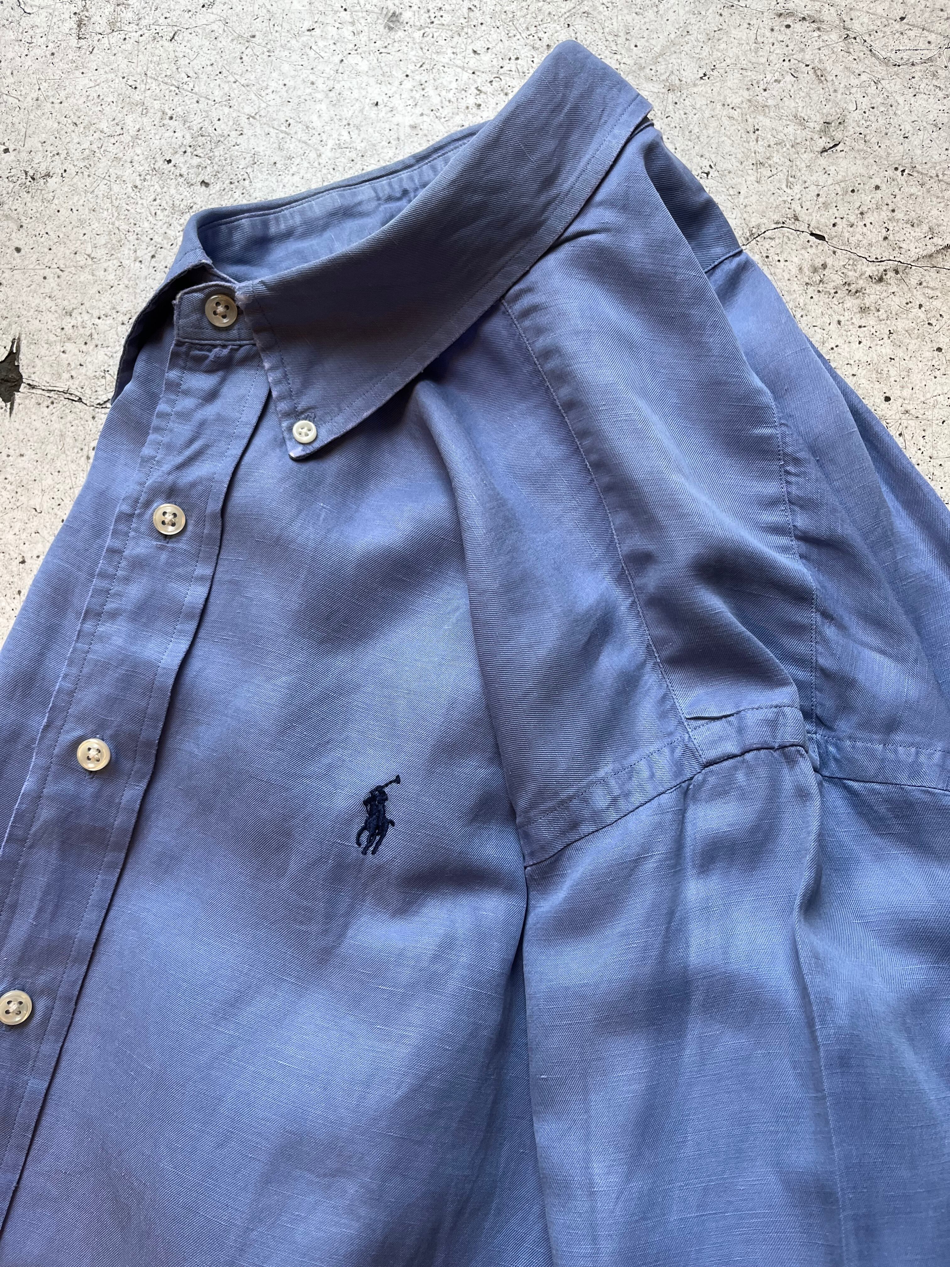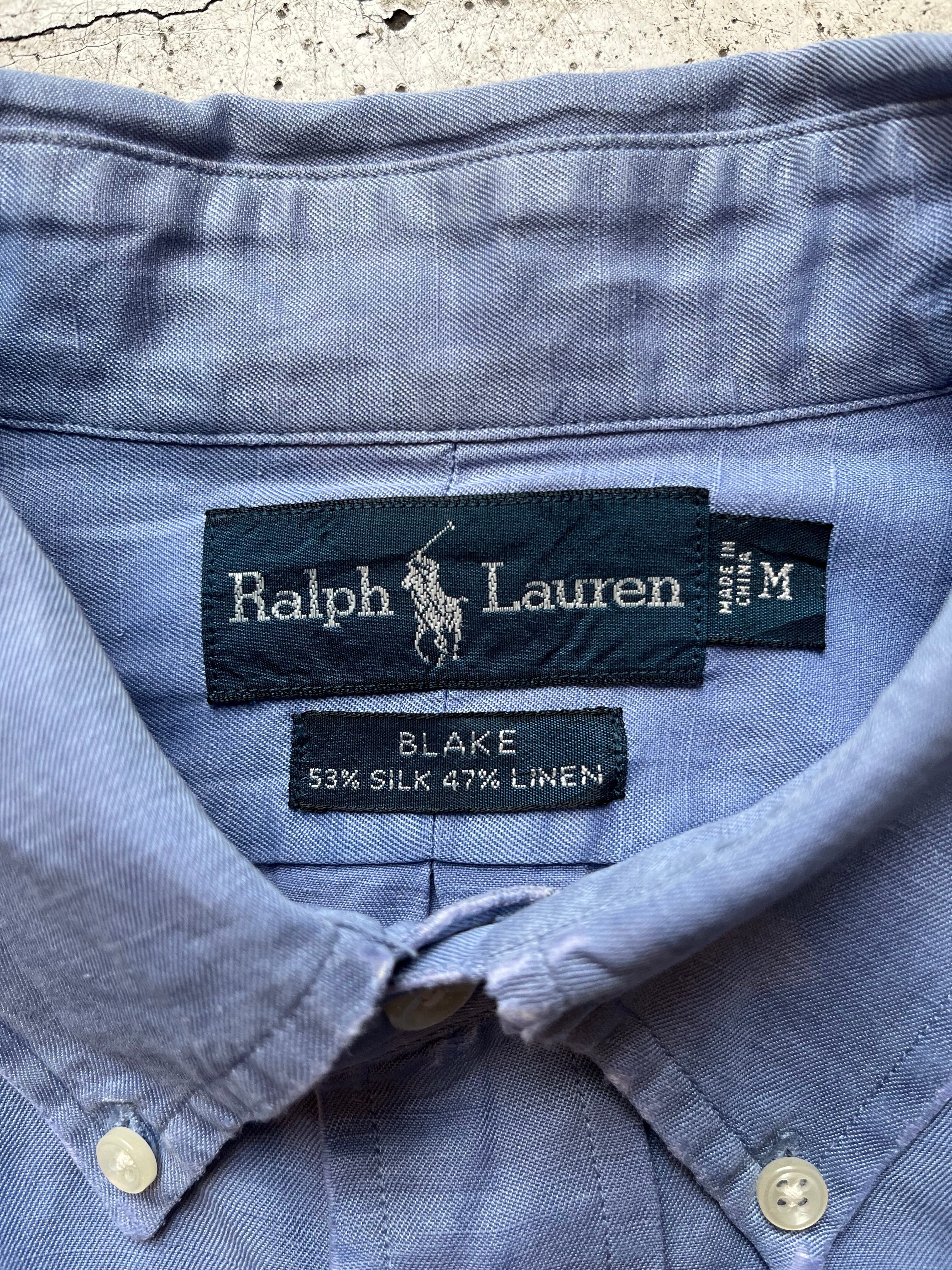 くすんだ色味の青とシルク特有の光沢感にリネン独特の抜け感が合わさった春夏シャツとして抜群な1着です。
