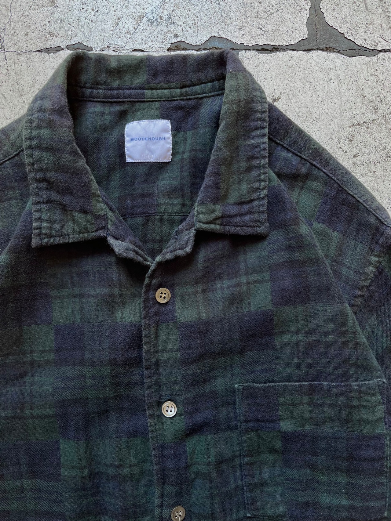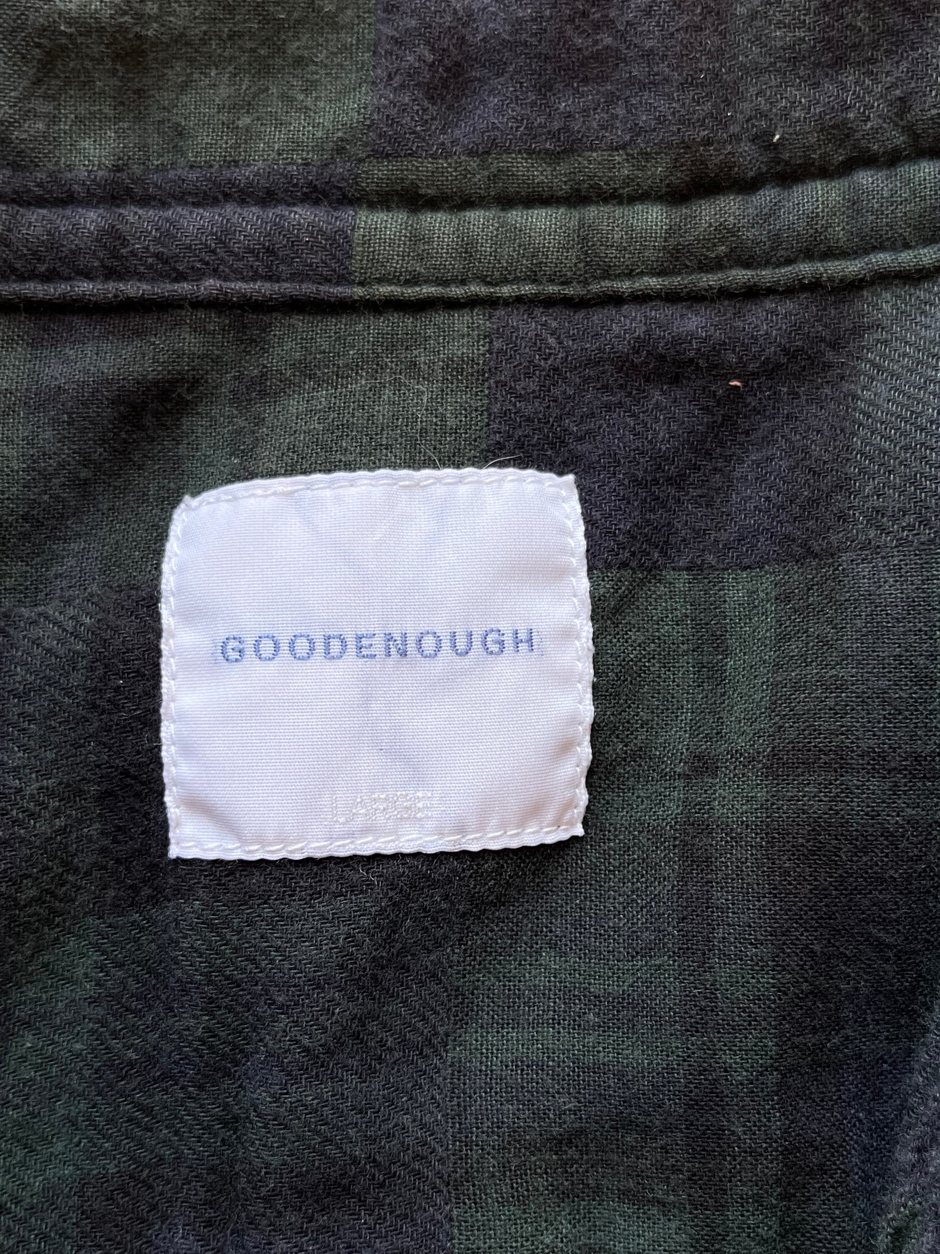 バックに見切れたブランドロゴグッドデザインとグッドイナフらしいチェック配色が魅力的な一枚です。