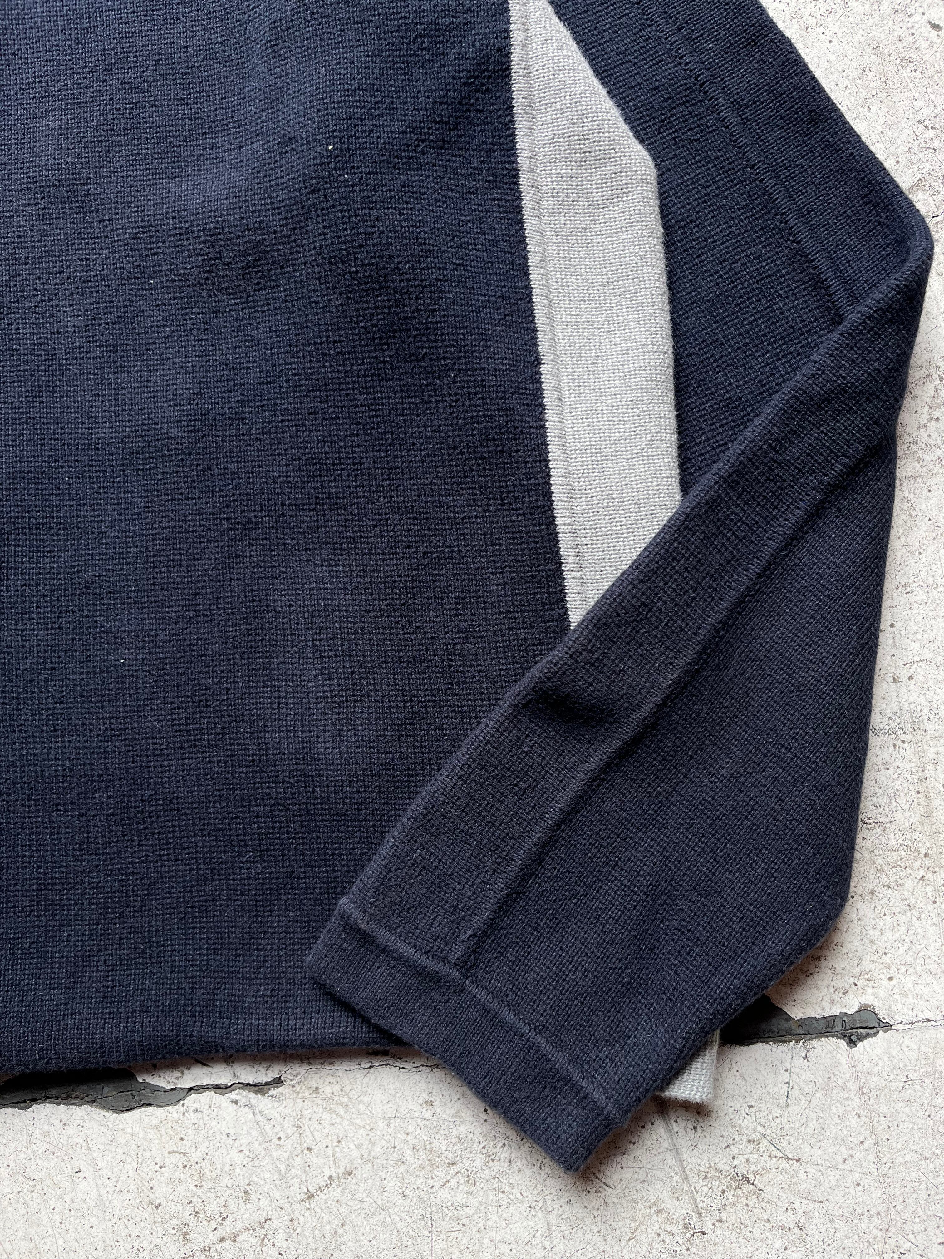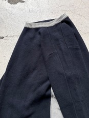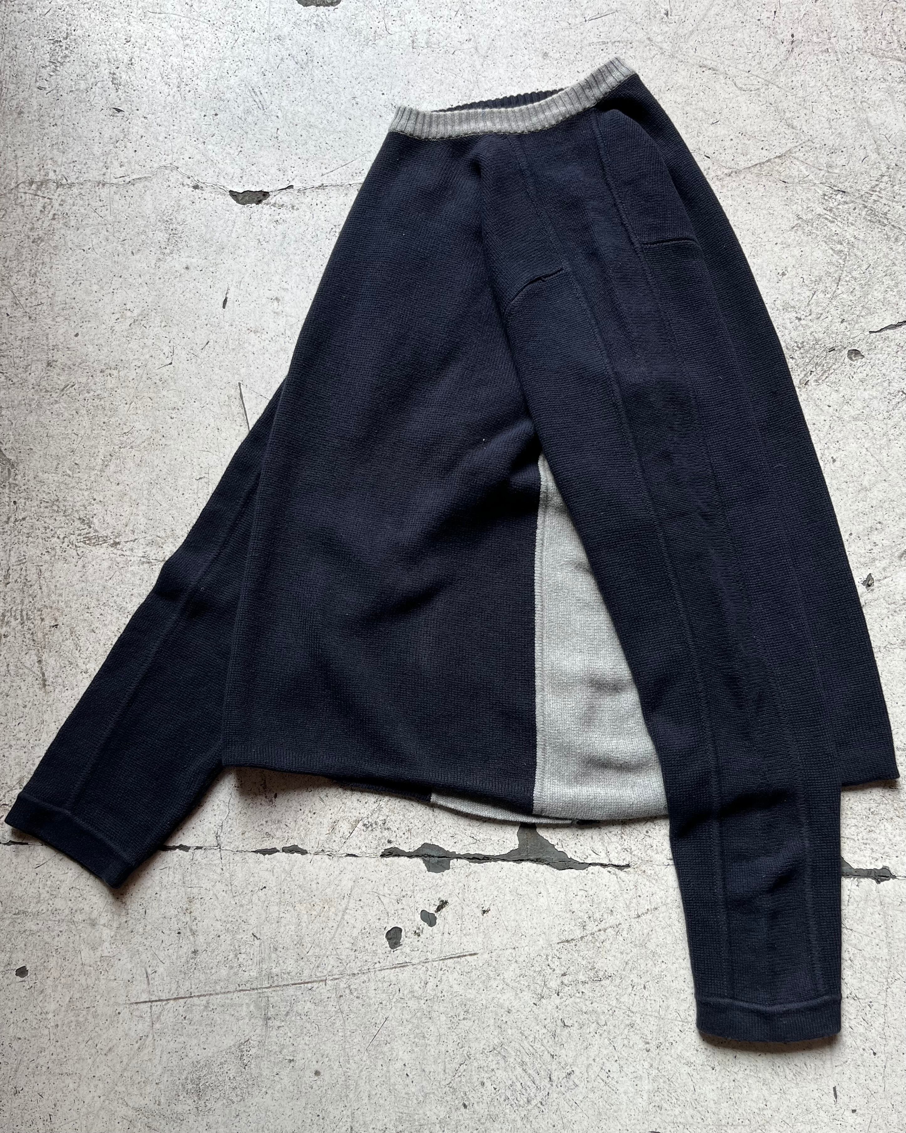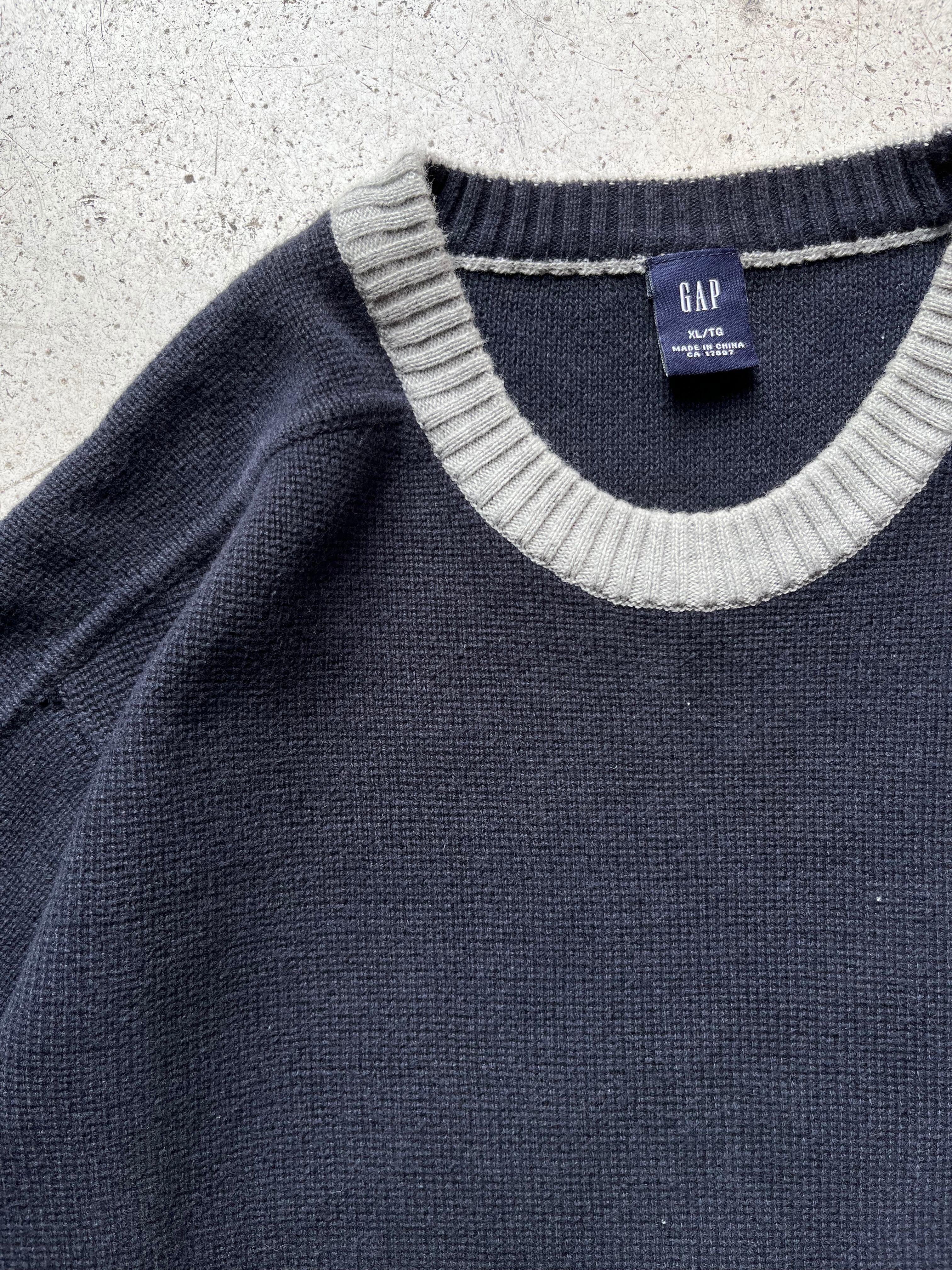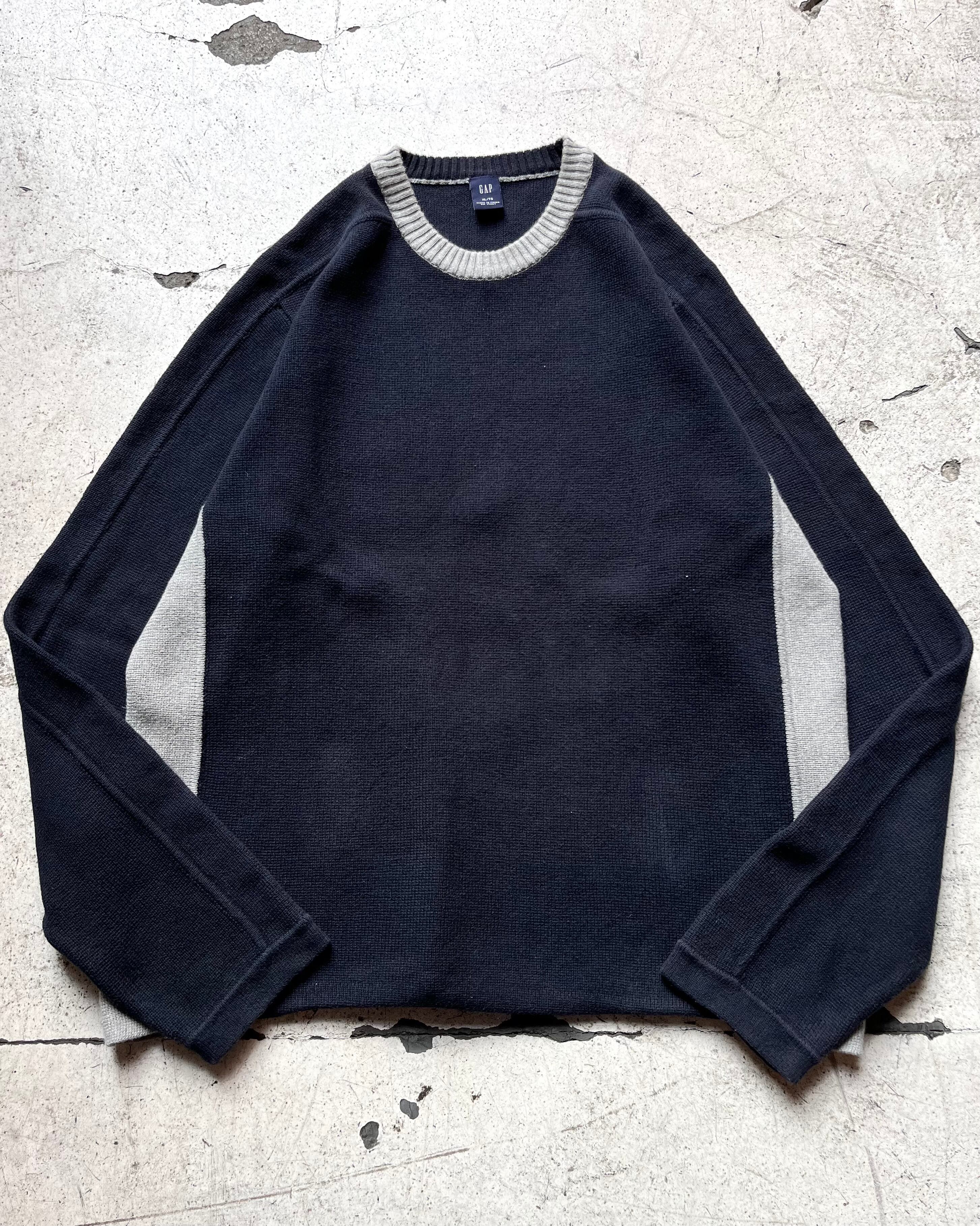 襟元、サイドにグレーの切り替えが、リバースのようなデザインのニットカットソー