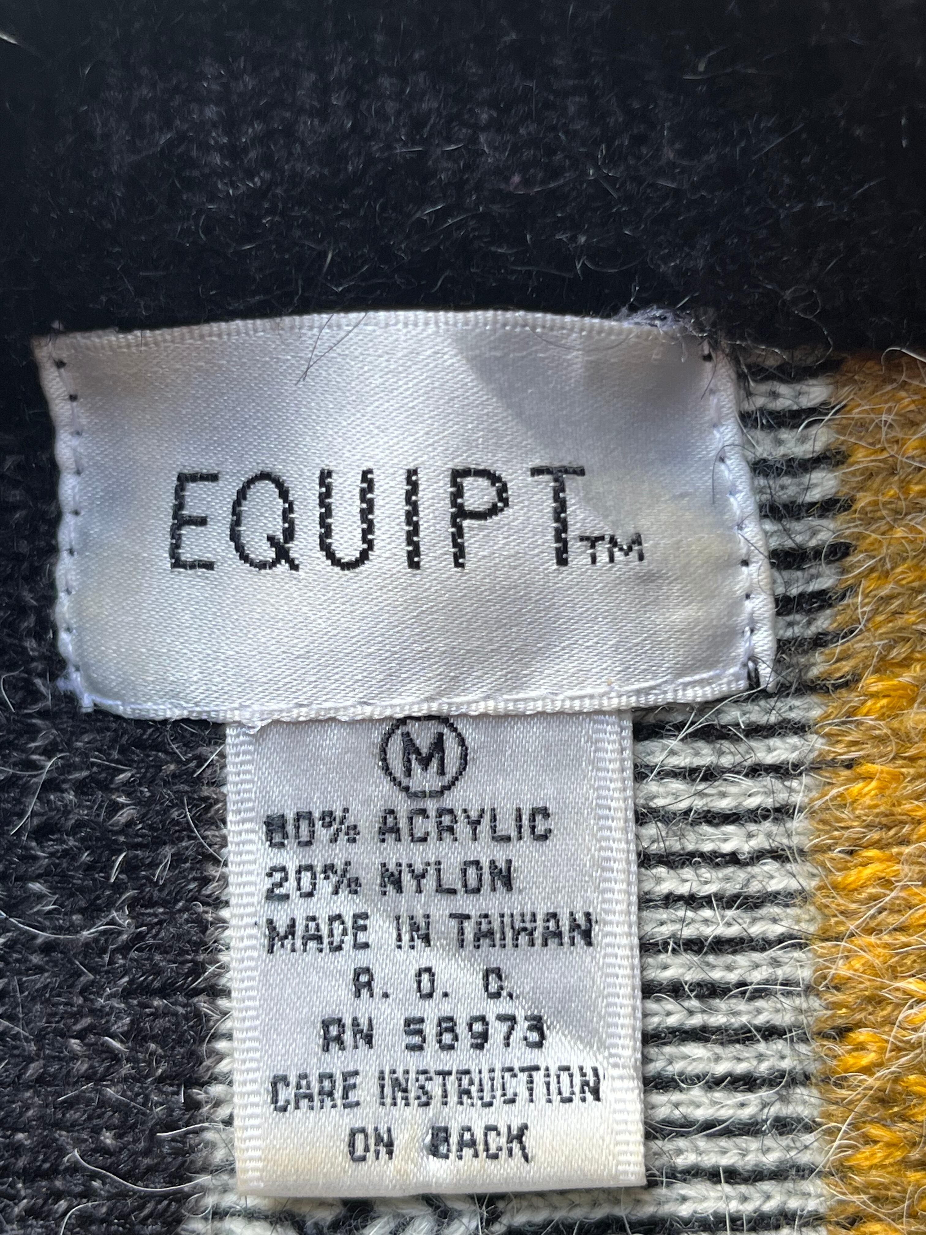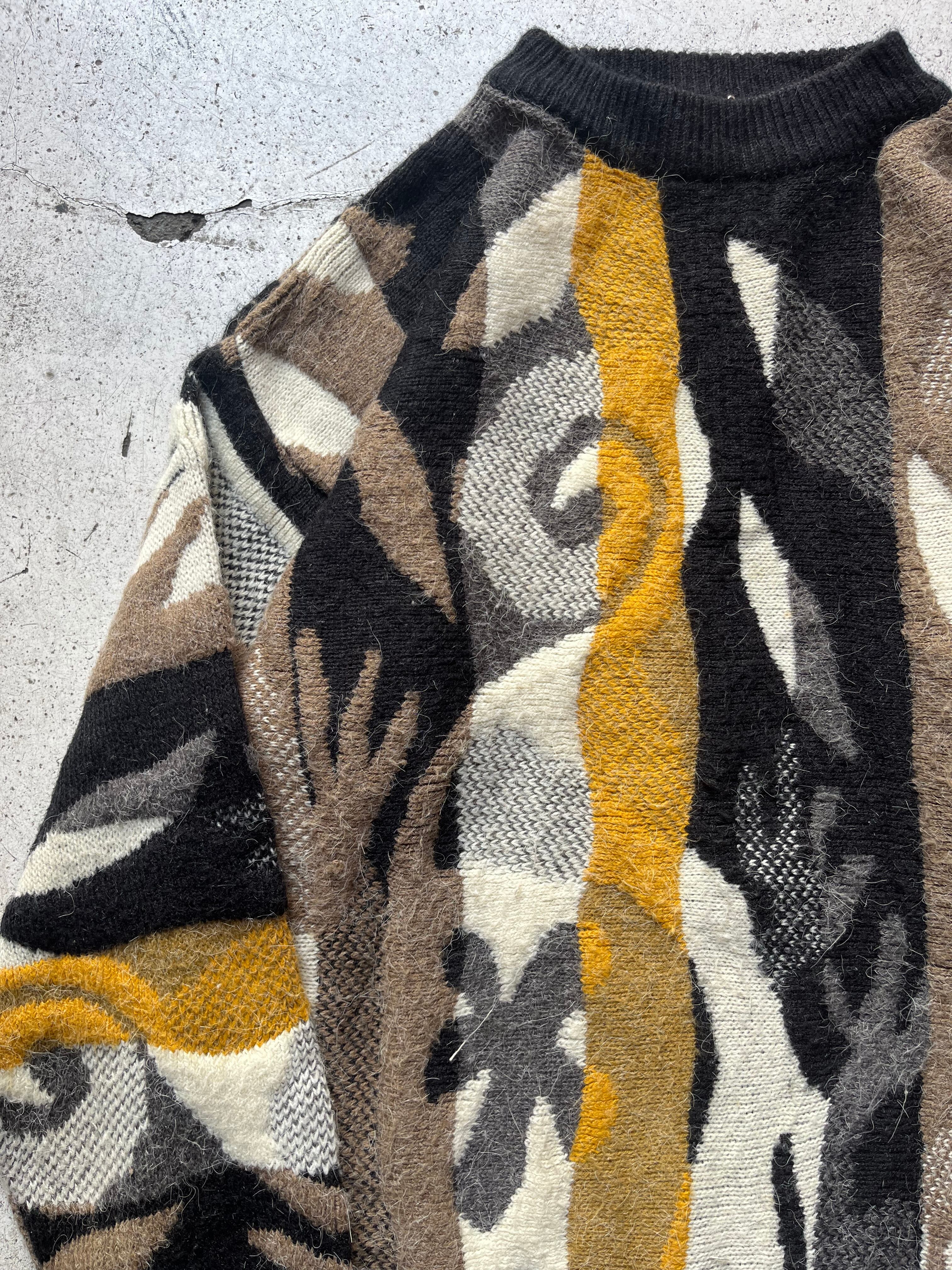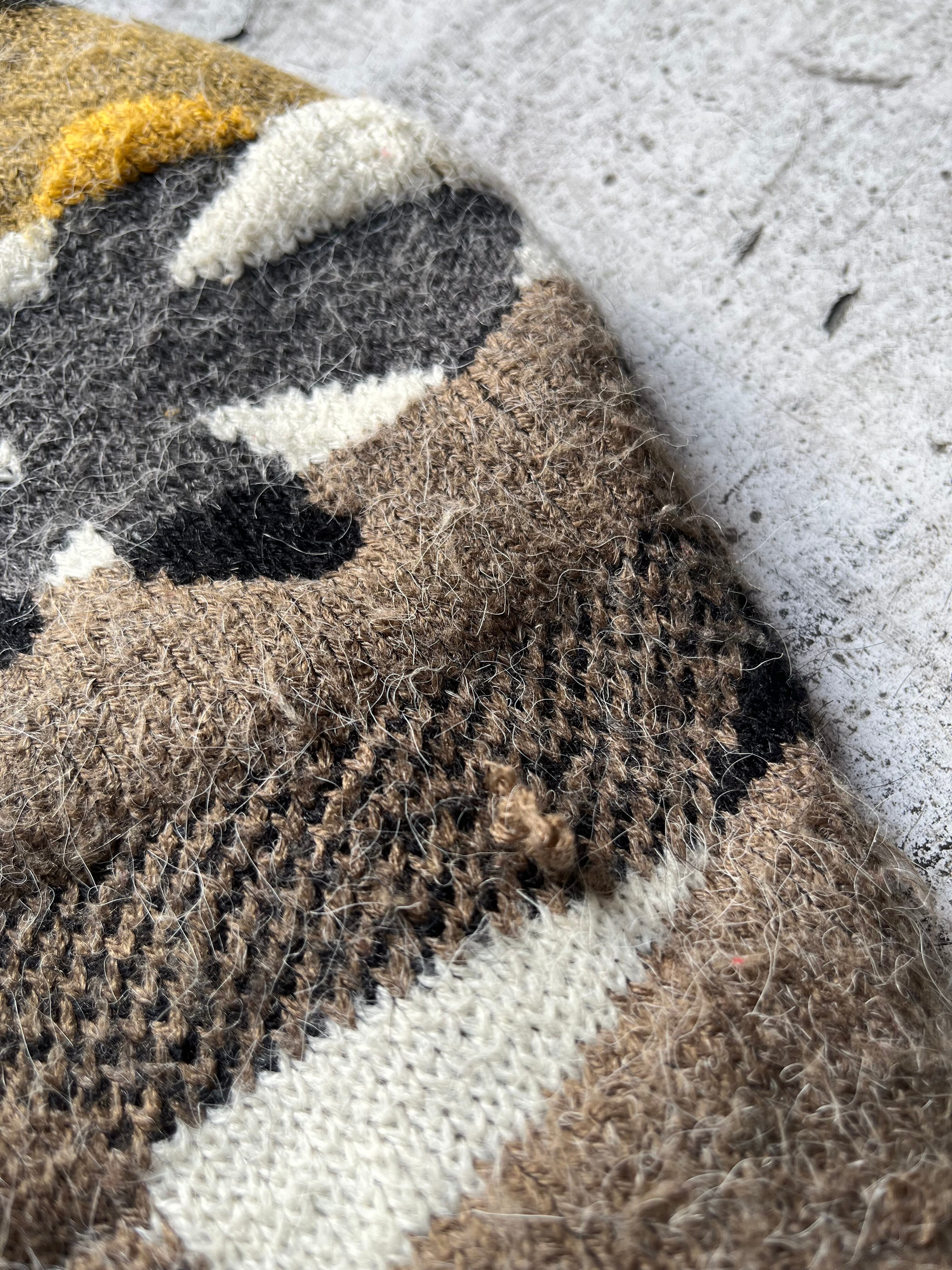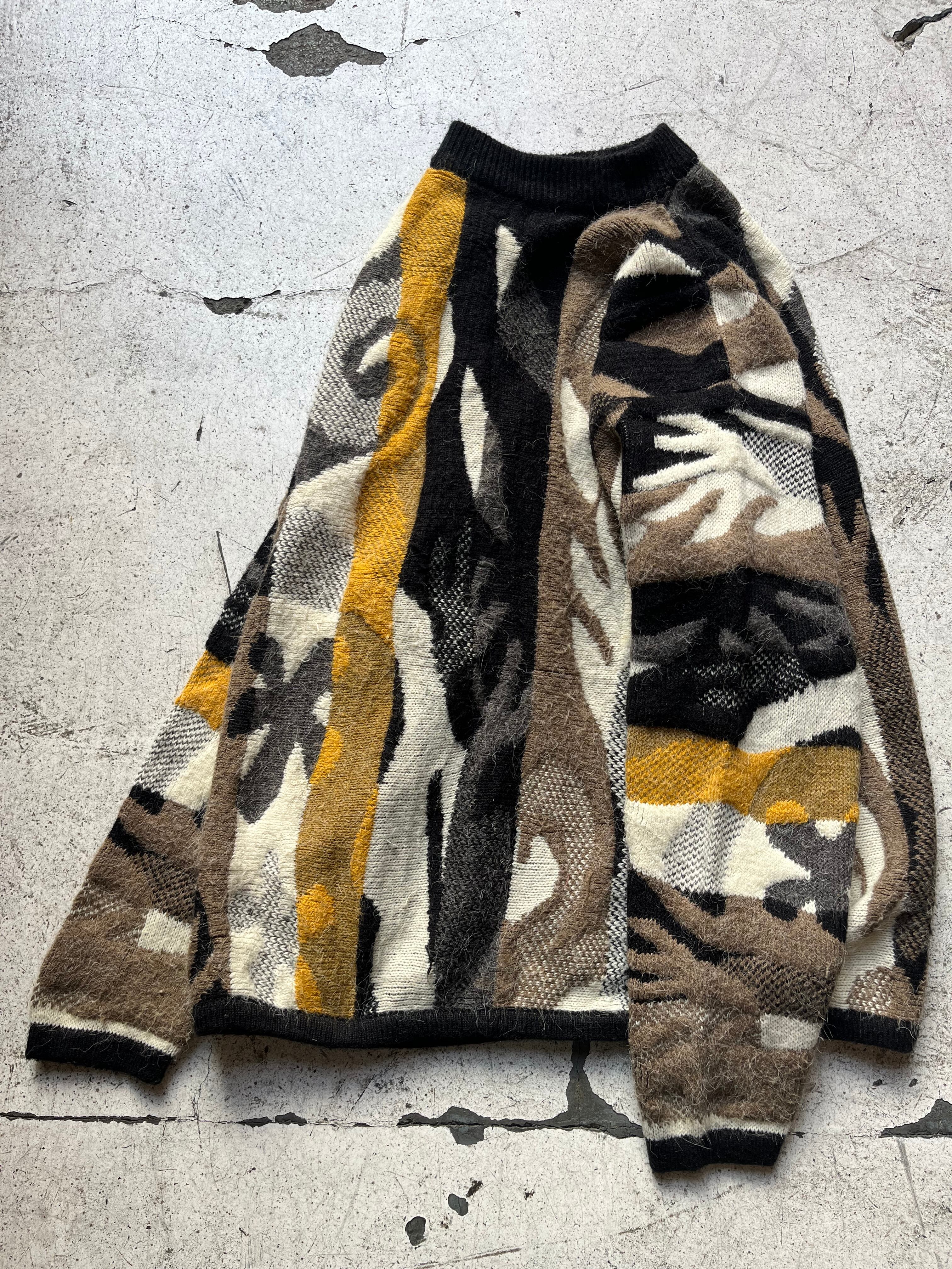 毛足長めな生地感と落ち着いた配色の総柄ニット