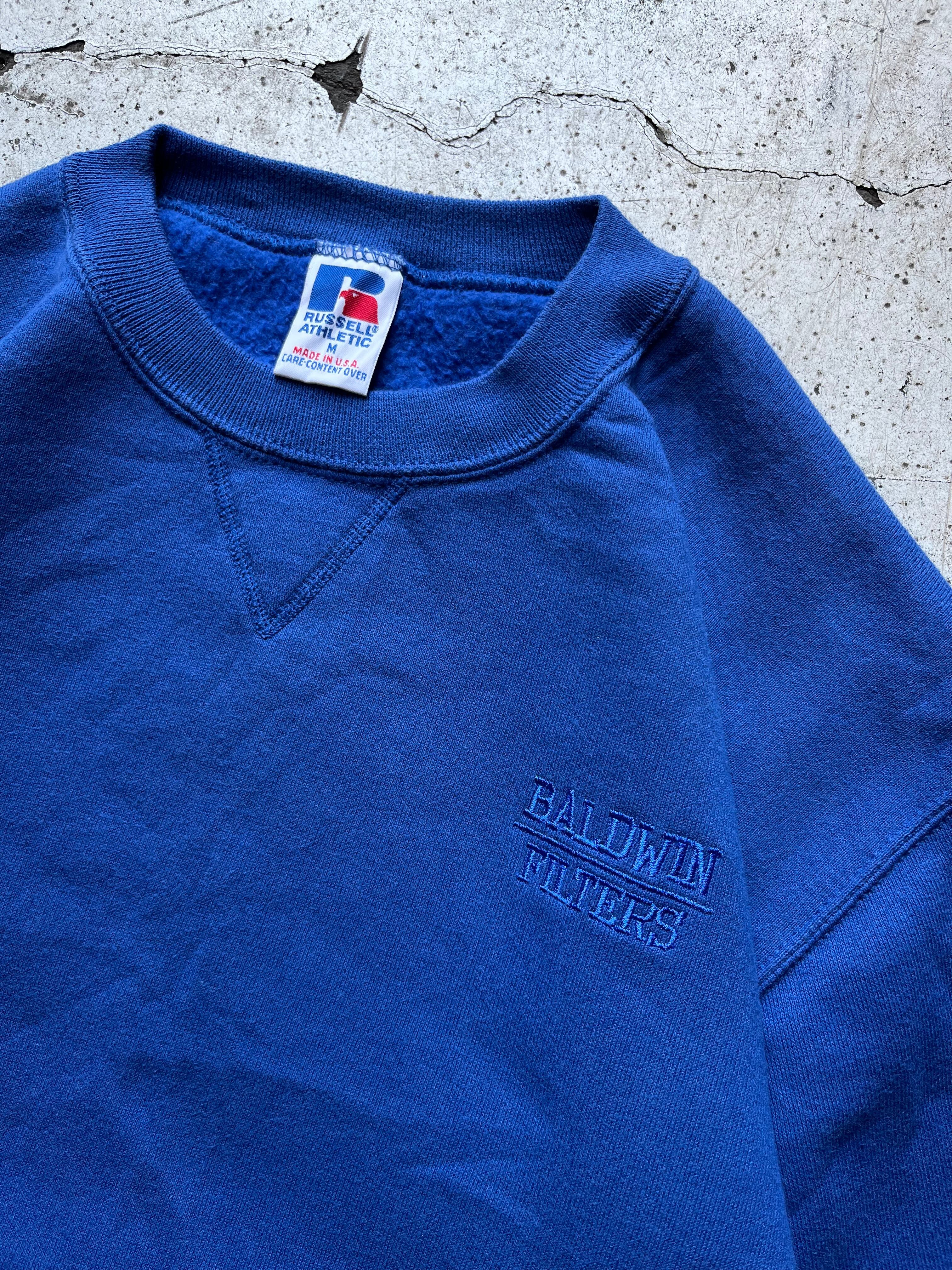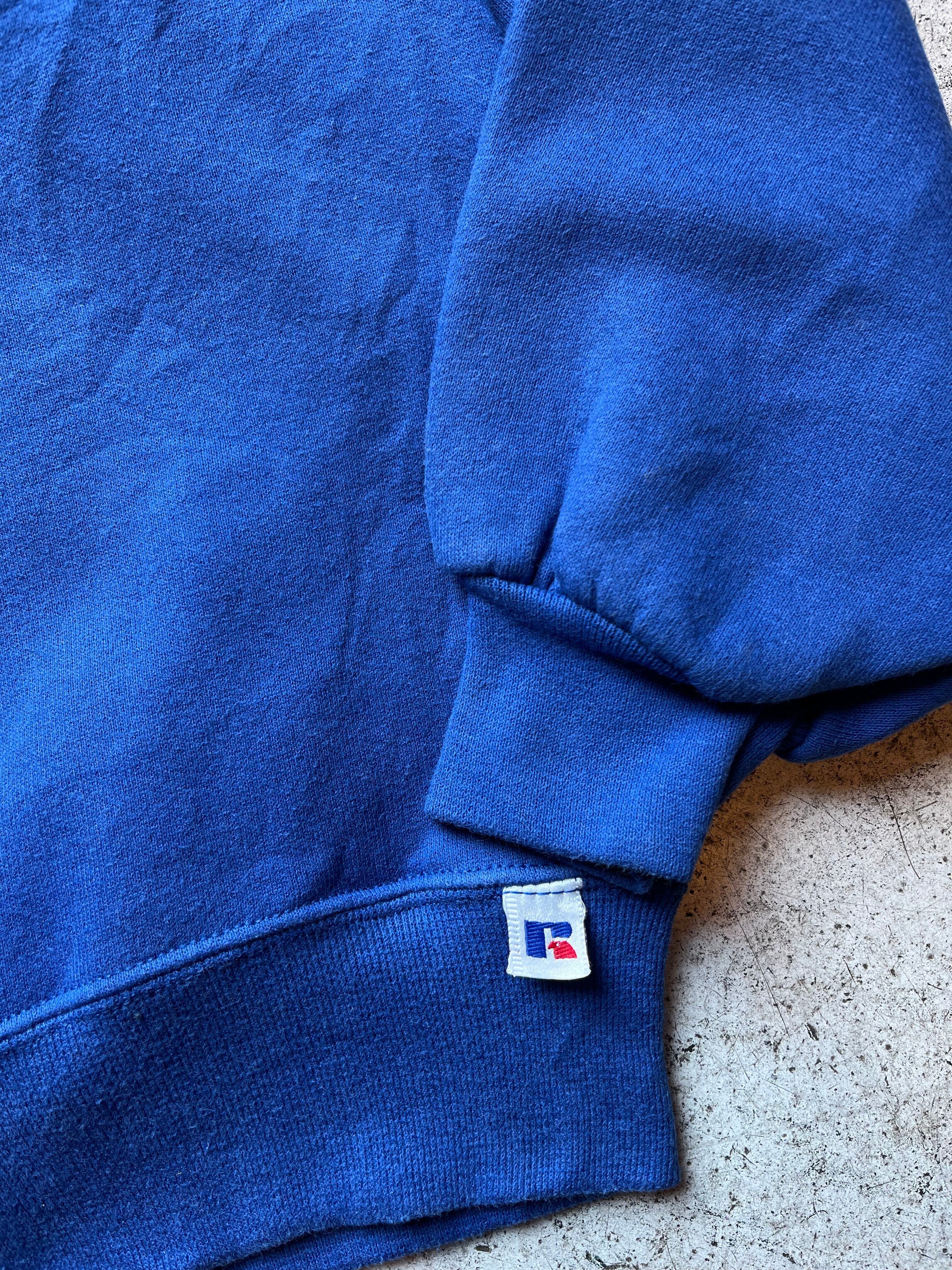 同色刺繍のワンポイントデザイン入りのRussellのフロントVスウェット。
