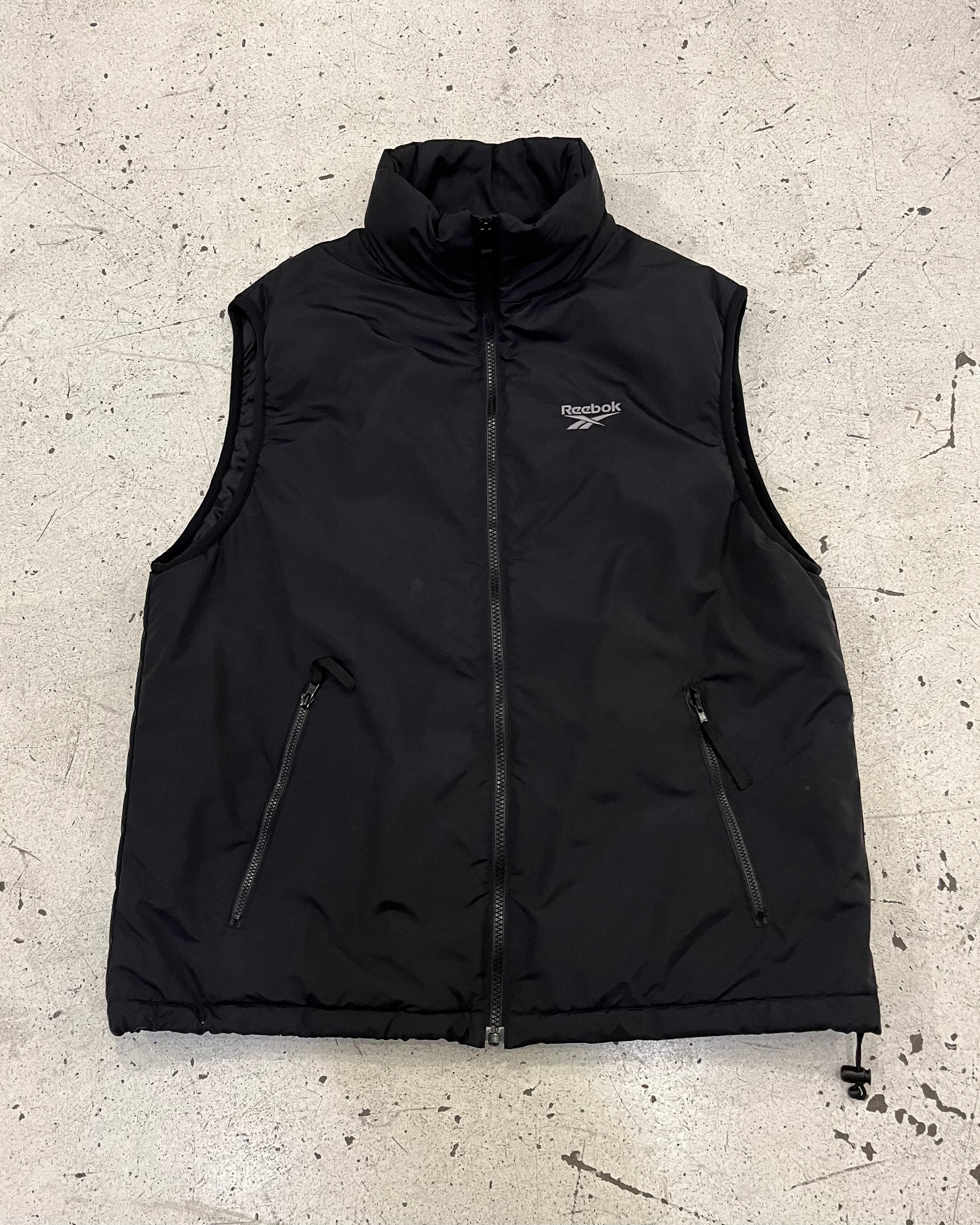 Reebokのロゴデザインが左胸に入ったブラックの中綿ベスト